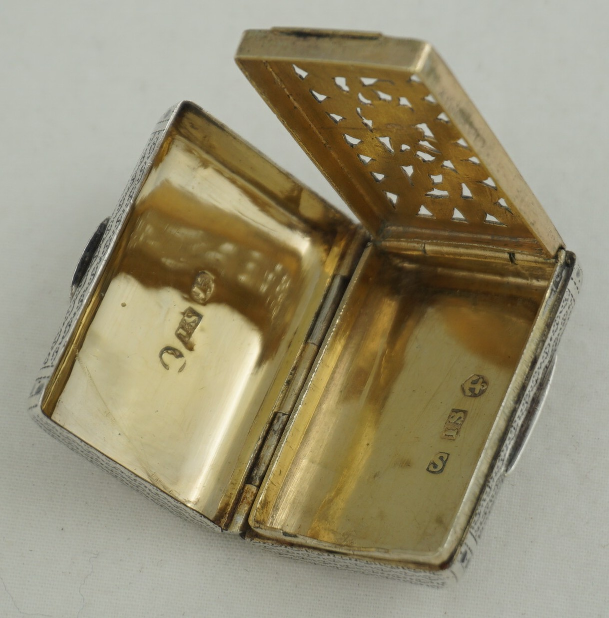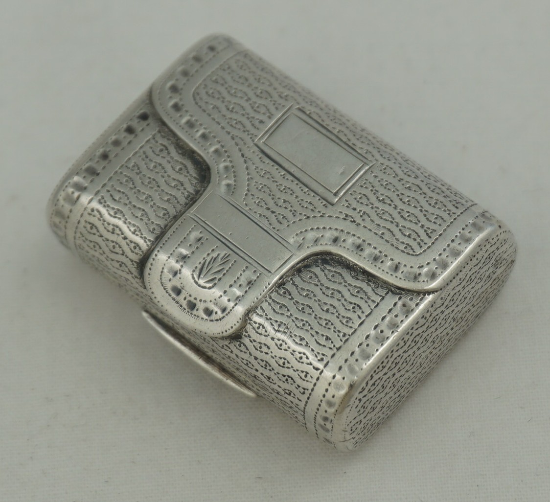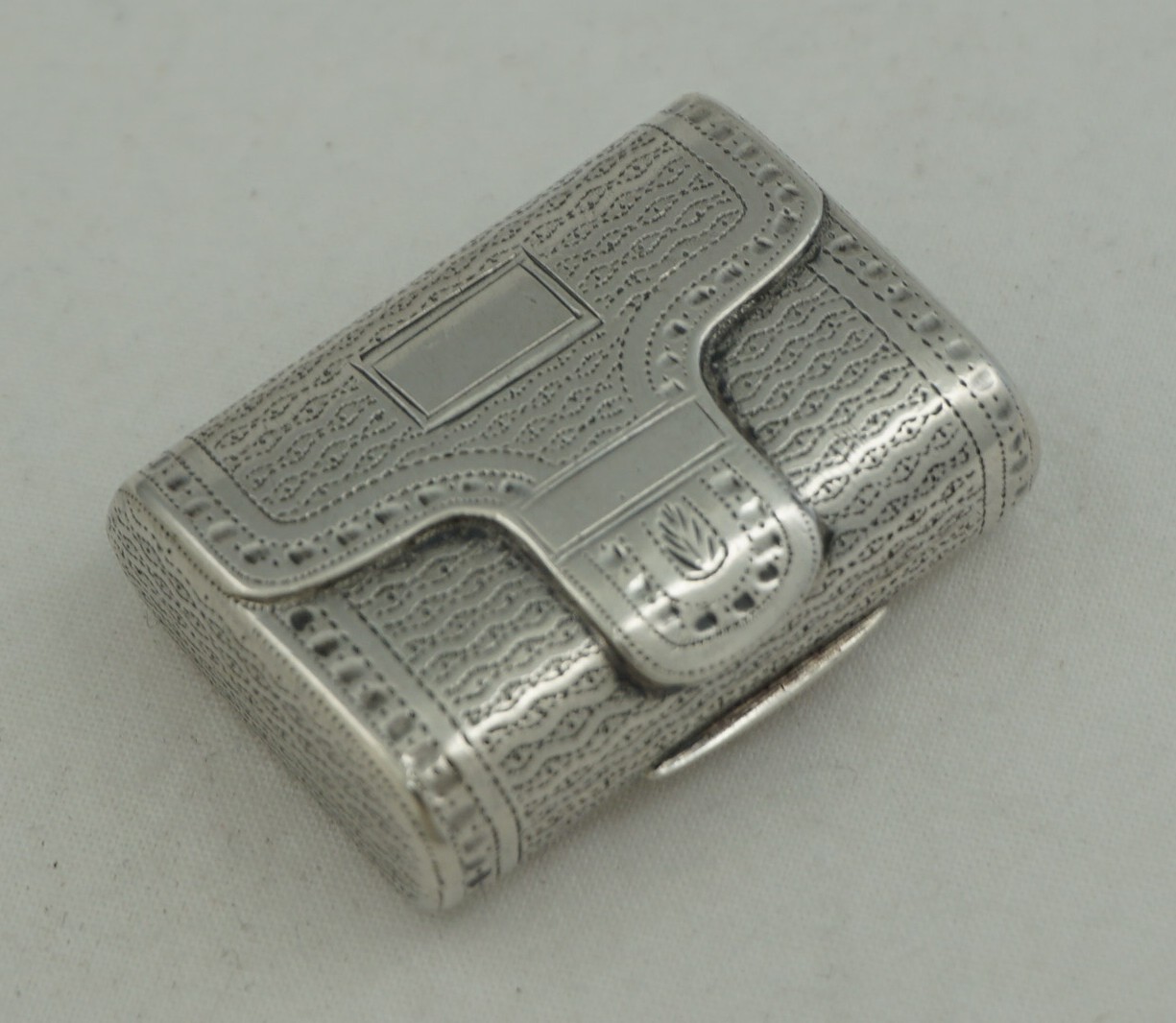 | DESCRIPTION | Unusual Georgian solid sterling silver satchel form vinaigrette with a fully gilded interior. |