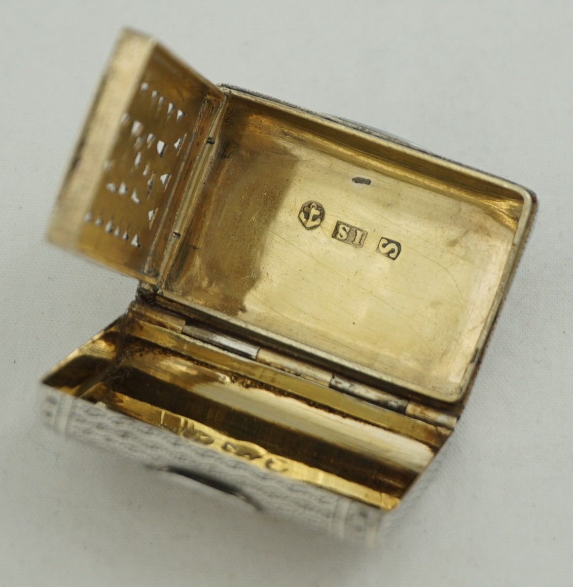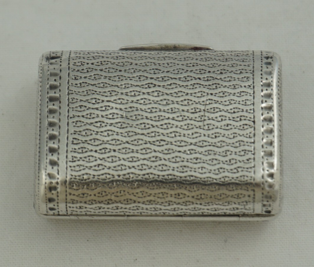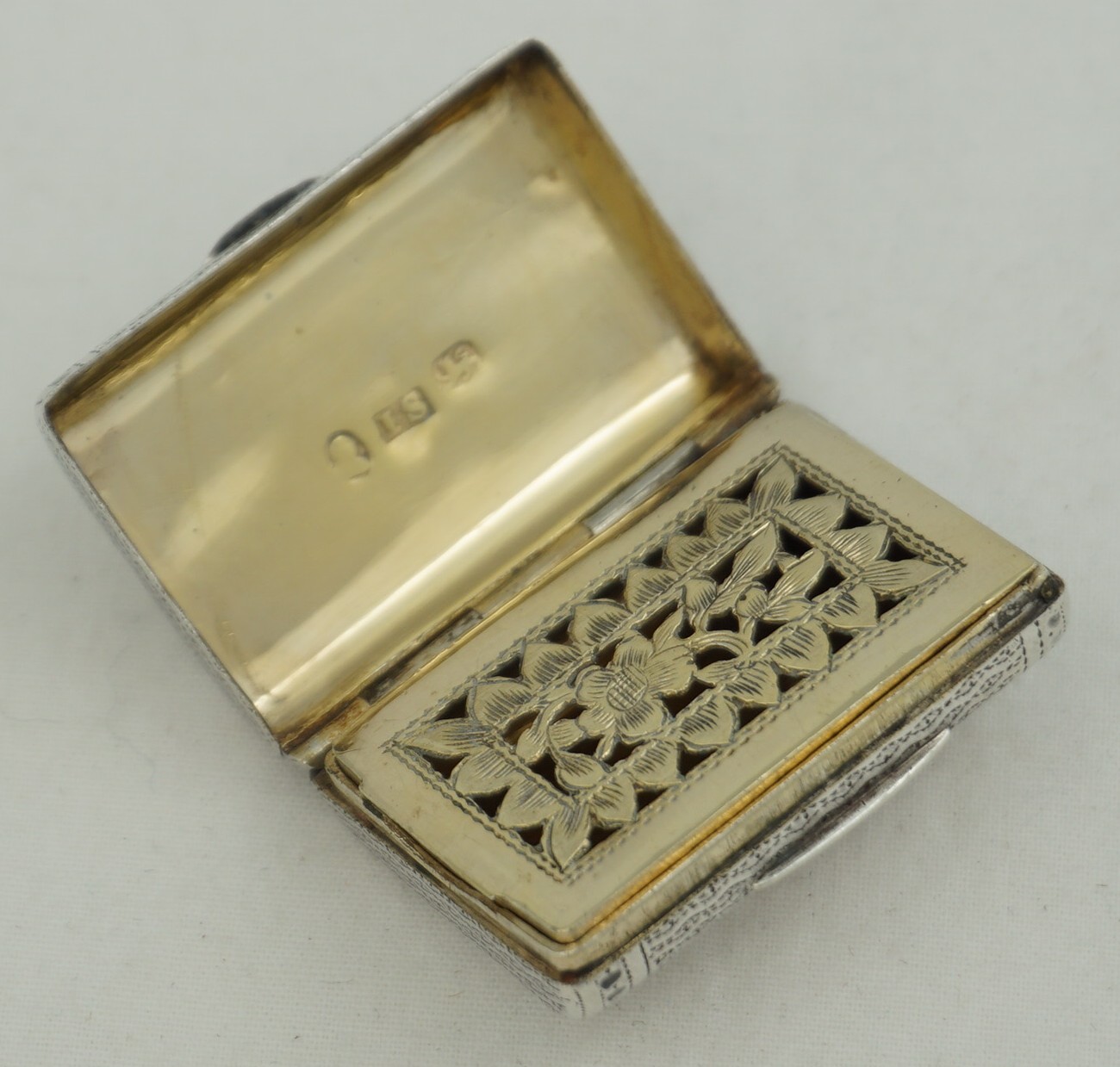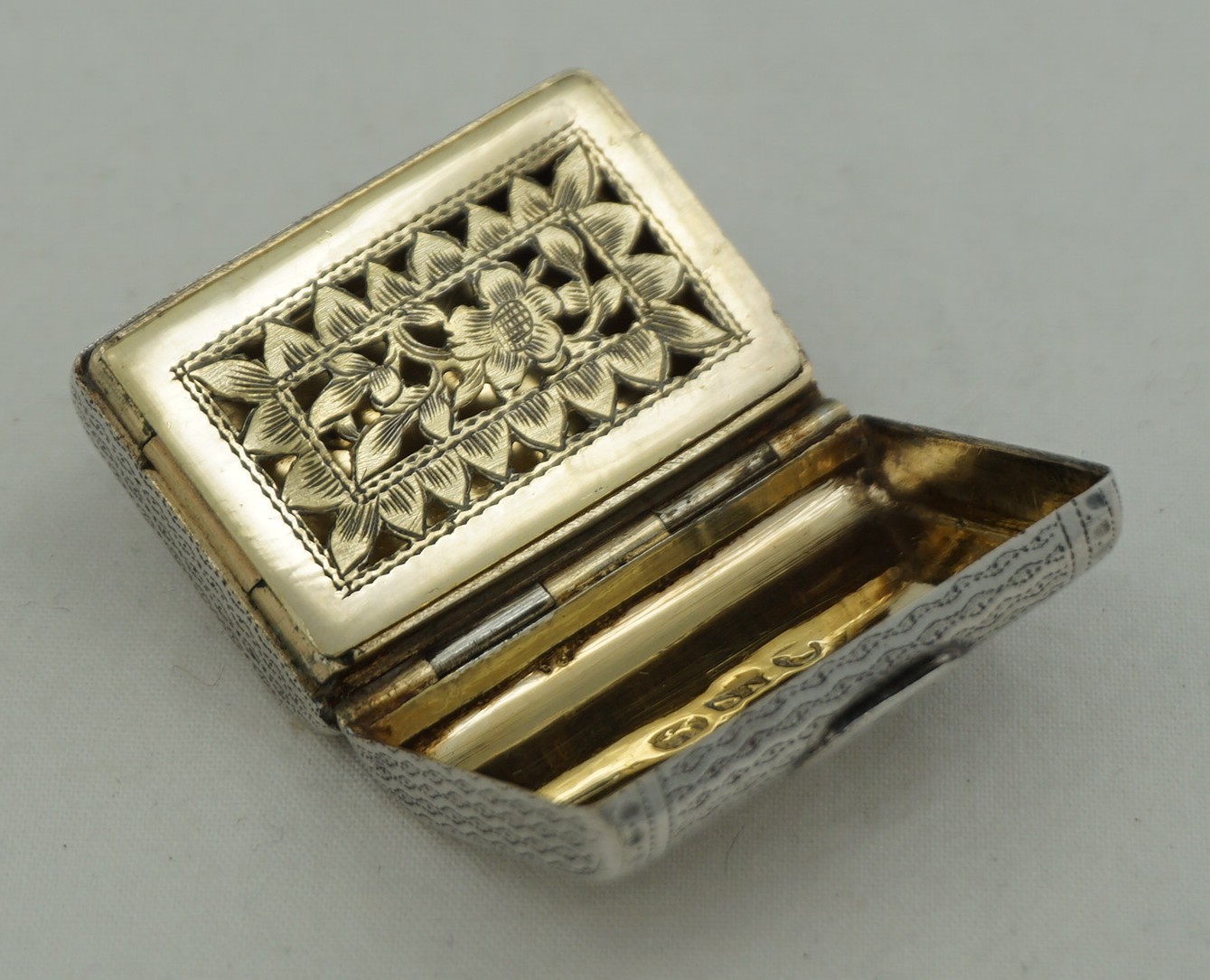 | DESCRIPTION | Unusual Georgian solid sterling silver satchel form vinaigrette with a fully gilded interior. |