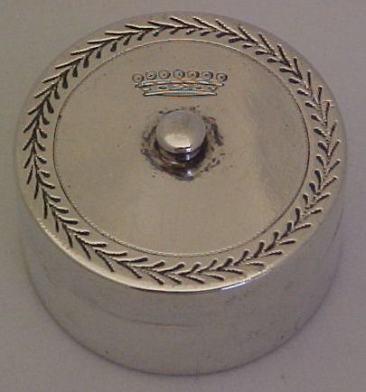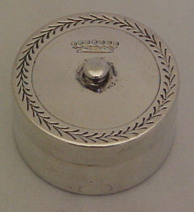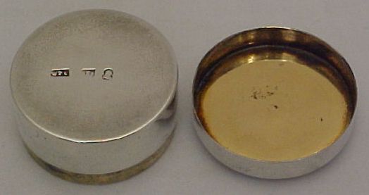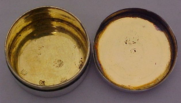 Georgian silver pill or patch box with a fully gilded interior, the lid engraved with a Viscounts coronet. | ||