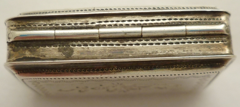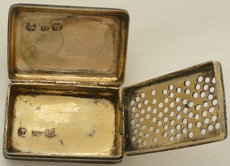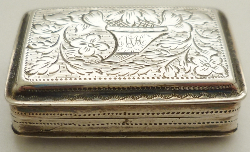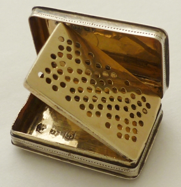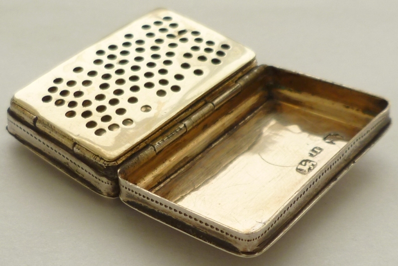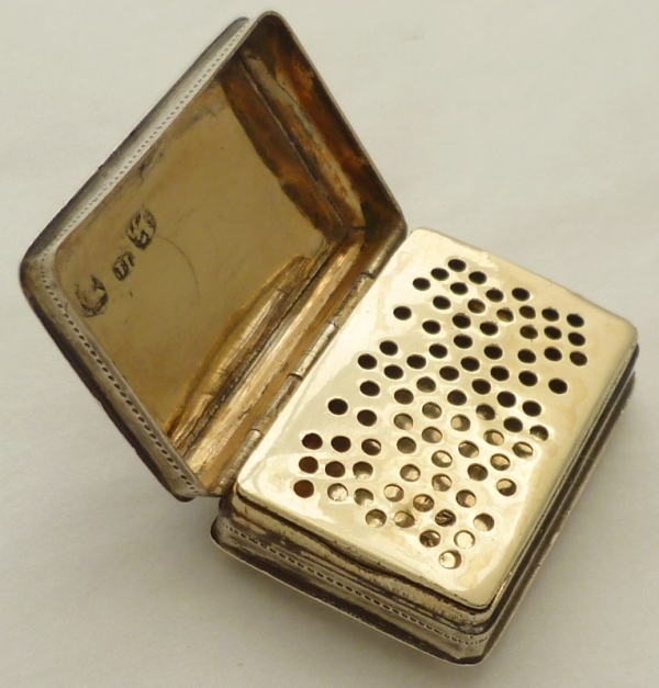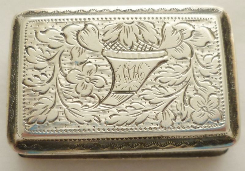 Georgian silver vinaigrette with floral and foliate engraved decoration including a cornucopia to the lid initial engraved 'MH'. Fully gilded interior with a hinged grille, simply hole pierced. Correctly hallmarked throughout plus a partially pierced lion passant to the grill. |