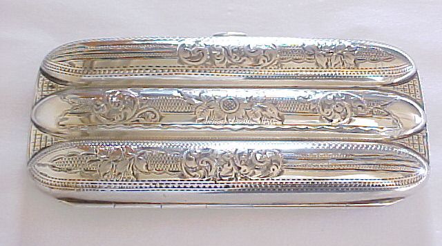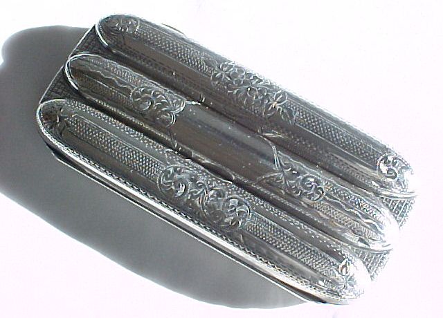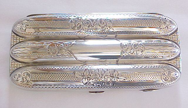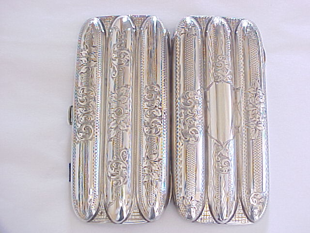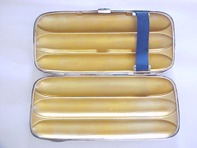 Finest quality Edwardian silver triple cigar case with engraved decoration, a blank shield shaped cartouche and a gilded interior. |