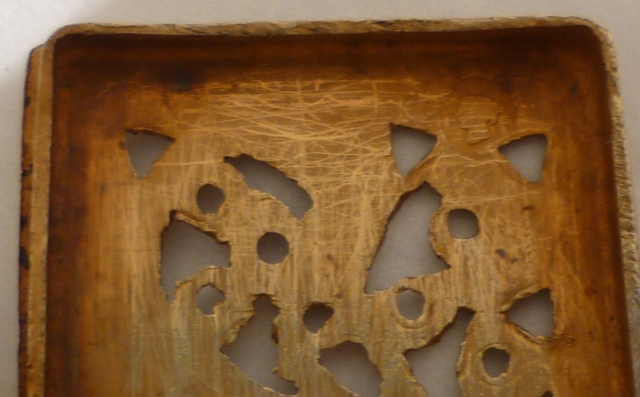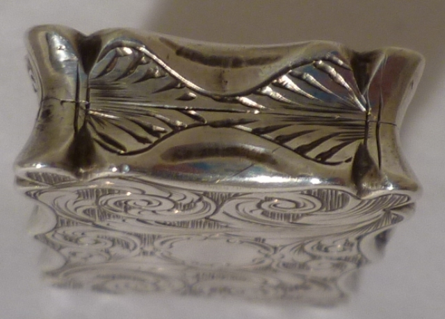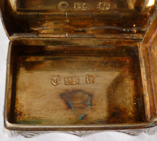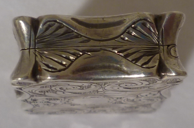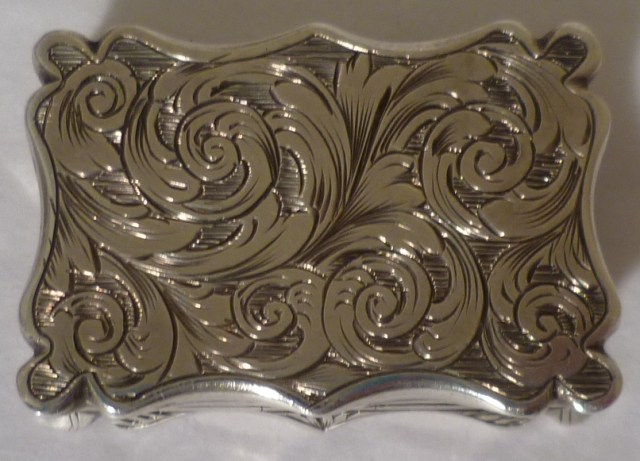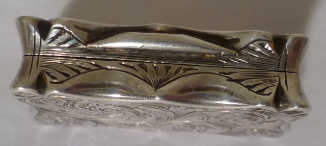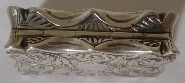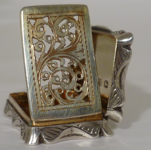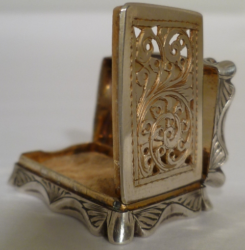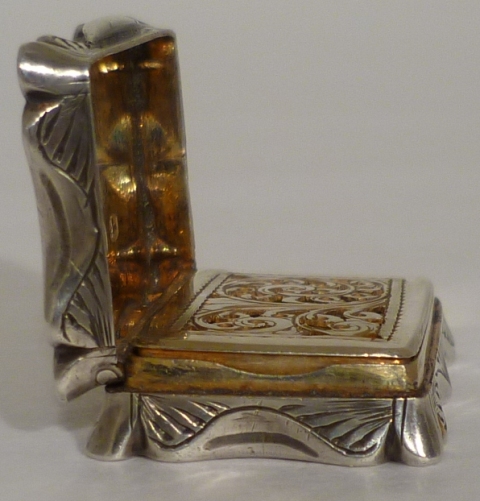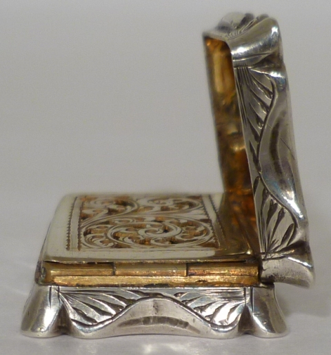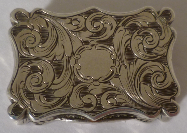 Very good early Victorian silver gilt vinaigrette with engraved foliate decoration, a blank cartouche and original gilded, hand pierced and hinged grille. Correctly hallmarked to body, lid and grille. |