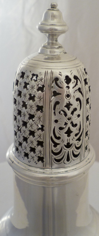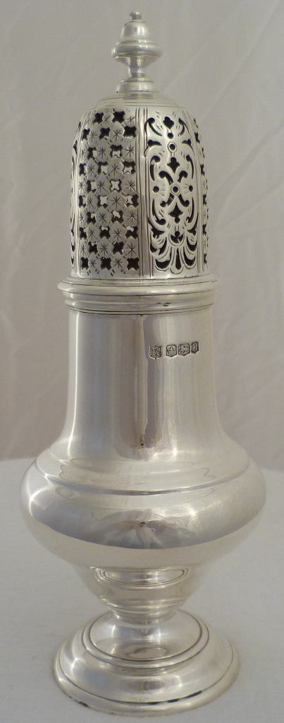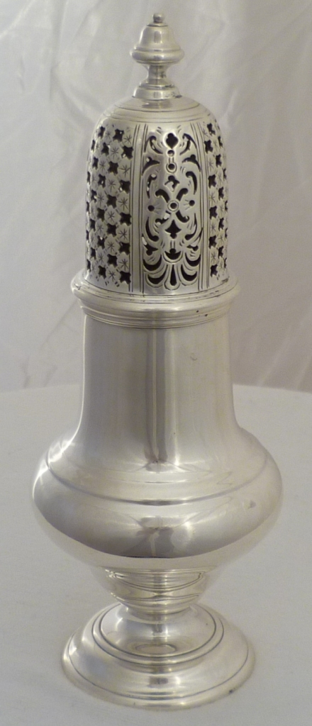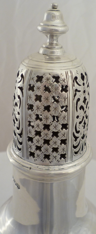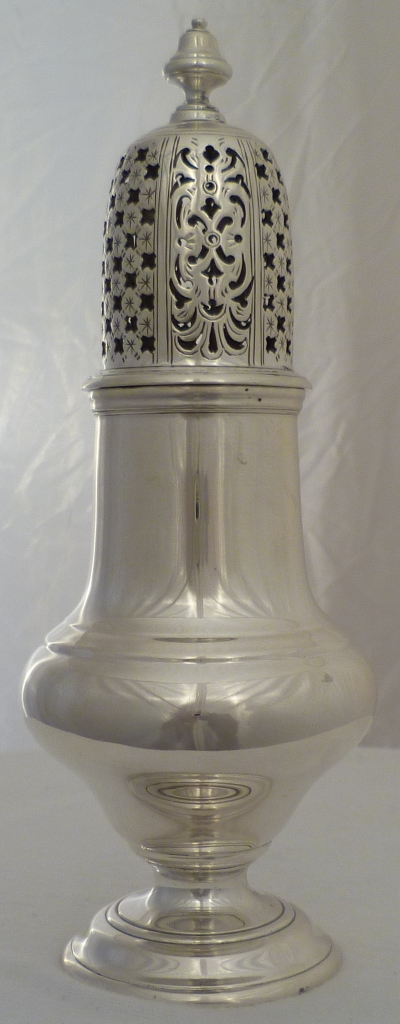 DESCRIPTION | Superb quality silver reproduction of a 1760s caster but significantly larger and heavier than most period examples. I continue to be surprised by how heavy this example is and it is still empty. |