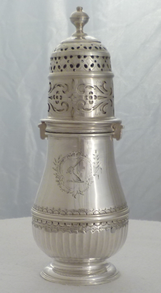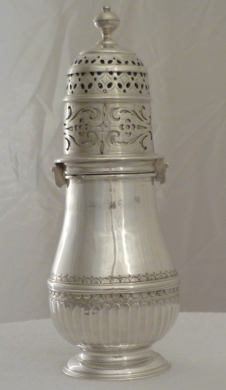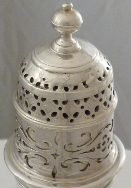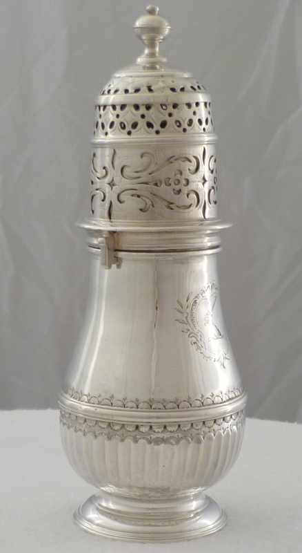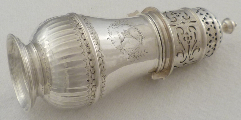 Queen Anne Britannia standard silver caster with a bayonet fitting top and engraved armorial. The beautifully pierced and engraved top must have been a generous dispenser as a later silver blank has been fitted up to the top with