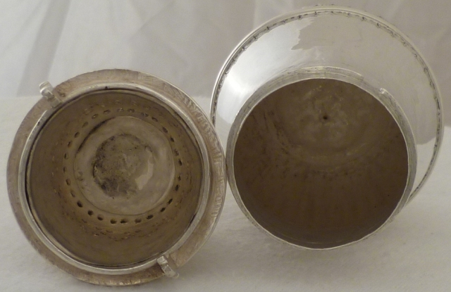 only the upper two bands pierced so that now the wide lower band of piercing is only decorative. The hallmarks in my last image read from left to right; maker, Britannia, lion's head erased, date. |