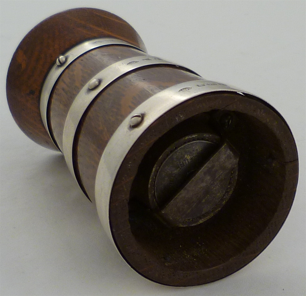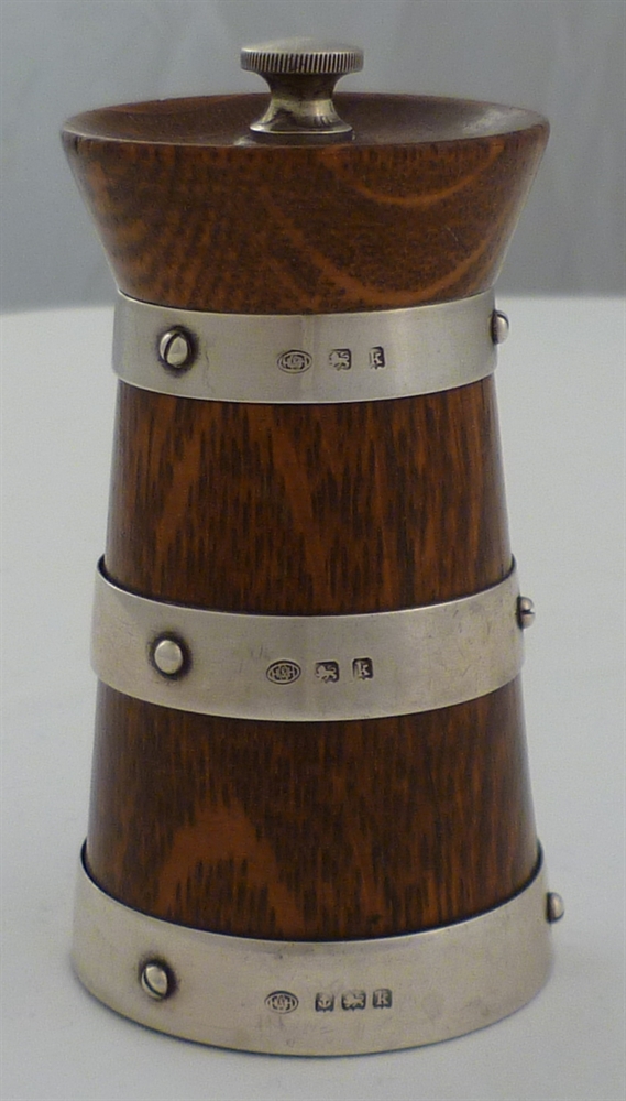 DESCRIPTION | Edwardian silver mounted carved oak pepper mill or grinder in good working order. |