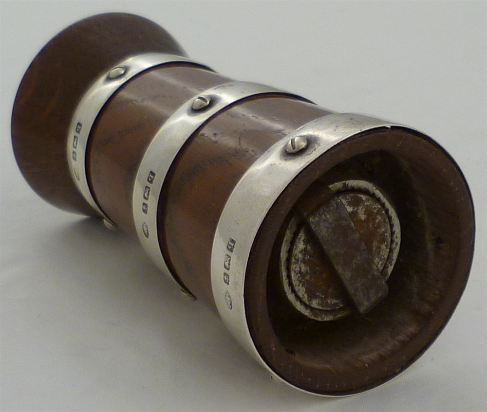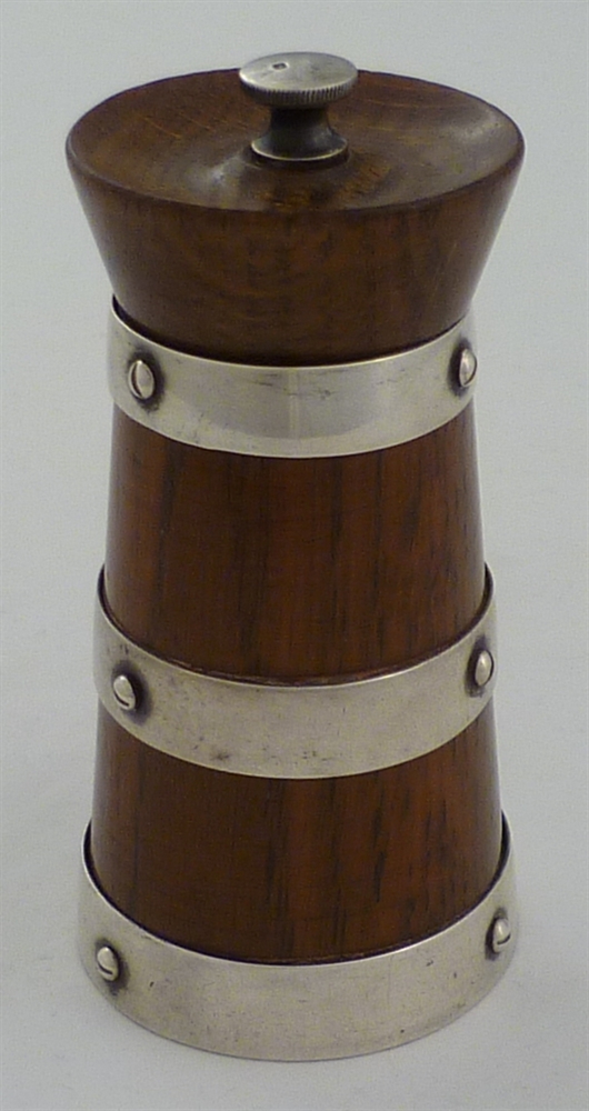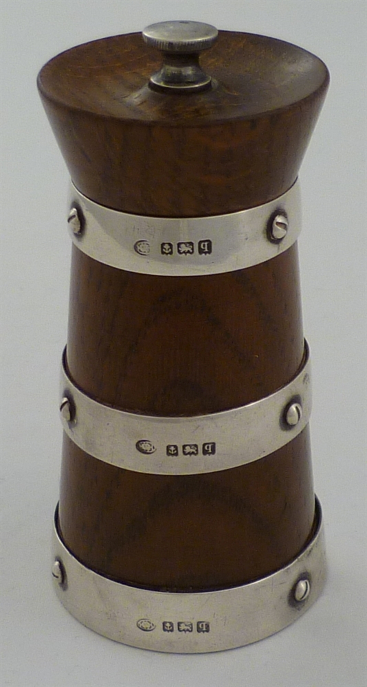 DESCRIPTION | Silver mounted carved oak pepper mill or grinder in good working order. |