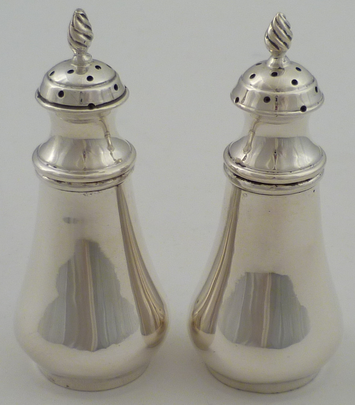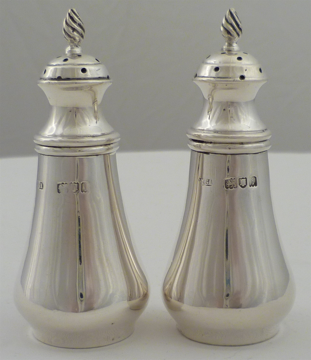 DESCRIPTION | Pair of little Edwardian silver pepper casters with flame finials. |