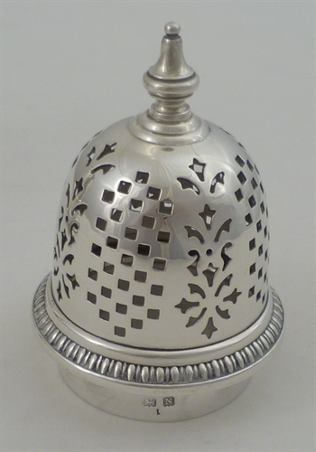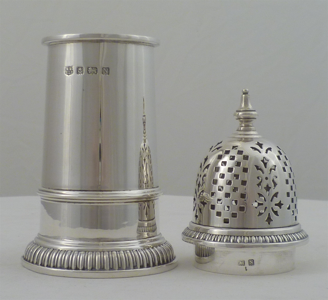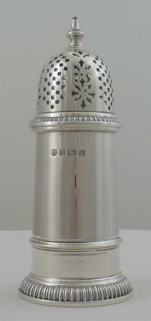 DESCRIPTION | Highest quality solid silver William III style cylindrical caster with pierced decoration to the pull-off top and gadrooned rims. An almost identical caster was made by Richard Biggs in London 1701. |