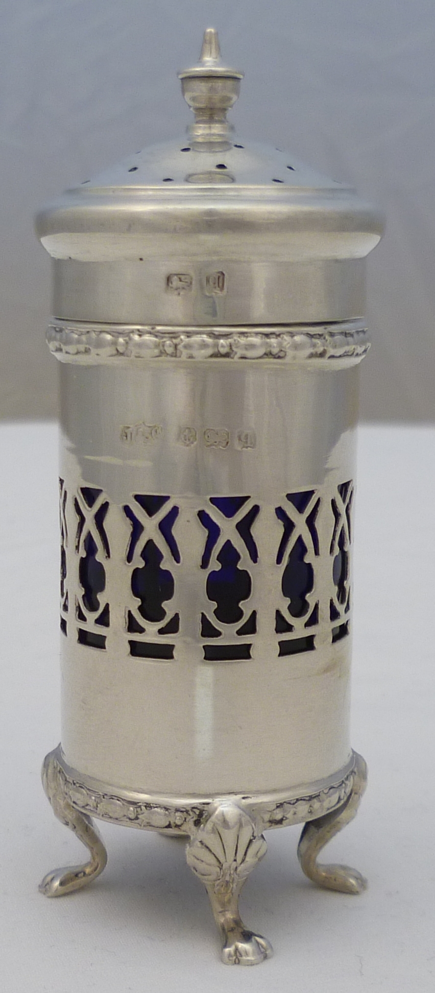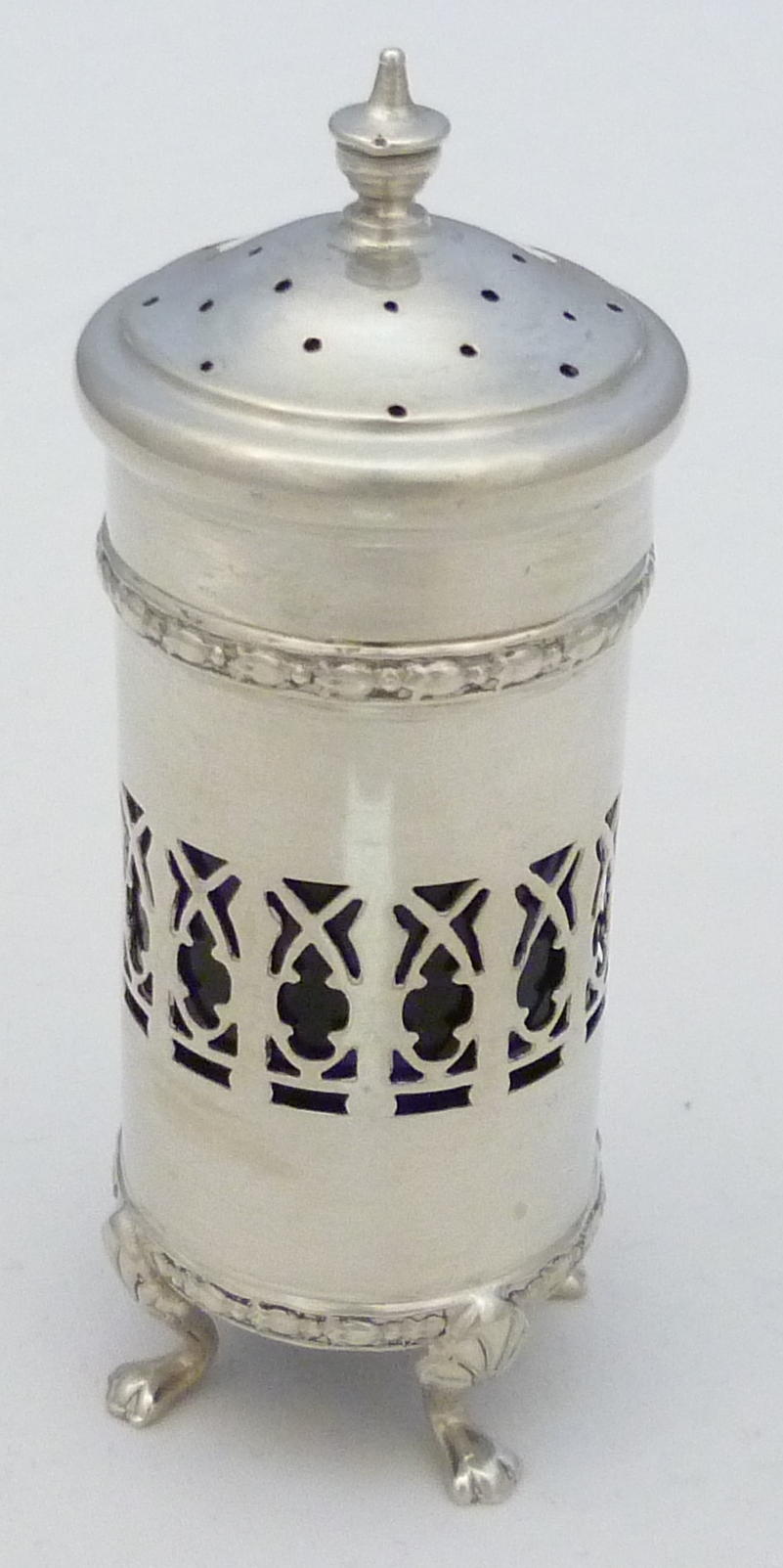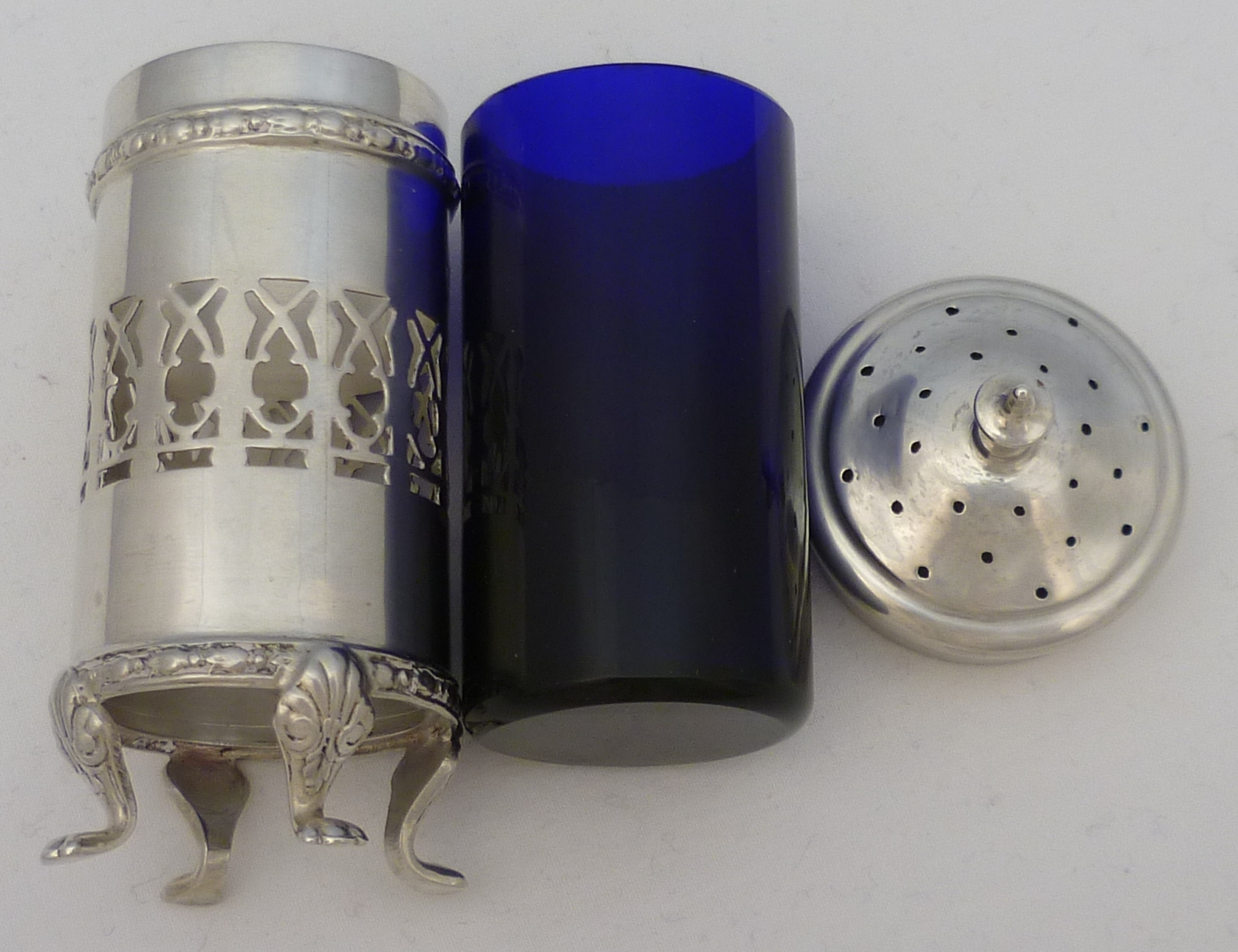 DESCRIPTION | Pretty little English solid sterling silver pepper caster with pierced decoration and the original blue glass liner. |