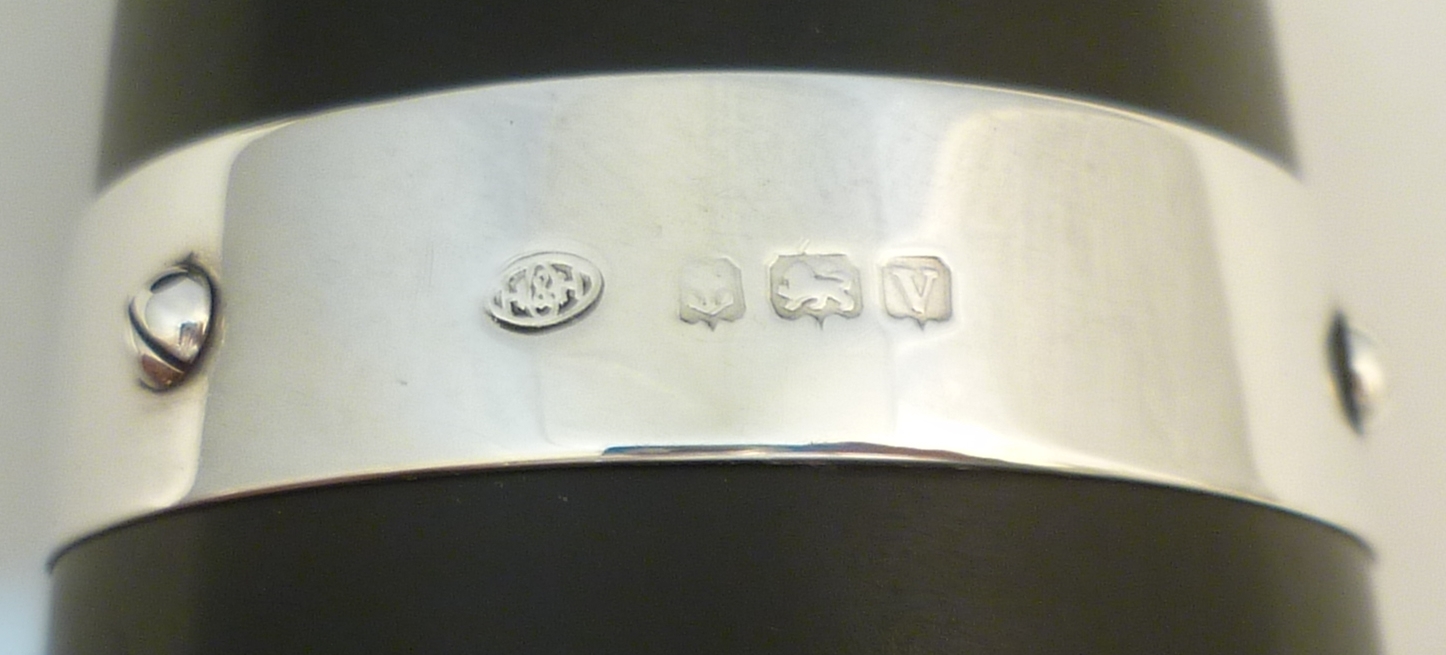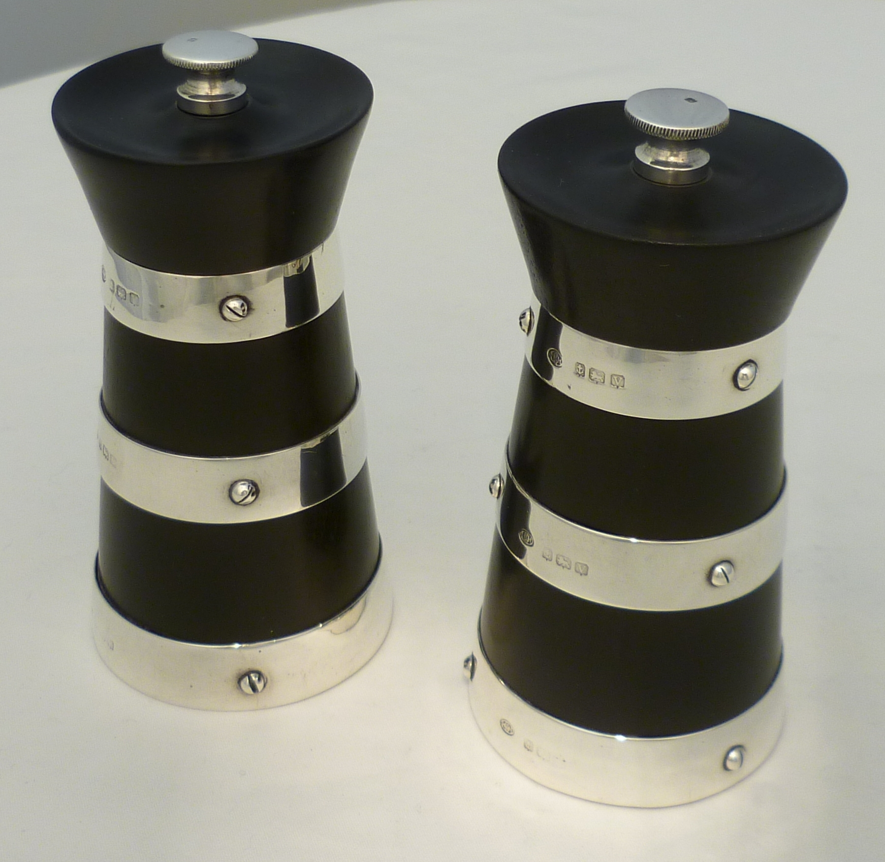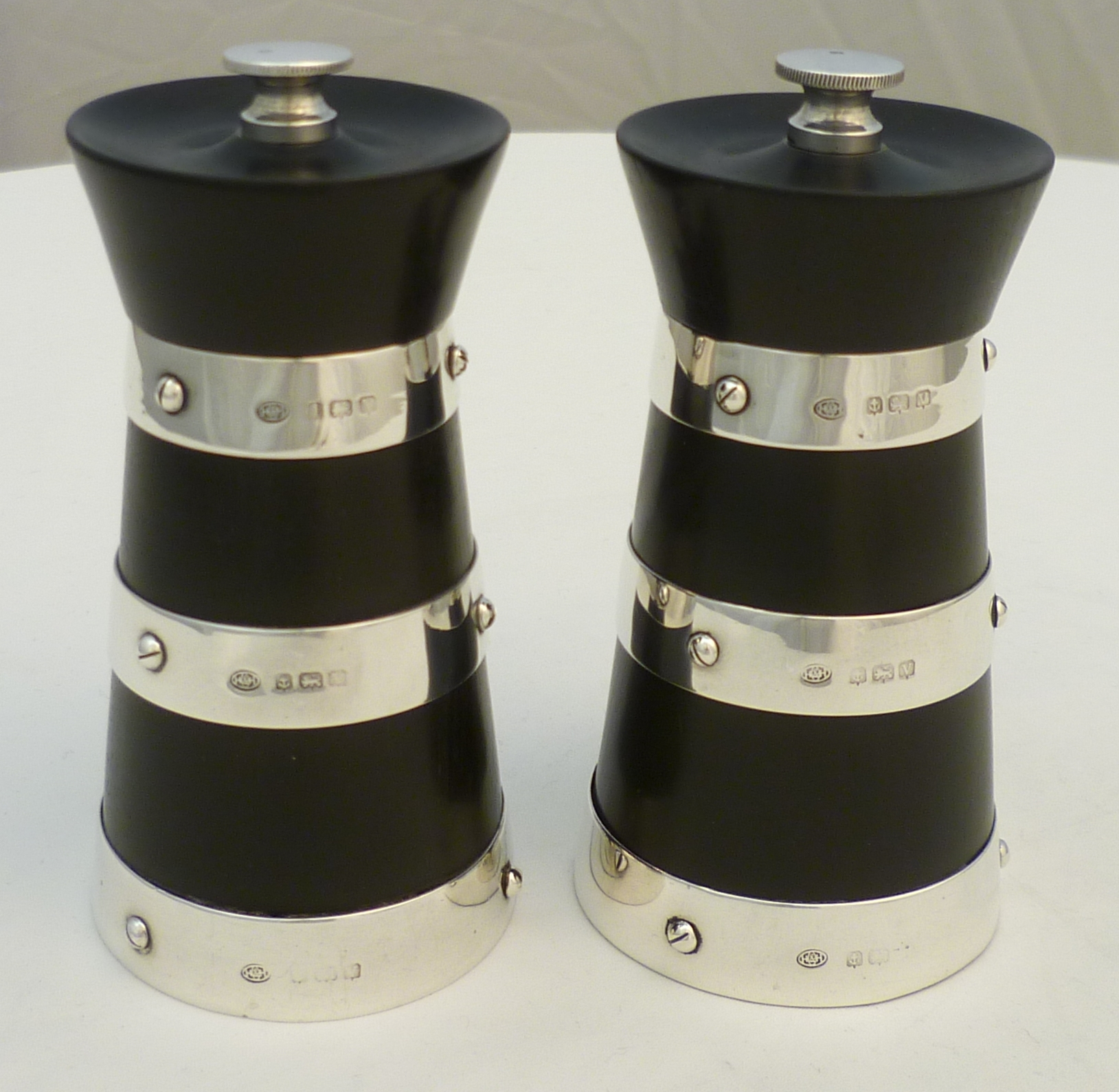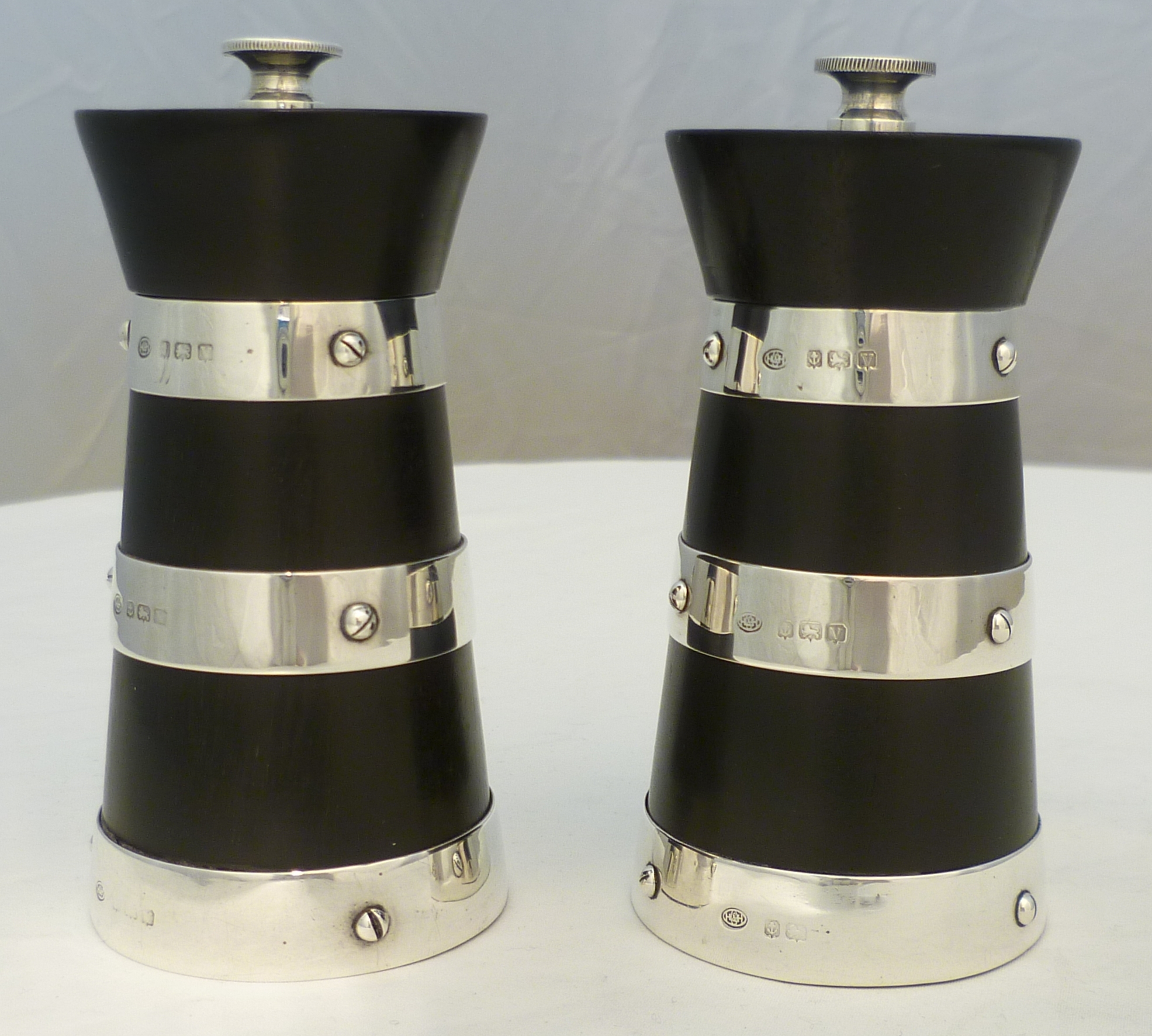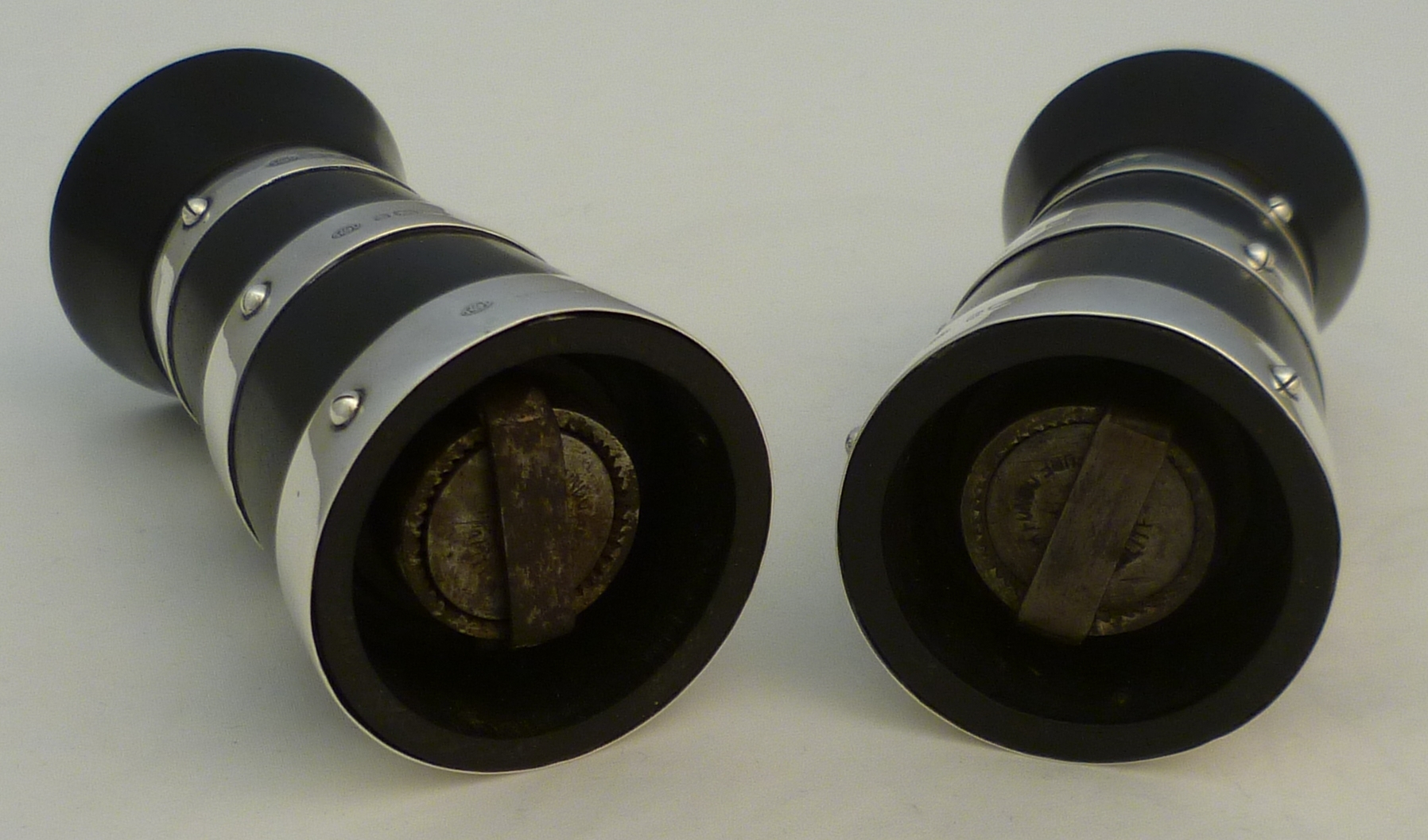 DESCRIPTION | Beautiful and useful pair of English solid sterling silver mounted ebonised wood pepper mills or grinders formed as milk churns. Steel mechanisms, all in good working order. The coarseness of the grind is adjusted via the knurled silver top nuts. You could use one for salt but I would be concerned about corrosion of the steel. |