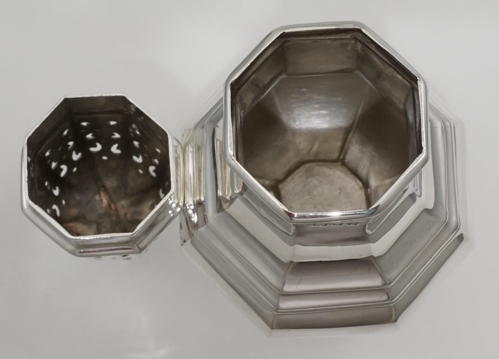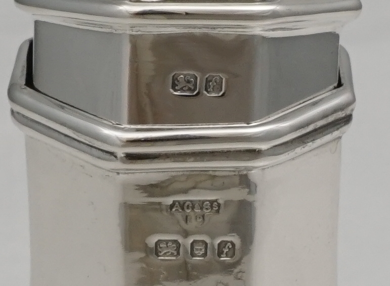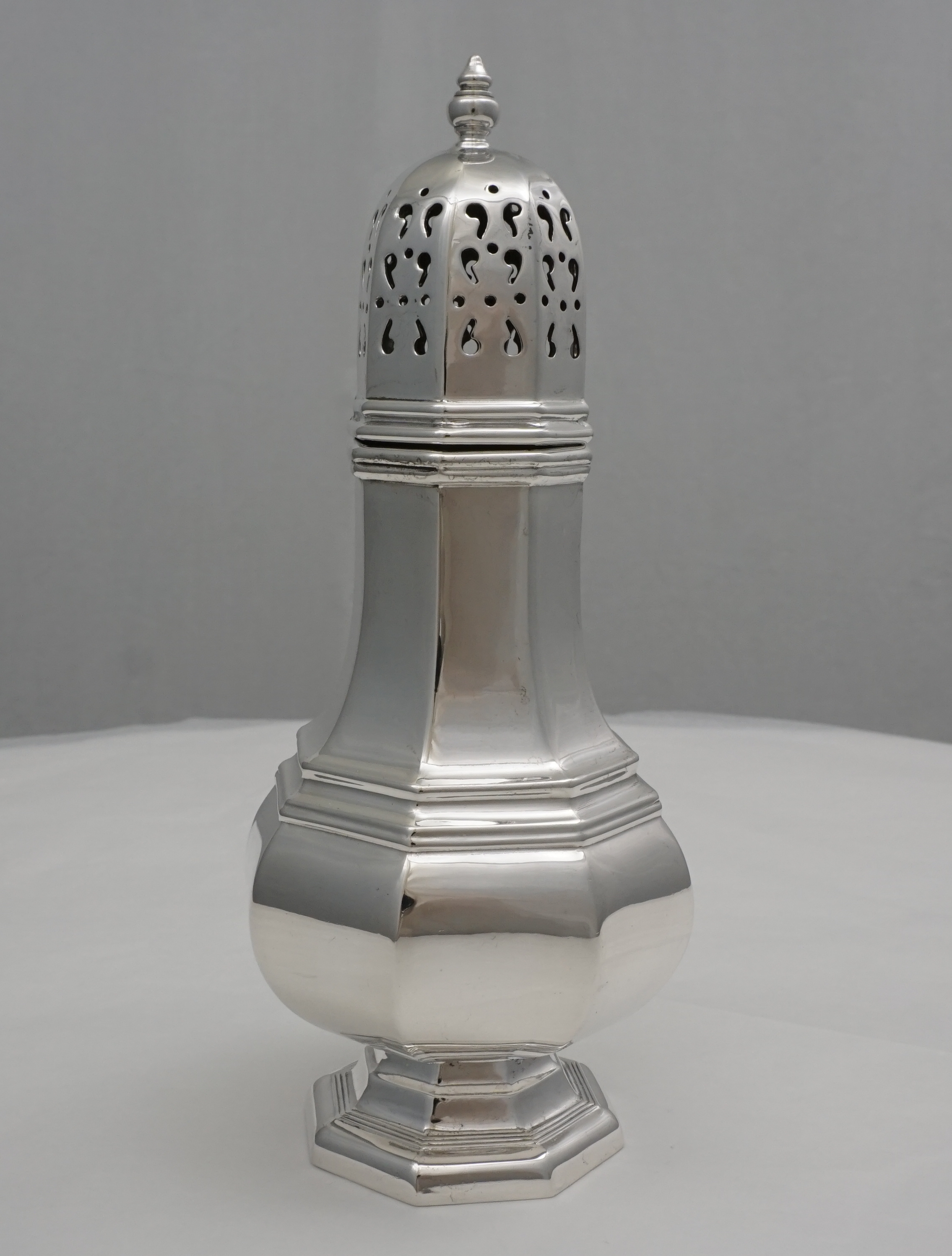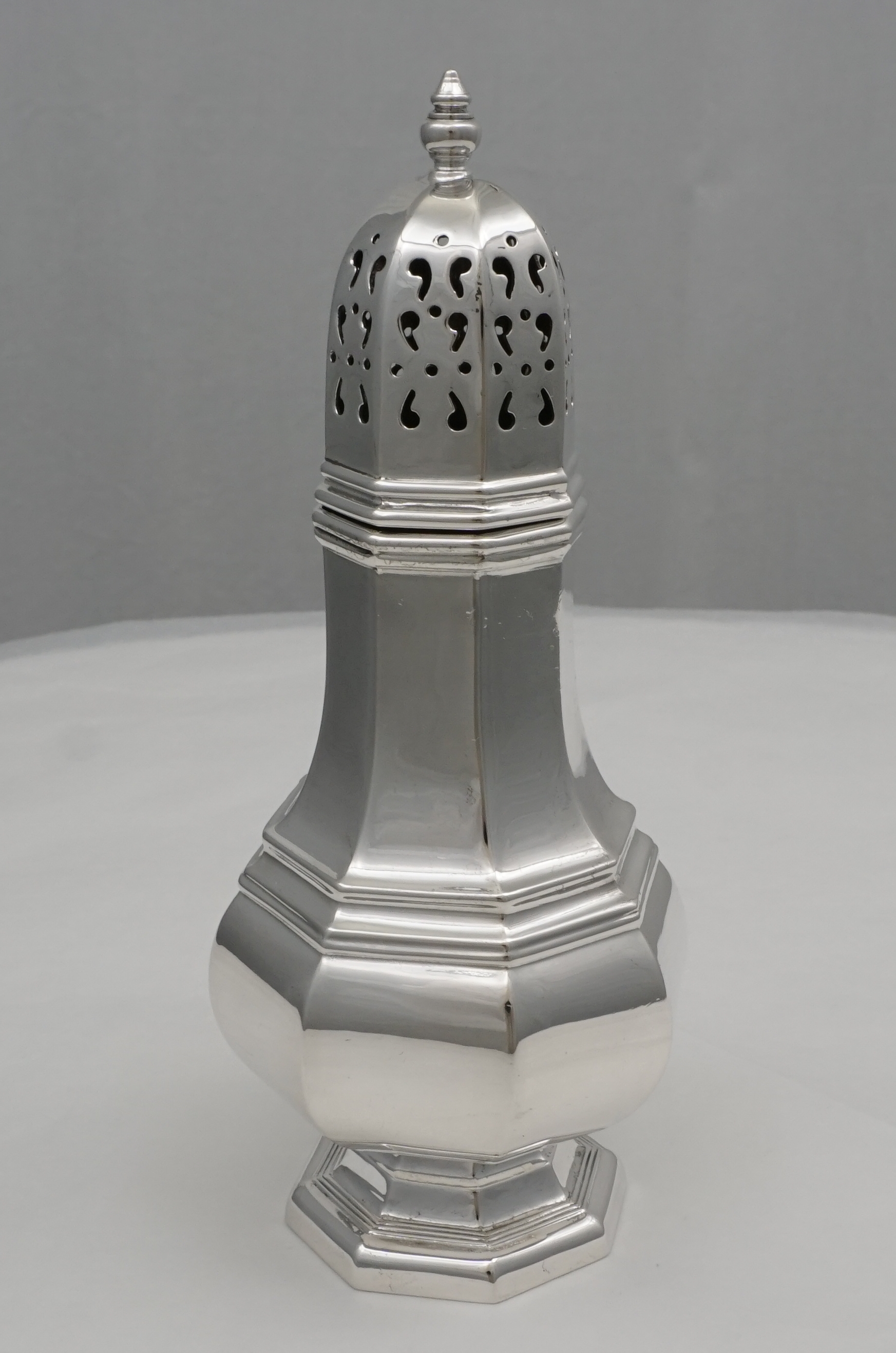 DESCRIPTION | Nice quality and surprisingly heavy English solid sterling silver octagonal caster with a pierced pull off top. |