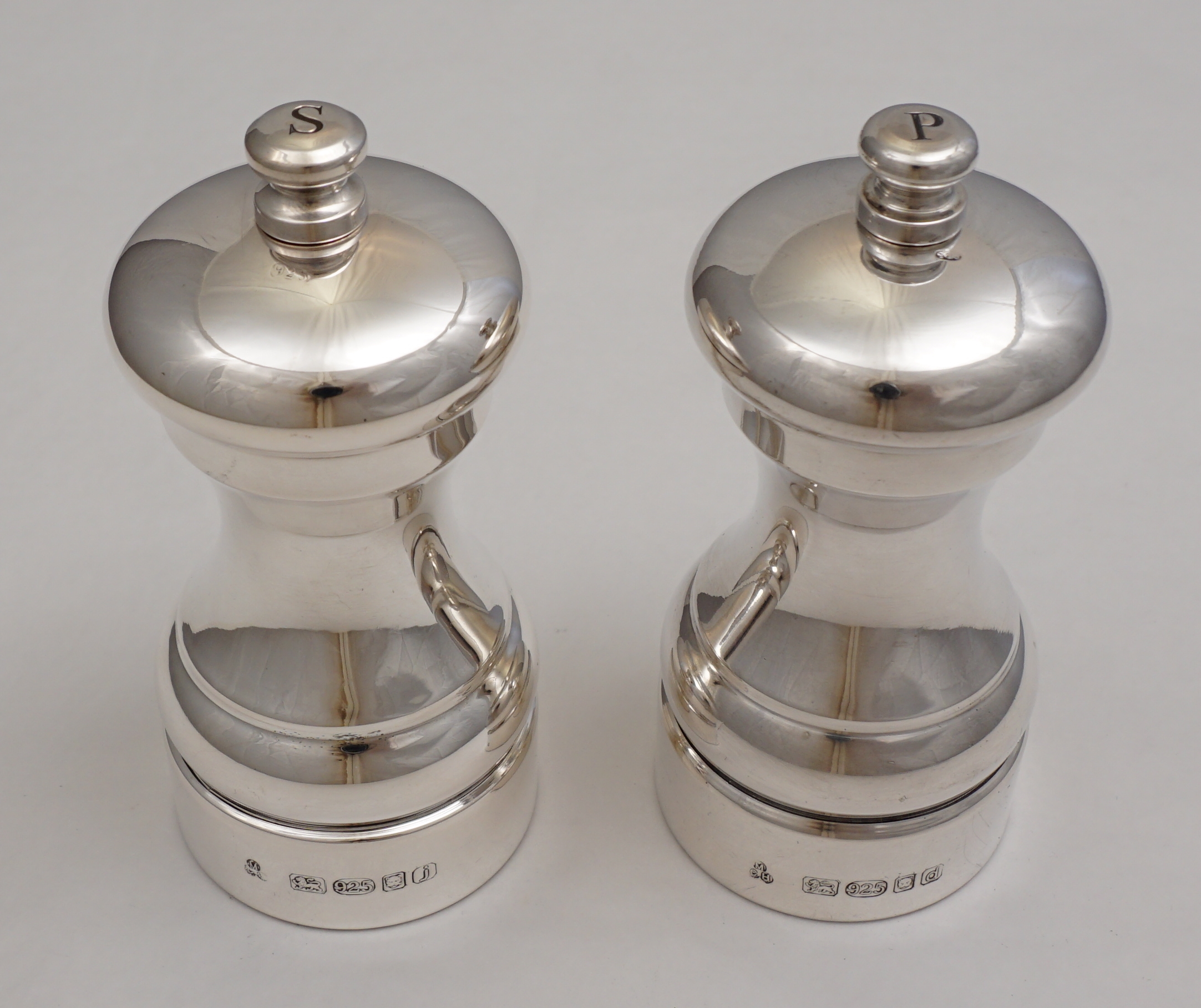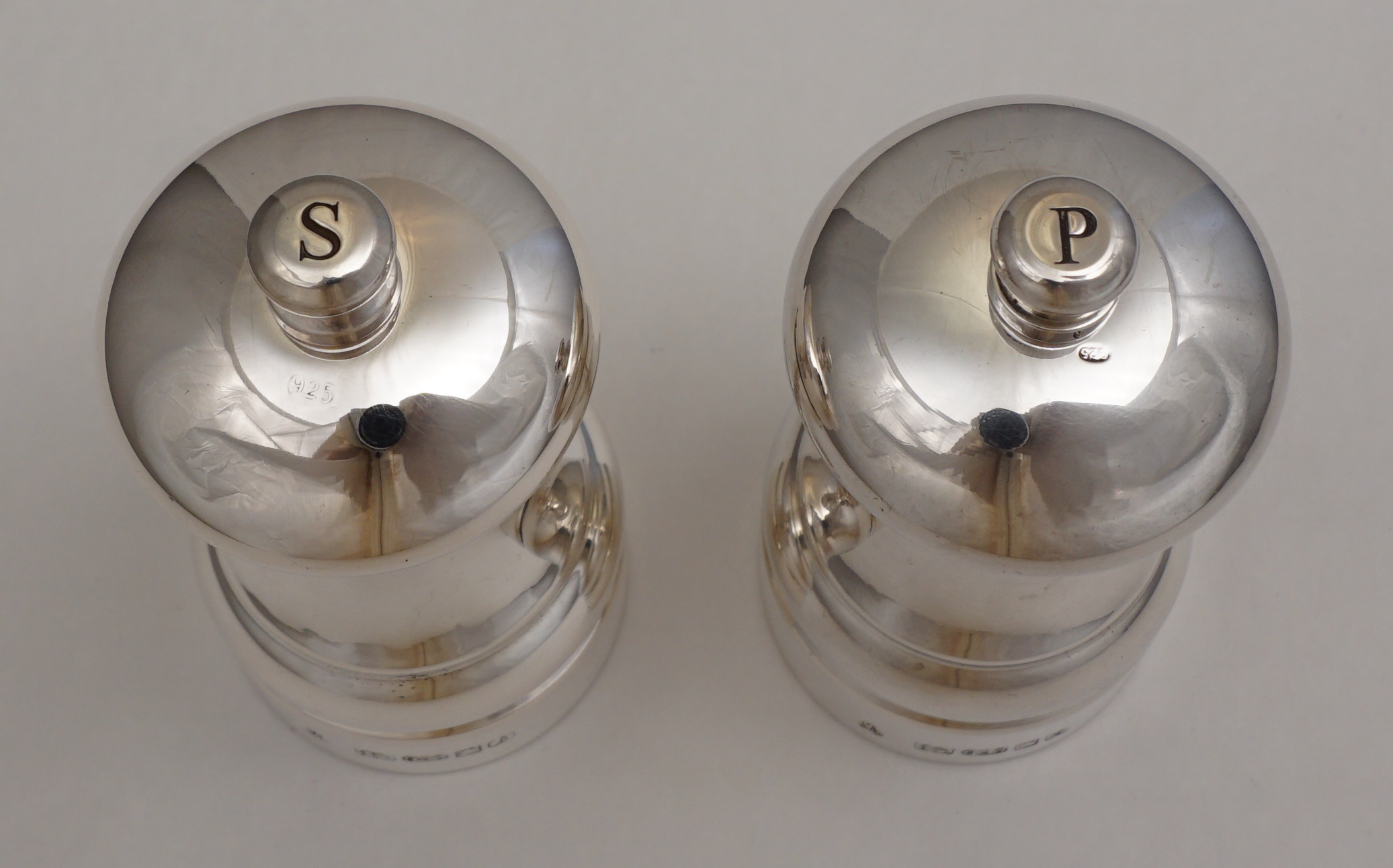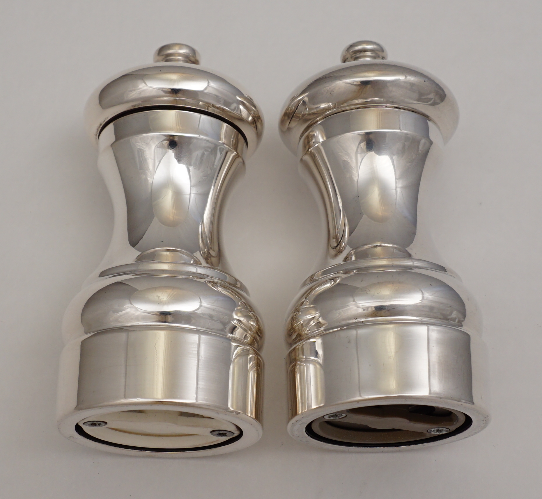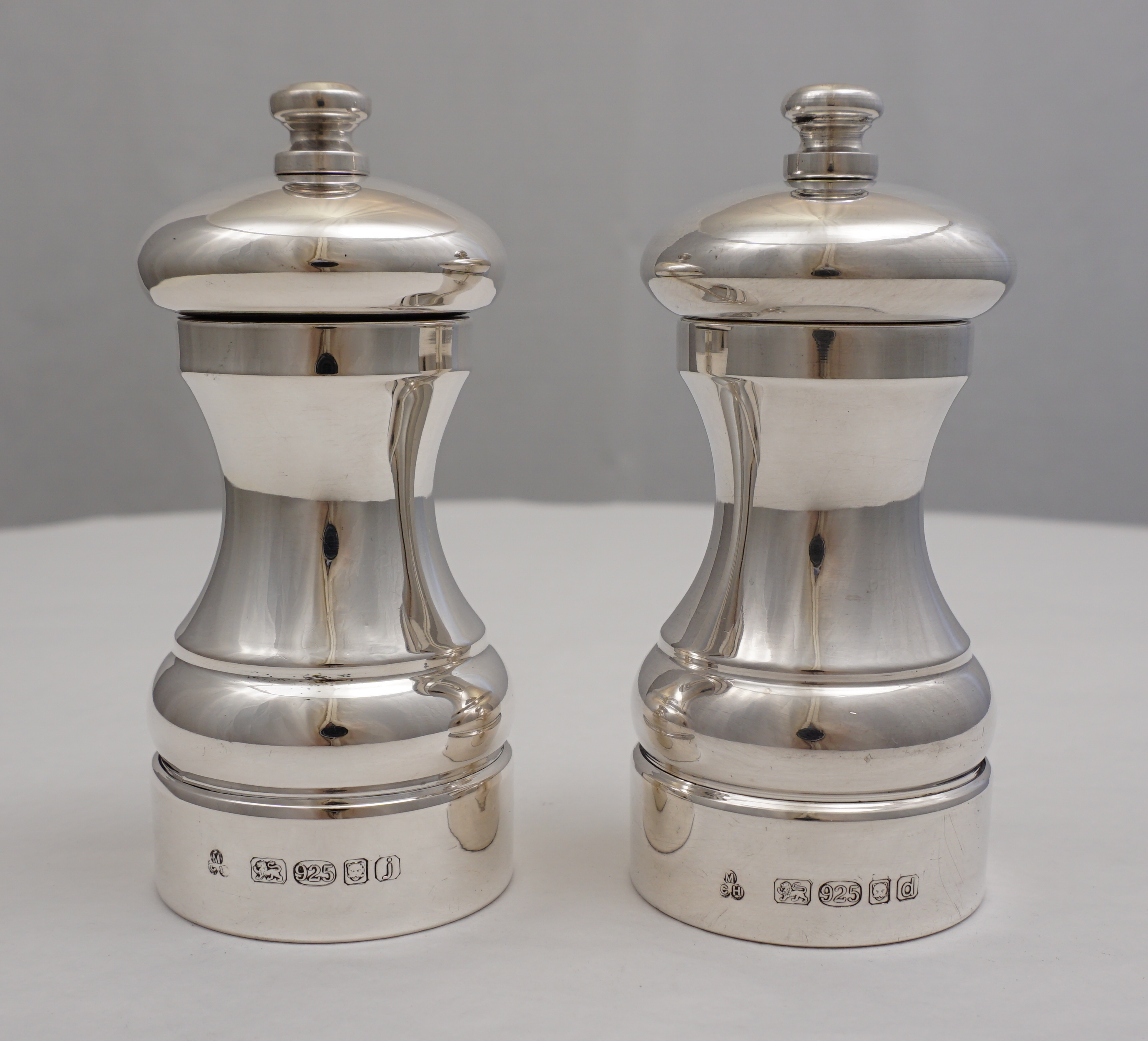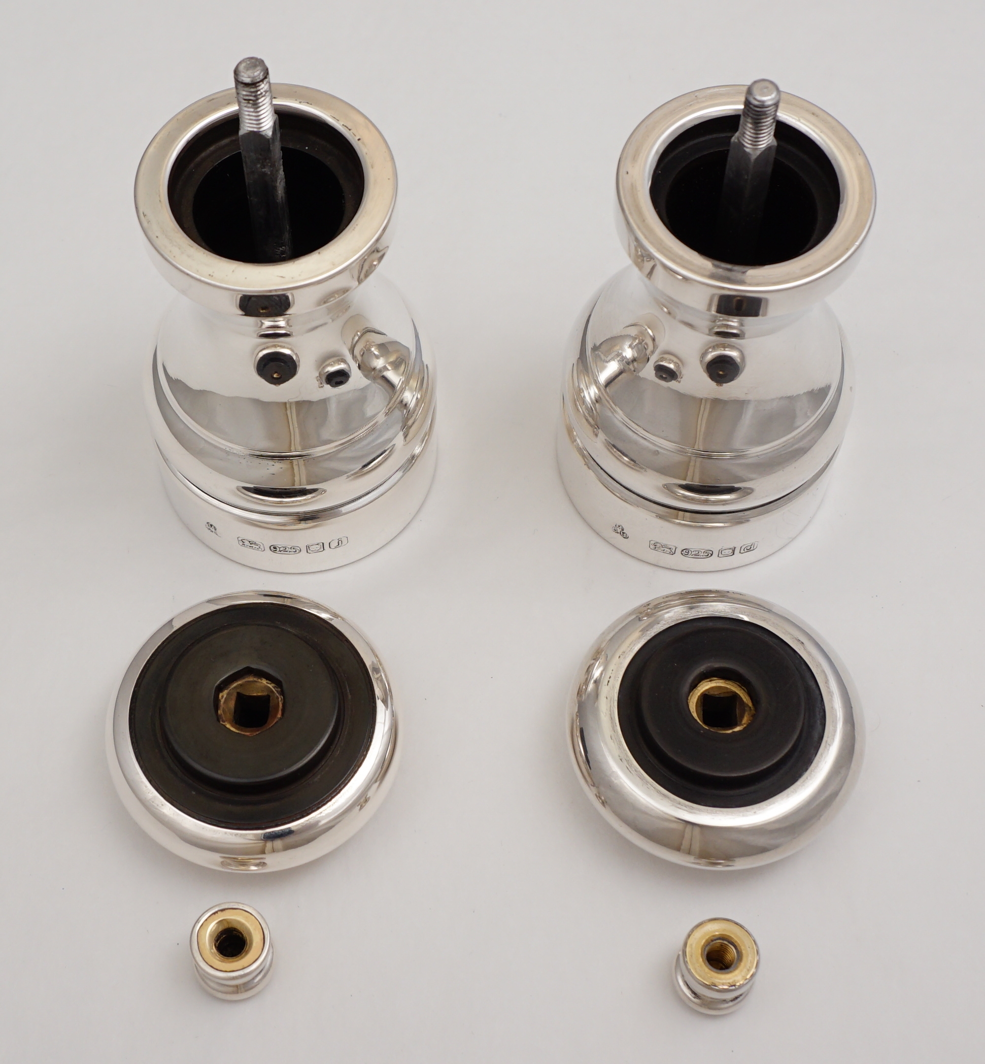 DESCRIPTION | Good pair of vintage English solid sterling silver salt and pepper mills (grinders). Hersey still sell this size and model of mills for £394/pair inc. tax today (1st May 2022). Nice sign of quality are the brass inserts to reduce wear and corrosion. |