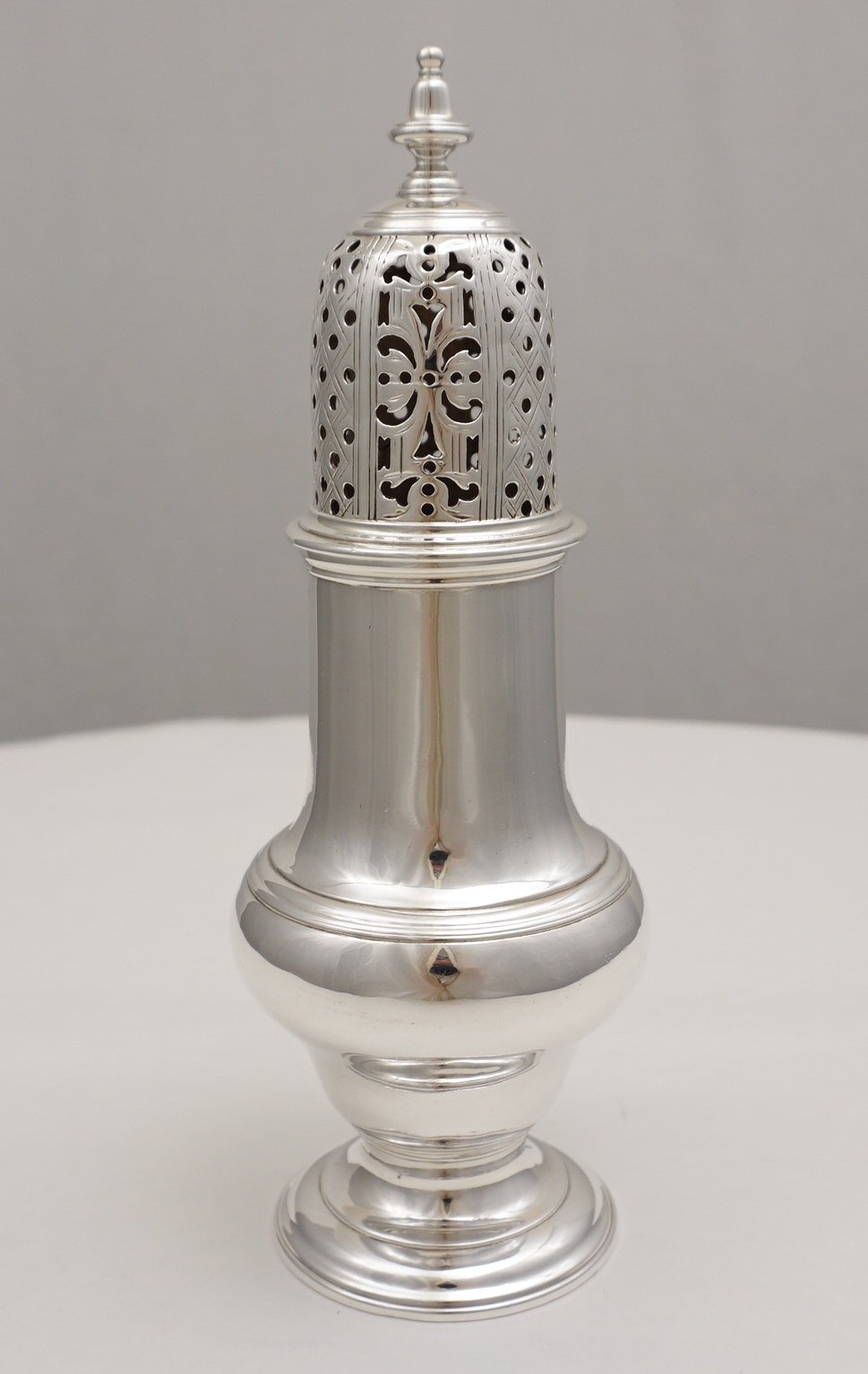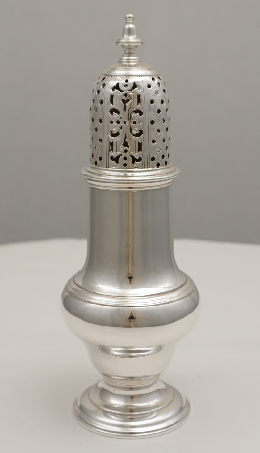 DESCRIPTION | High quality and large antique English Georgian solid sterling silver master caster with no engraving or erasure and correctly hallmarked with beautifully well struck and preserved marks to the base and top. Often seen as a trio with the master flanked by a pair of matching but smaller casters, so if you have a pair of 5" 1750s Samuel Wood's then this is the one that you are missing. |