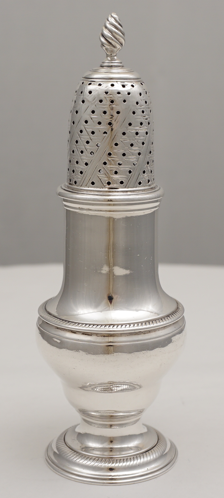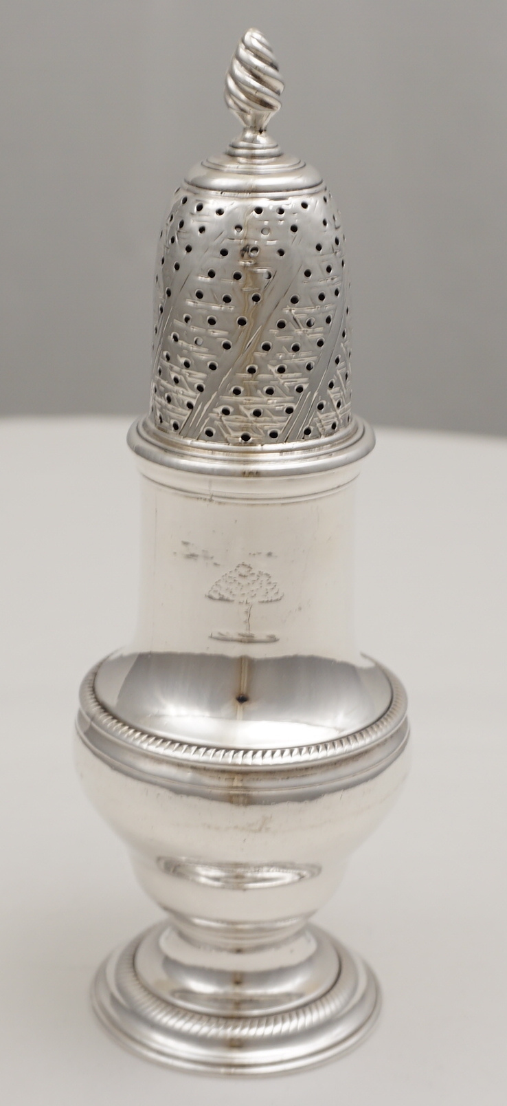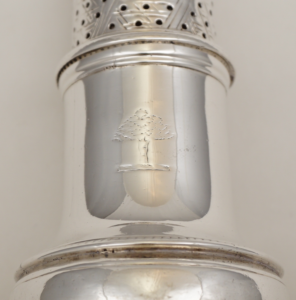 DESCRIPTION | Good quality antique English Georgian solid sterling silver caster with and oak tree crest engraving to the upper body and correctly hallmarked with well struck and preserved marks to the base and top. |