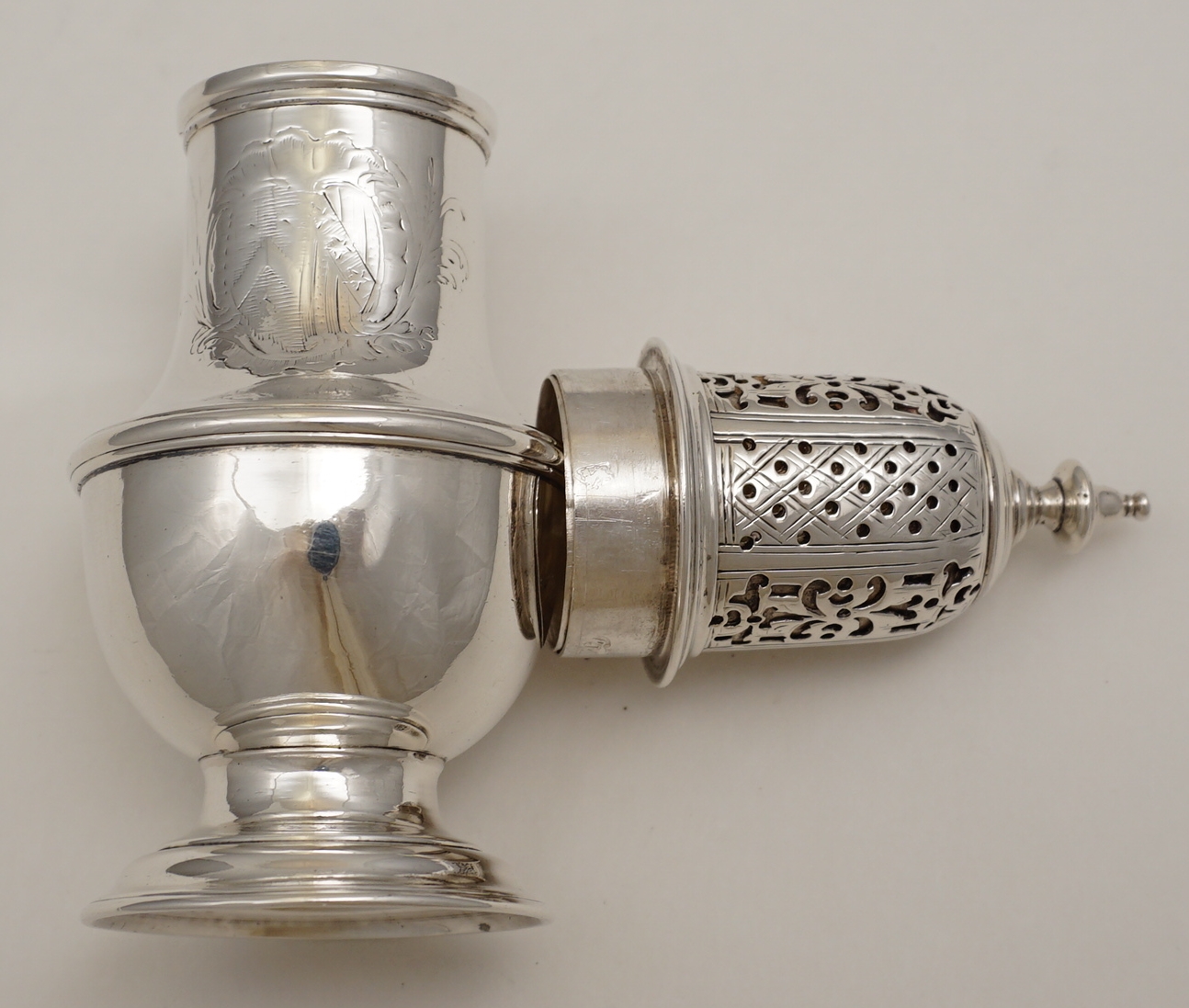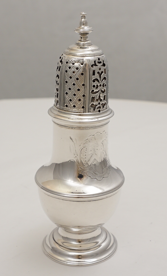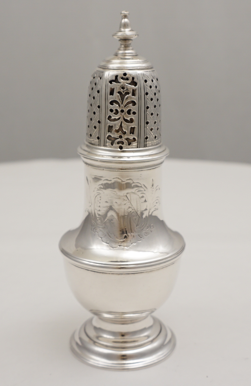 DESCRIPTION | High quality antique English Georgian solid sterling silver caster with the original armorial engraving and correctly hallmarked to the base and top. A pierced silver liner is fitted within the top to allow for use with finer ground spices such as modern ground pepper. |