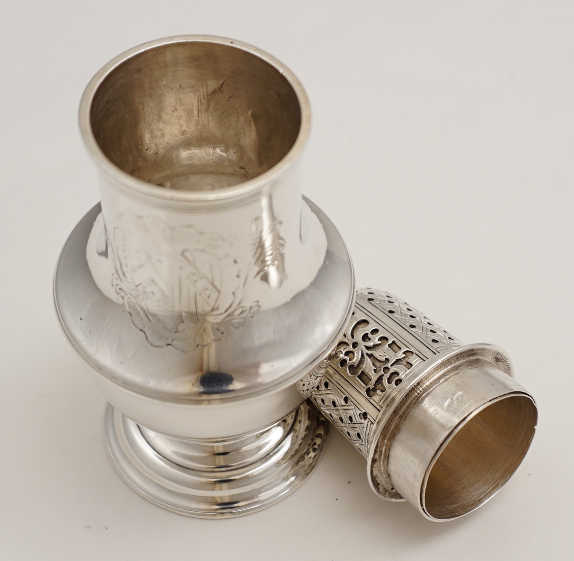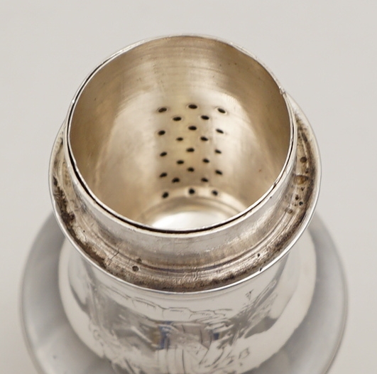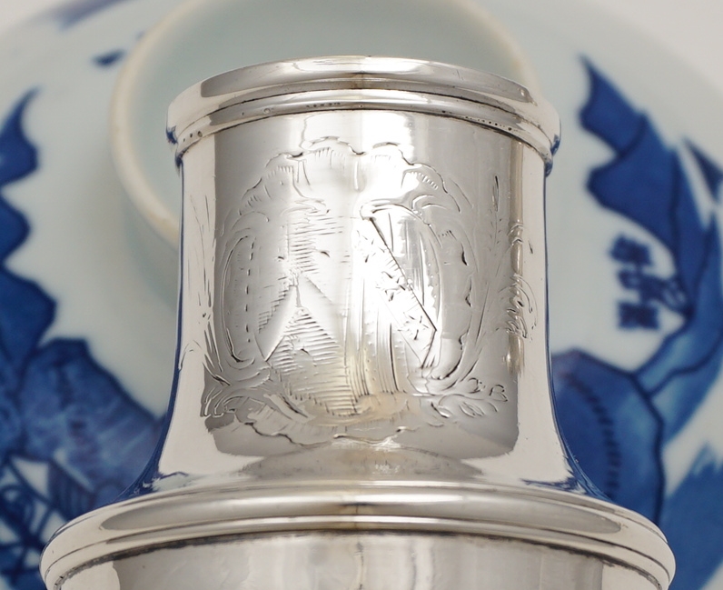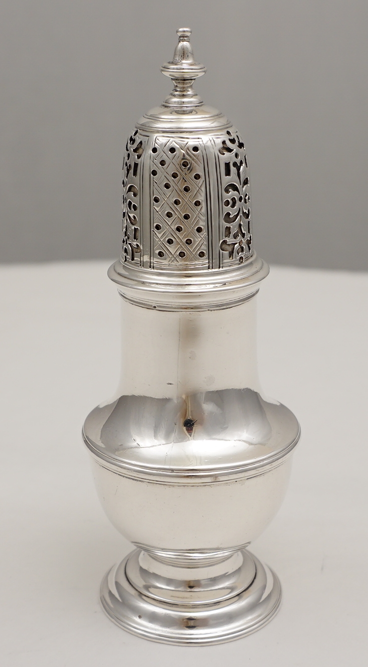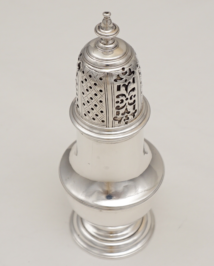 DESCRIPTION | High quality antique English Georgian solid sterling silver caster with the original armorial engraving and correctly hallmarked to the base and top. A pierced silver liner is fitted within the top to allow for use with finer ground spices such as modern ground pepper. |