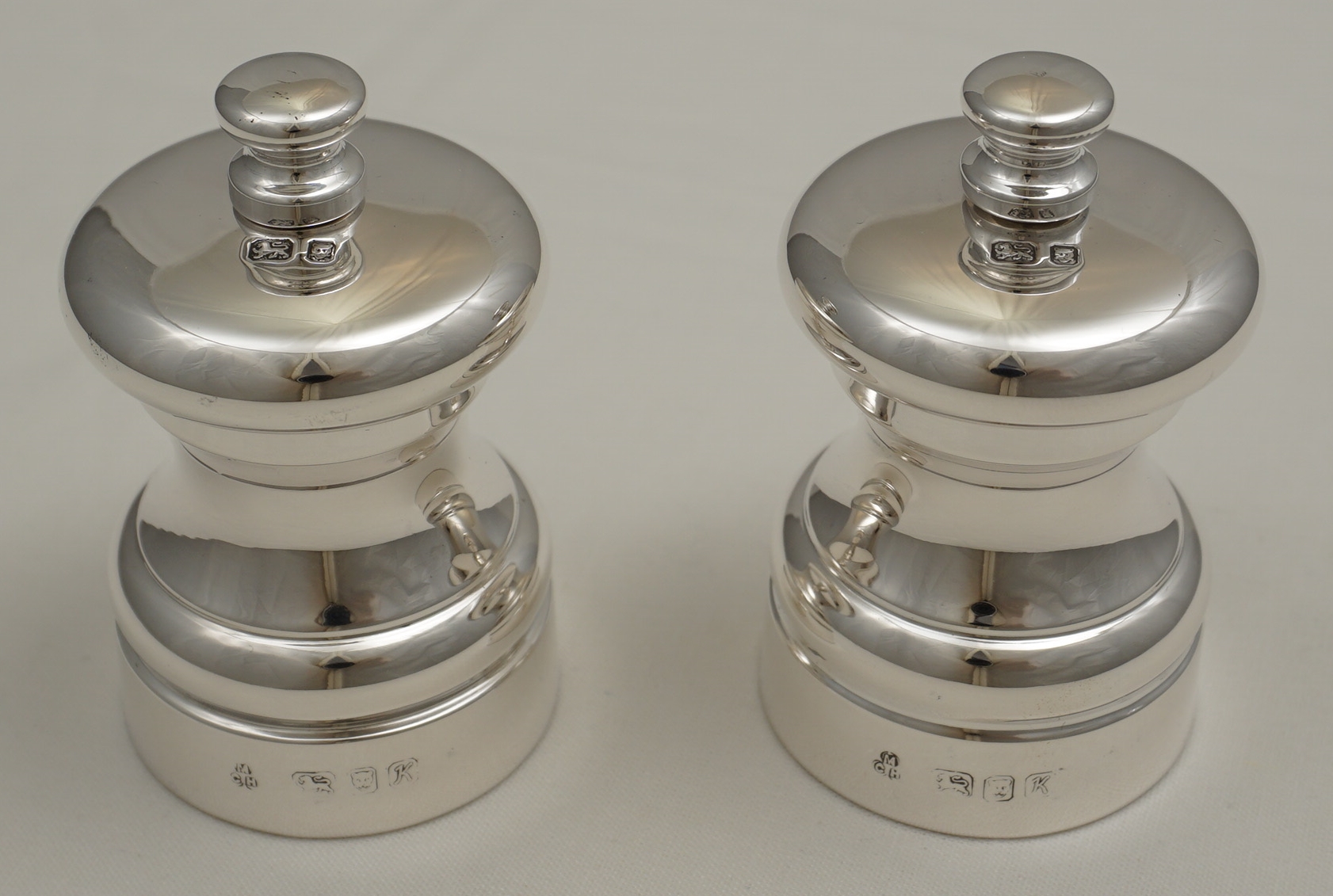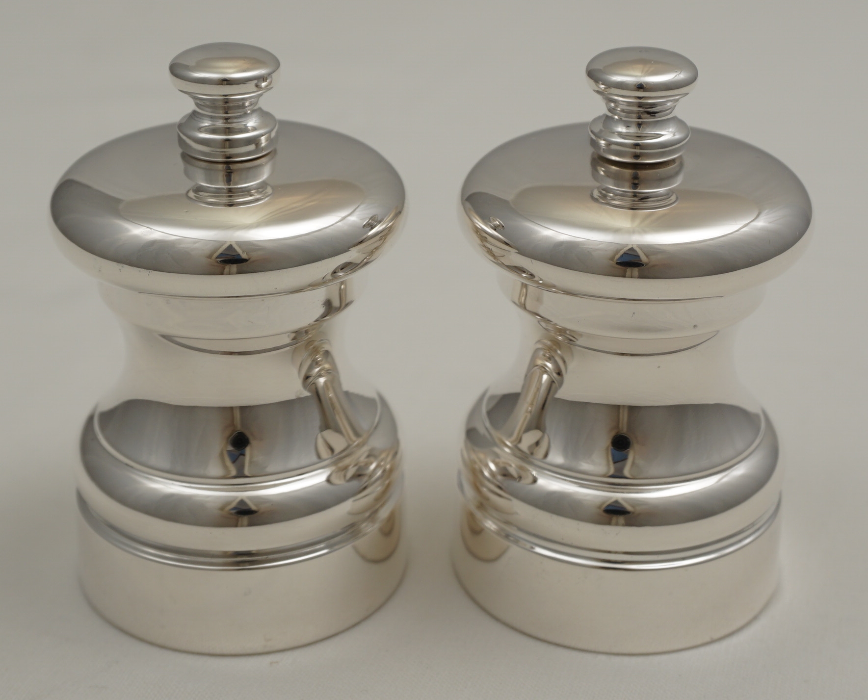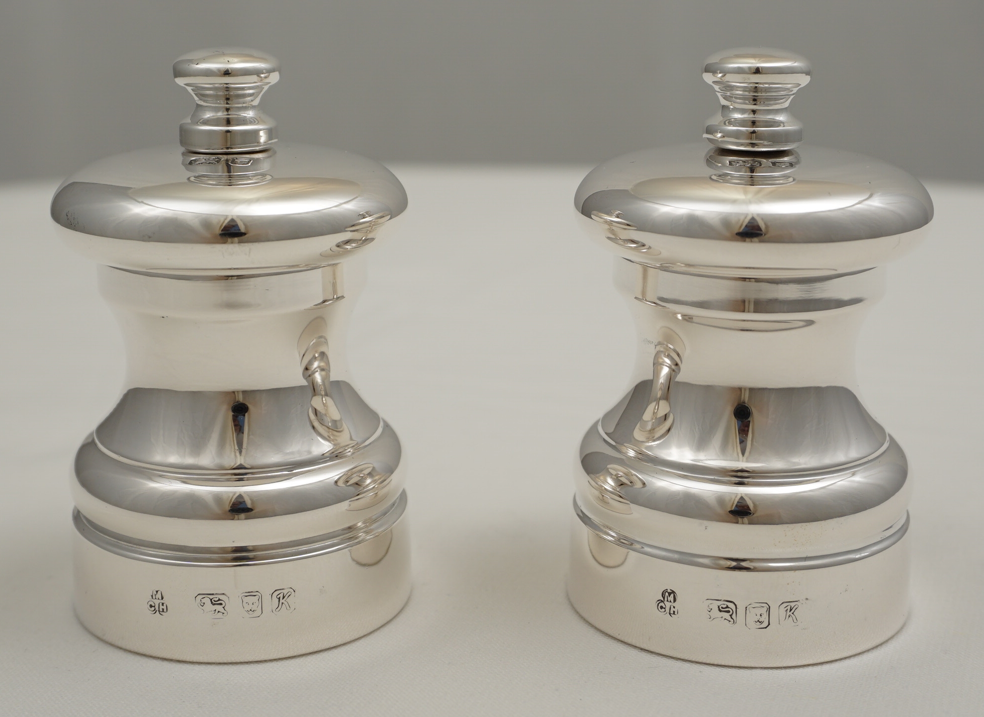 Good pair of sterling silver pepper grinders or mills with Peter Piper mechanisms. These have black plastic liners so could also be used for salt. Slightly smaller version of these grinders is currently (March 2023) available from the makers for £170 each. |
