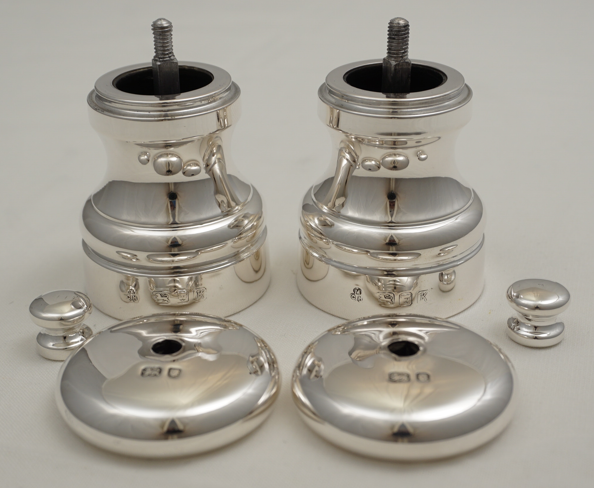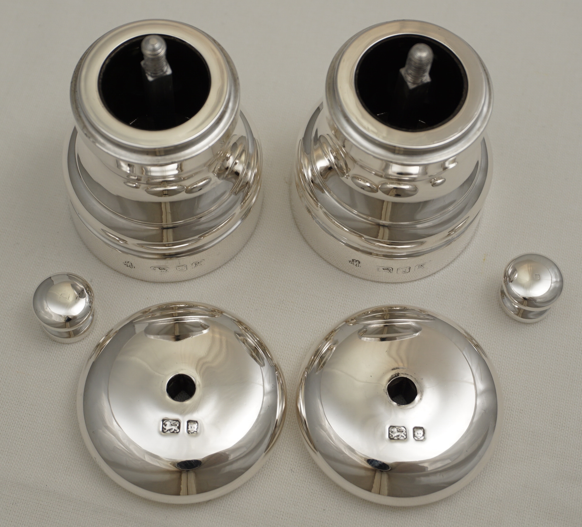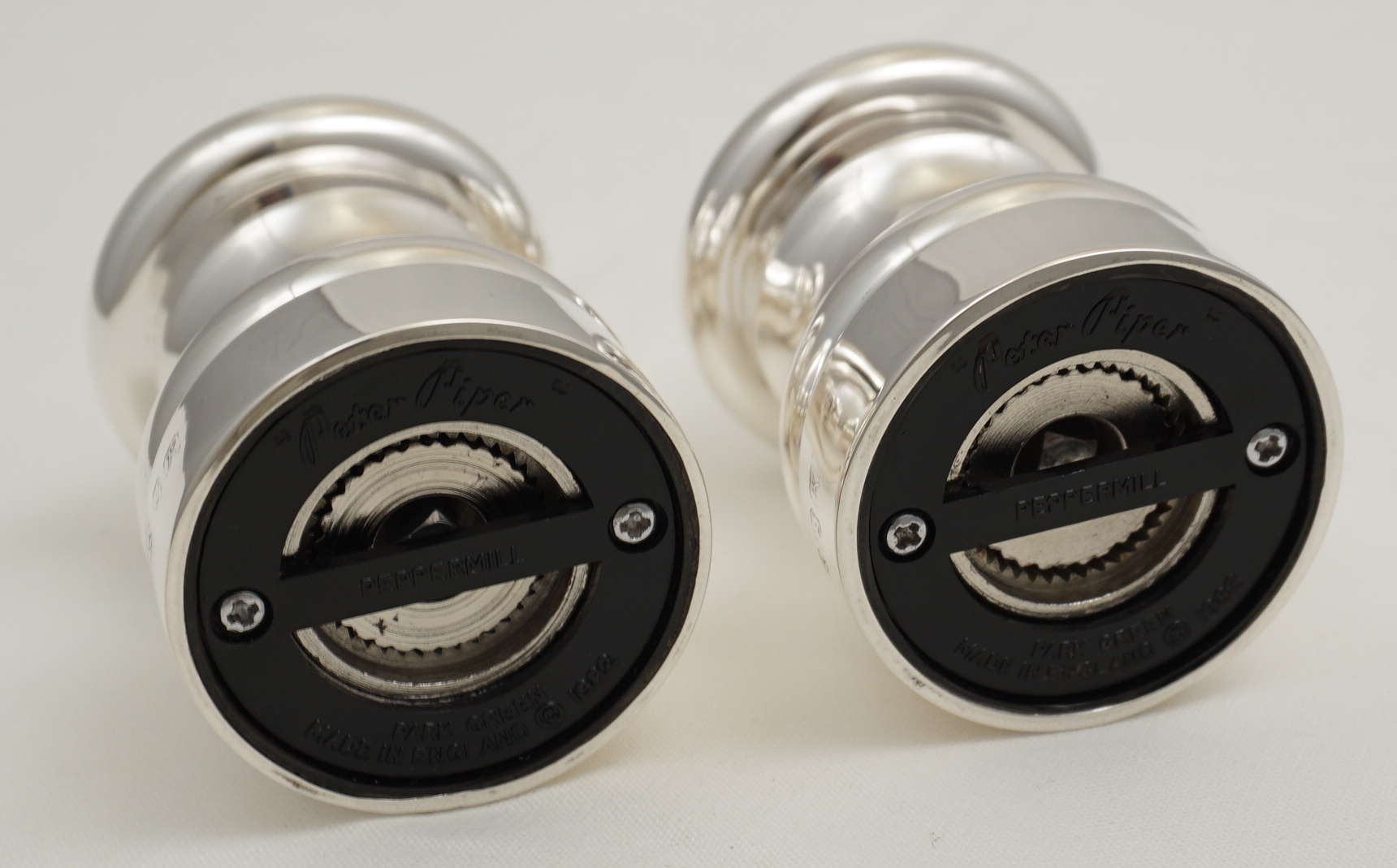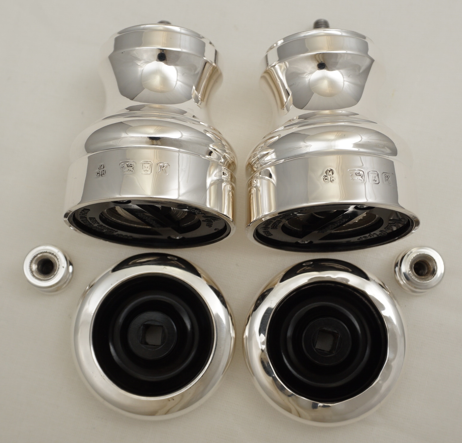 Good pair of sterling silver pepper grinders or mills with Peter Piper mechanisms. These have black plastic liners so could also be used for salt. Slightly smaller version of these grinders is currently (March 2023) available from the makers for £170 each. |