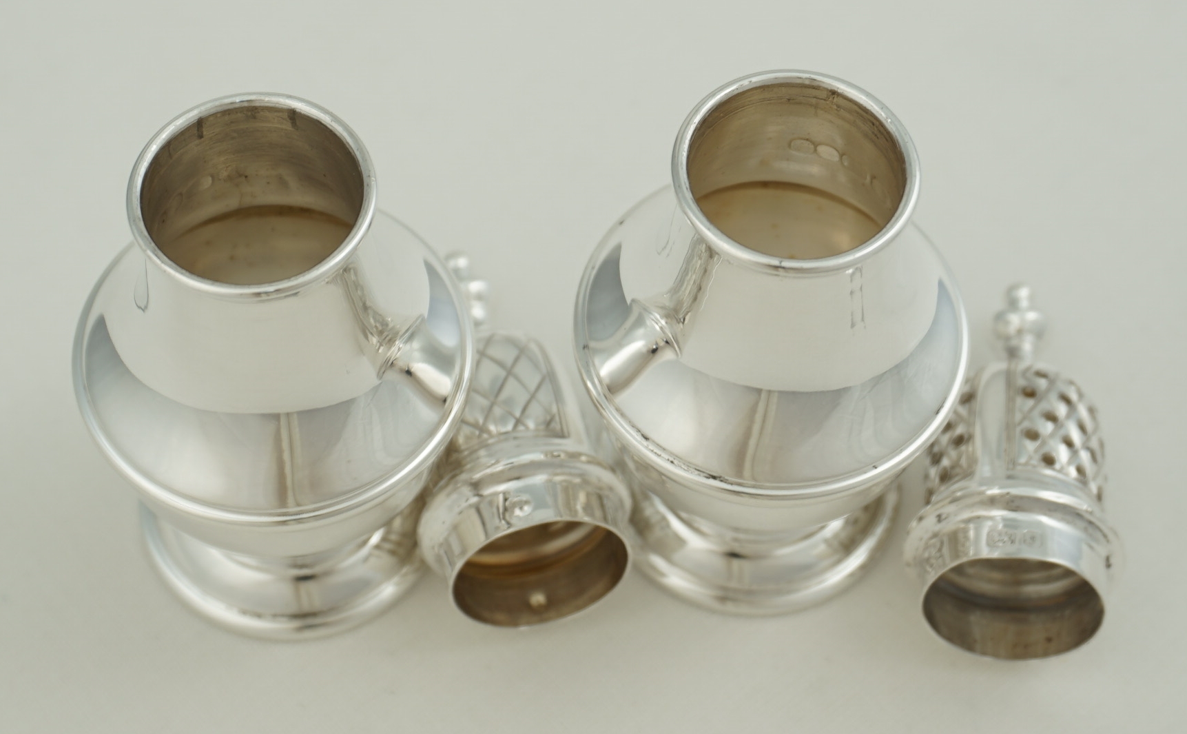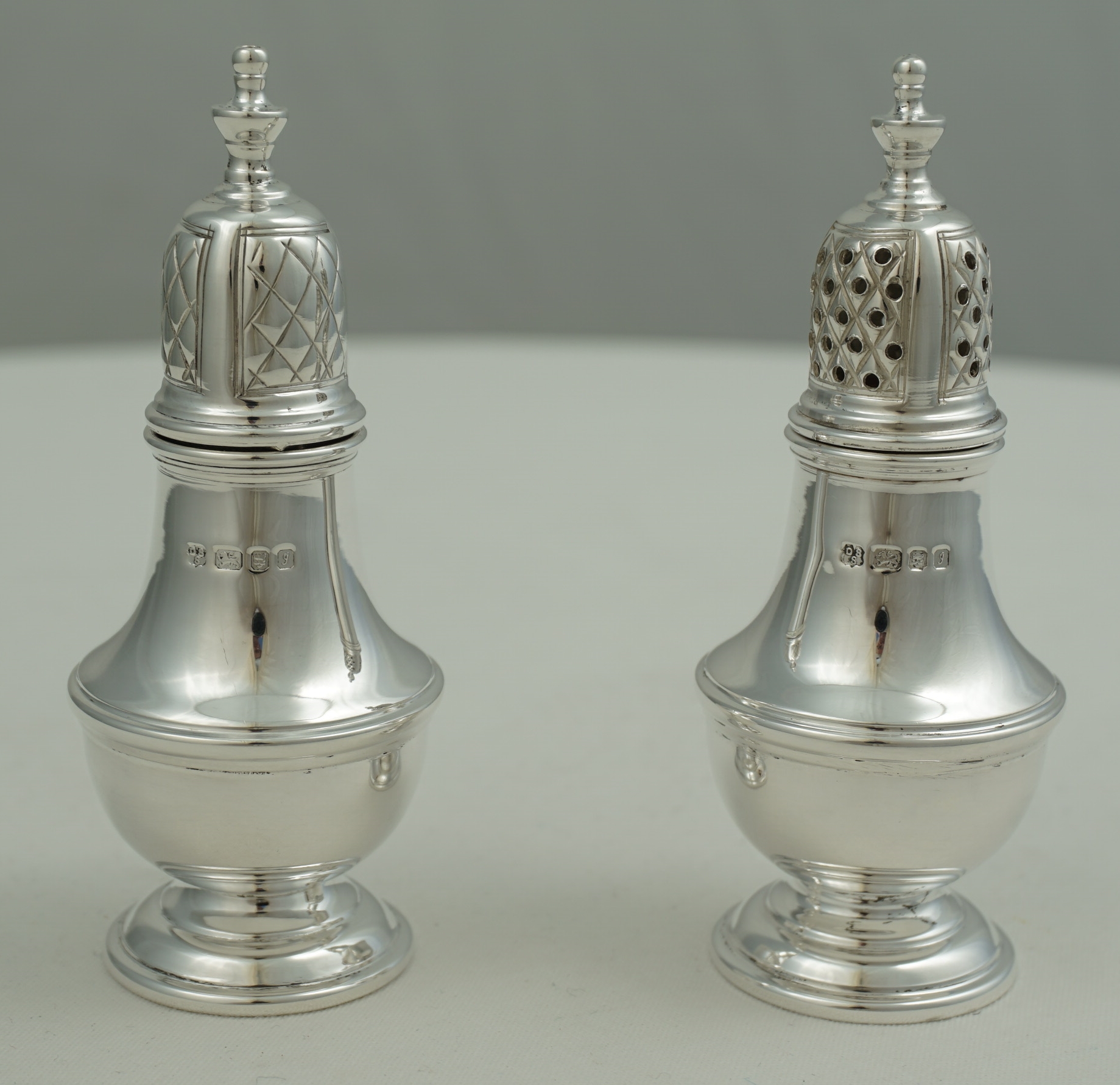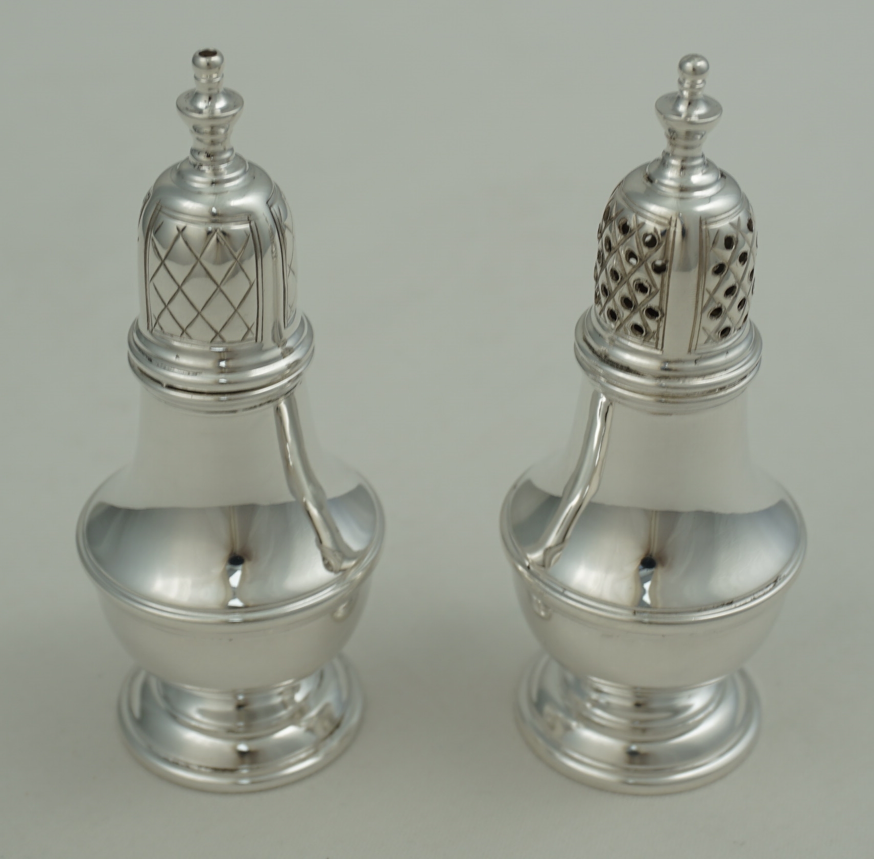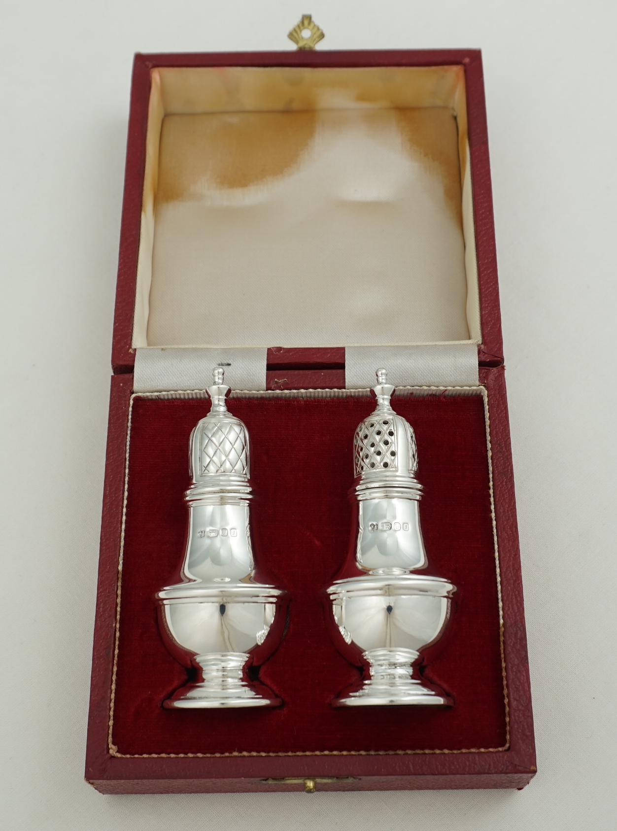 DESCRIPTION | Useful and cased little solid sterling silver salt and pepper caster. Ideal for boiled eggs or at a picnic. Nice detail is a pair of nipples to the base rim of each top that prevent accidental catastrophic spillage. |