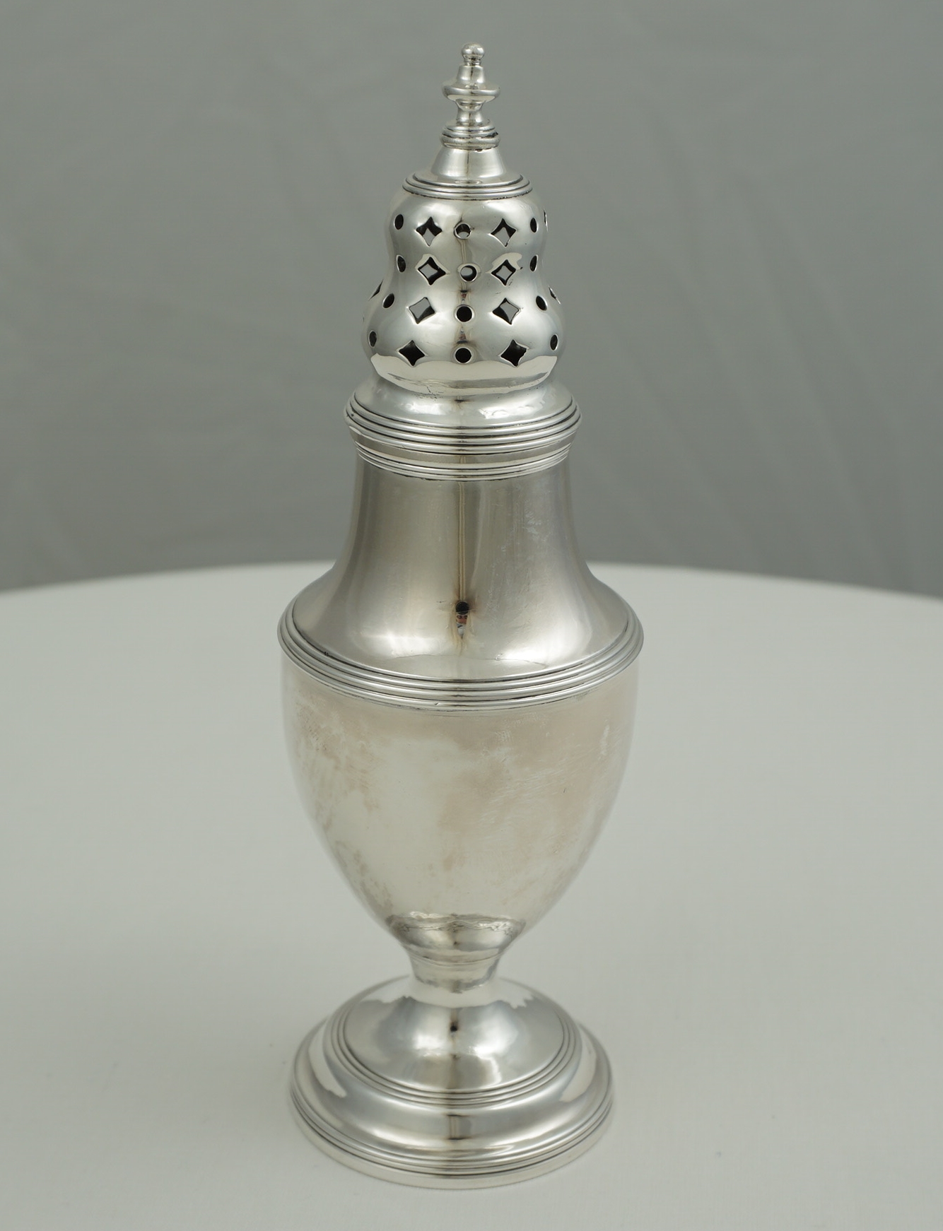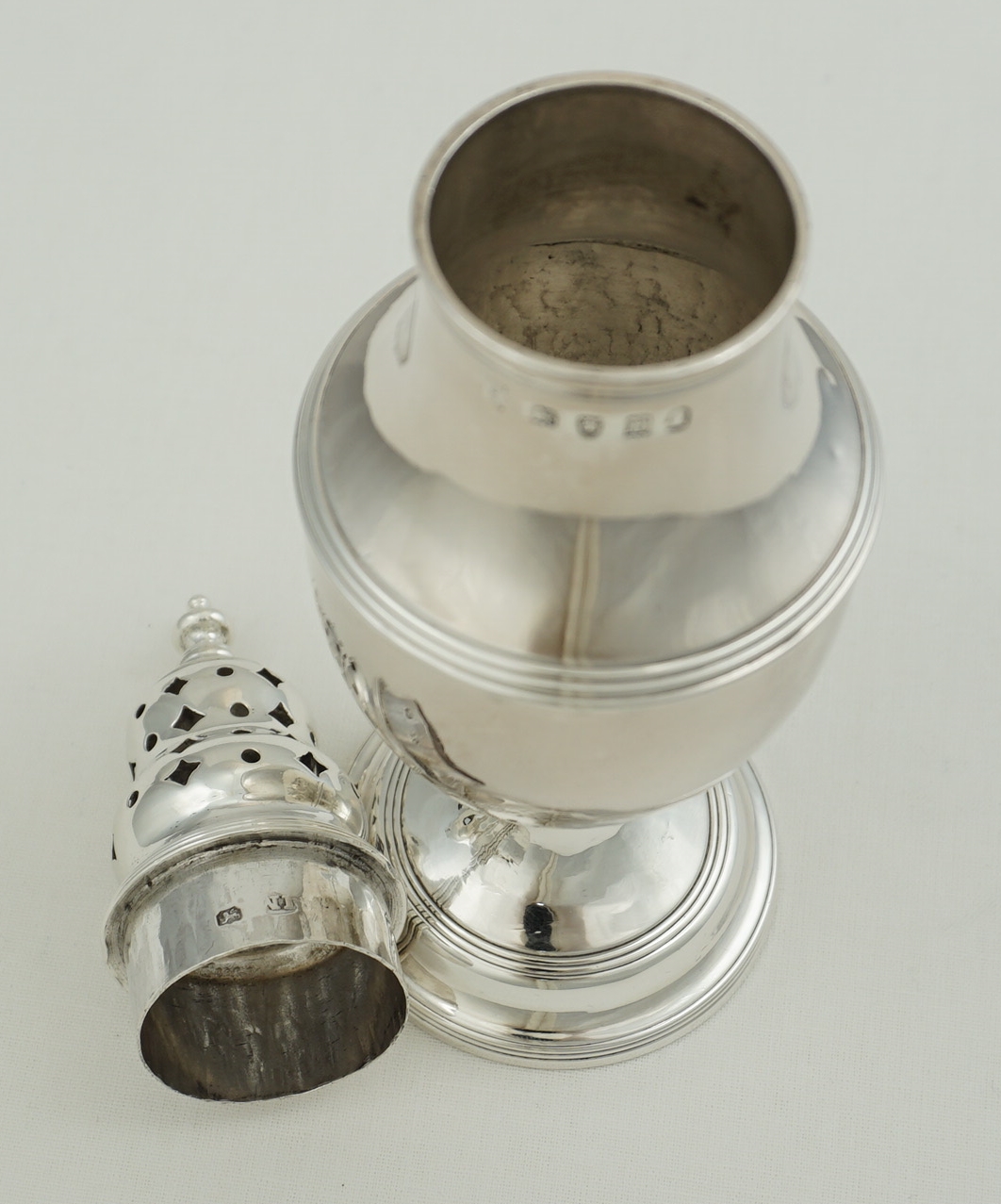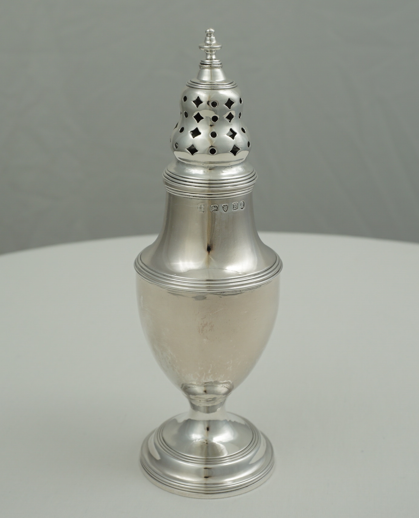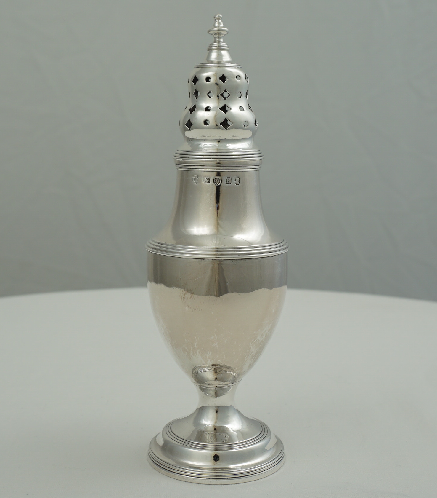 DESCRIPTION | Large and useful antique English Georgian solid sterling silver spice caster, correctly hallmarked to the body and pull-off top. Unusually the top is still an excellent fit so no danger of an involuntary spice dump. |