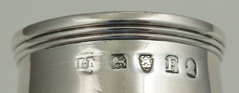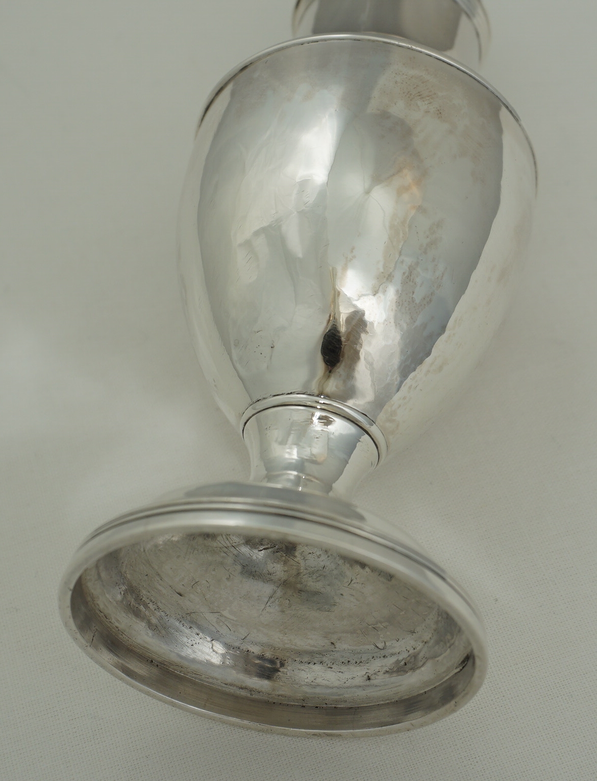 CONDITION | now good but with some fire grey and evidence of past silversmithing including hammer marks and a patch of tiny surface file marks, small repair lower body visible from the inside and a tiny thin spot around the repair (image 4 to the left of the black lens reflection), couple of tiny bumps to top. The hundreds of tiny hammer marks will give an attractive twinkle if used by candle light. |
