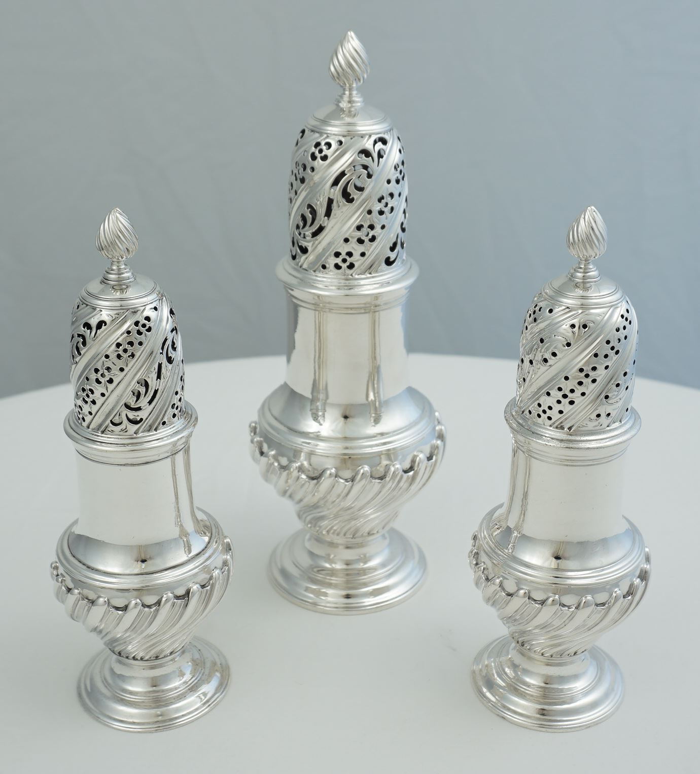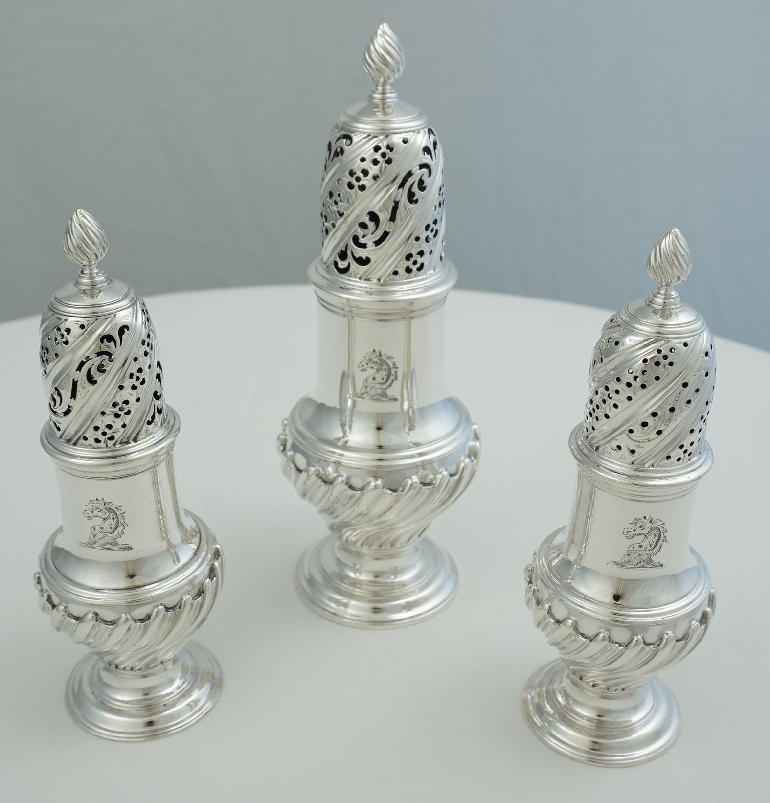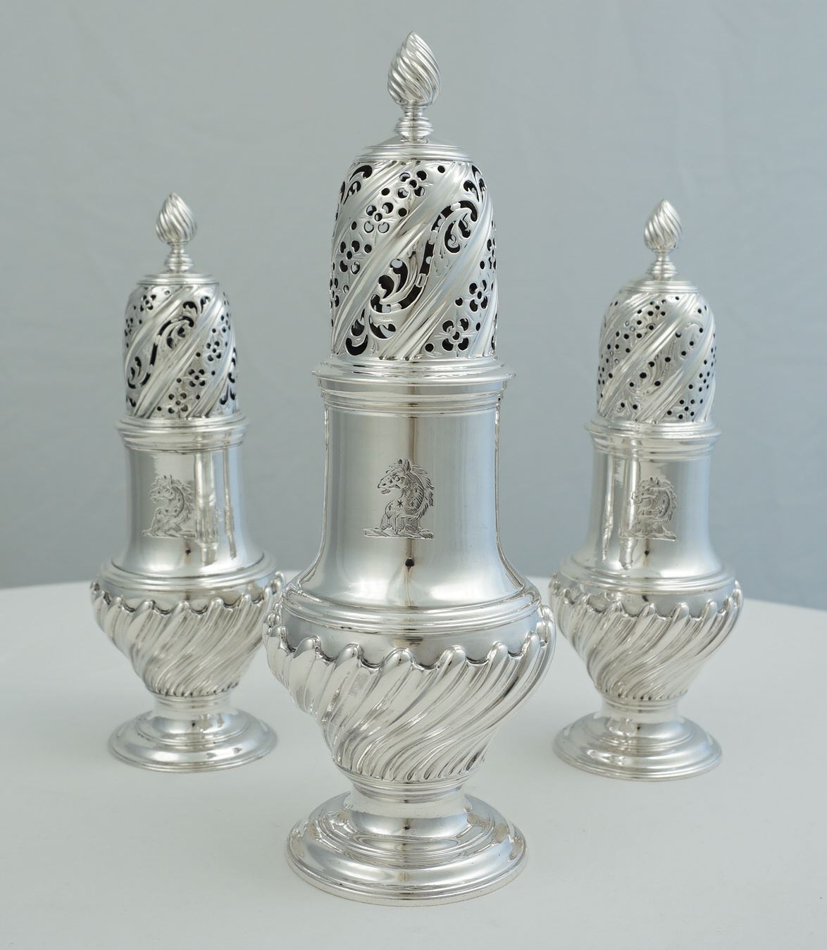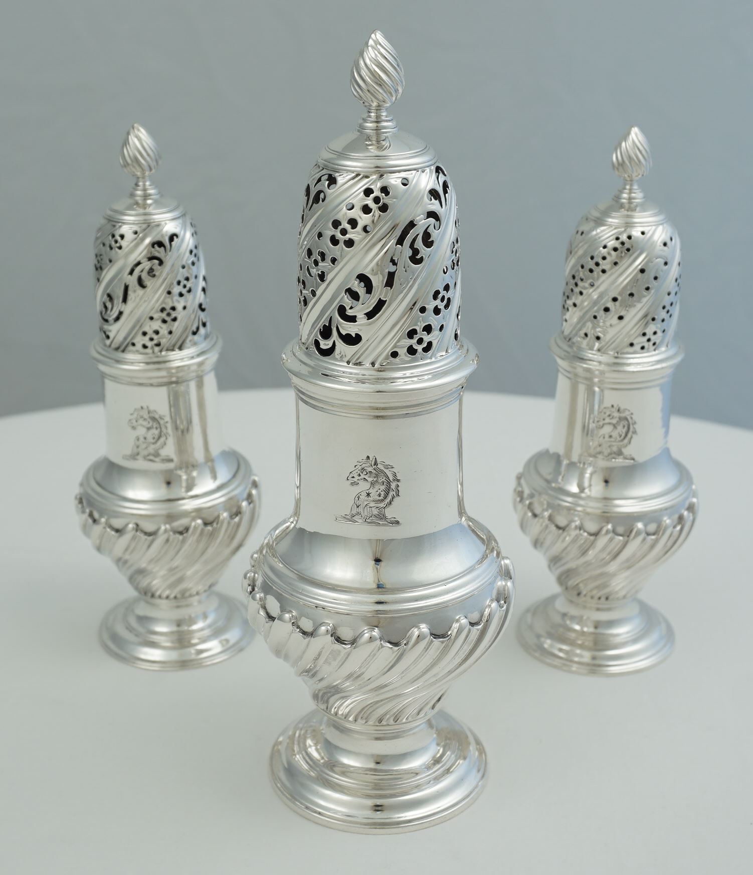 DESCRIPTION | Magnificent and rare suite of three antique English Georgian solid sterling silver casters in wonderfully good and original condition. The clearly hand-hammered insert for one is a subject of some debate. The purpose is to reduce the flow from the caster and it is my belief that these were made later, probably as improved mechanical milling enabled condiments to be ground finer. If Samuel had made it I think he would have given it a less rustic finish, marked it with his mark and was legally required to hallmark it too. Some say that as the blank is fixed into the top, an integral part, it must be original to the piece. To those people I say "your liner is stuck with old condiment, silver polish and is likely wedged by dents too, try a soak in warm, soapy water". Such an original suite of three with fully matching hallmarks and crest are rare. To find a suite in this fantastic original condition is perhaps a once in a lifetime event. I know that I had been looking for over twenty years to find examples this good. The fluted decoration to the lower body only and finishing below the girdle and not touching it is exactly right. I see so many with later decoration that goes right up to the girdle and continues throughout the upper body too. In particularly bad examples of Victorian overly exuberant clobbering I have see a ring of decoration to the pedestal bases too. A nice feature of construction can be seen from beneath, a rather thick silver tube within the foot. This adds much strength but the main purpose was to enable Samuel to align the separate sections before soldering. It has worked perfectly, all pieces stand without lean and although the solder within appears substantial and a bit messy the result on the outside is pure genius. You will need a good lens to find the joins and even then you will struggle if you do not know exactly where to look. Samuel's skill is breathtaking. |