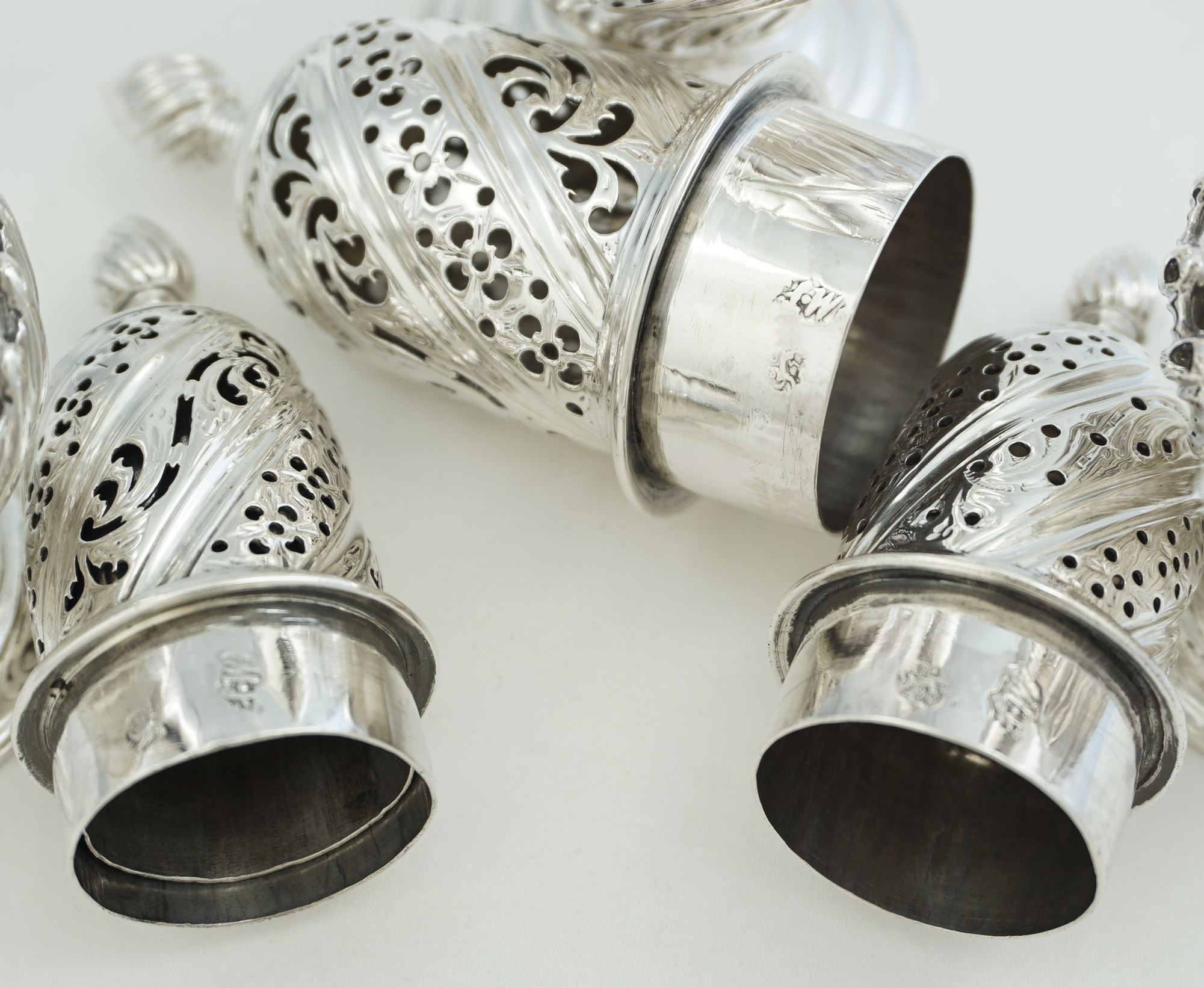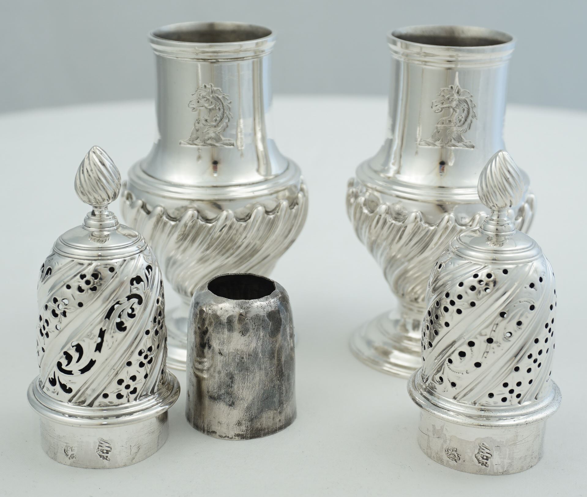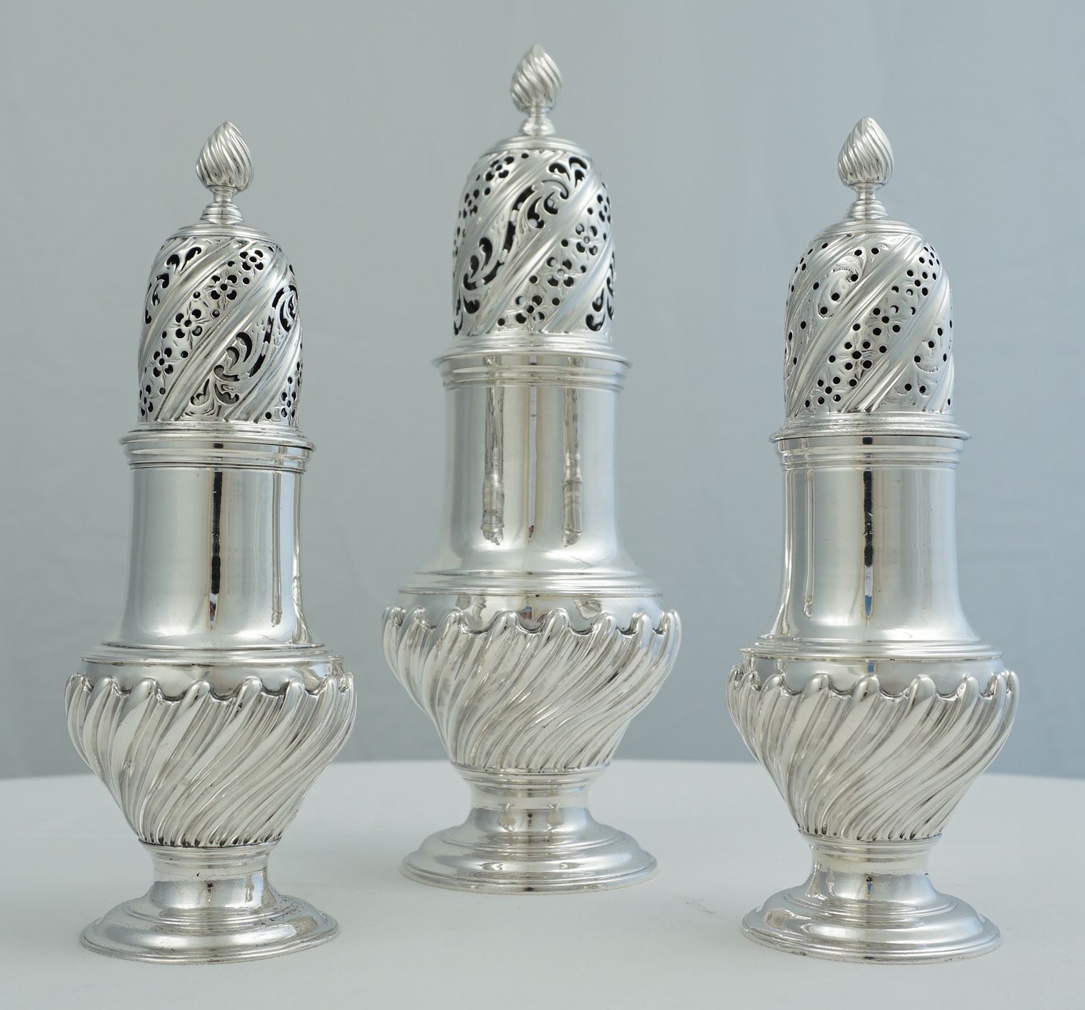 SILVERSMITH | Samuel Wood, specialist caster maker from a long line of the same. Beautifully struck marks perfectly preserved. The tops are all clearly and correctly marked according to the convention of the day with lion passant and Samuel's mark only. |