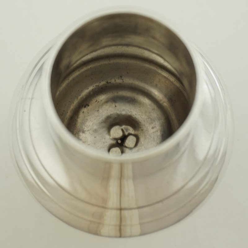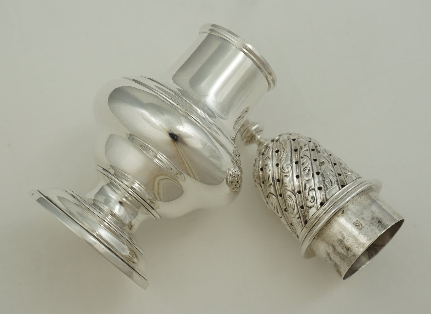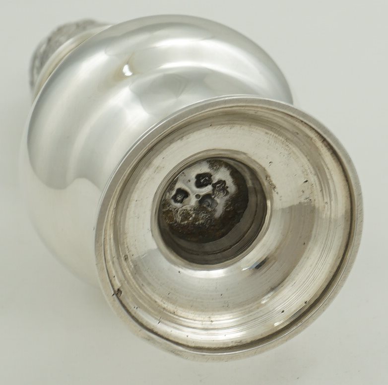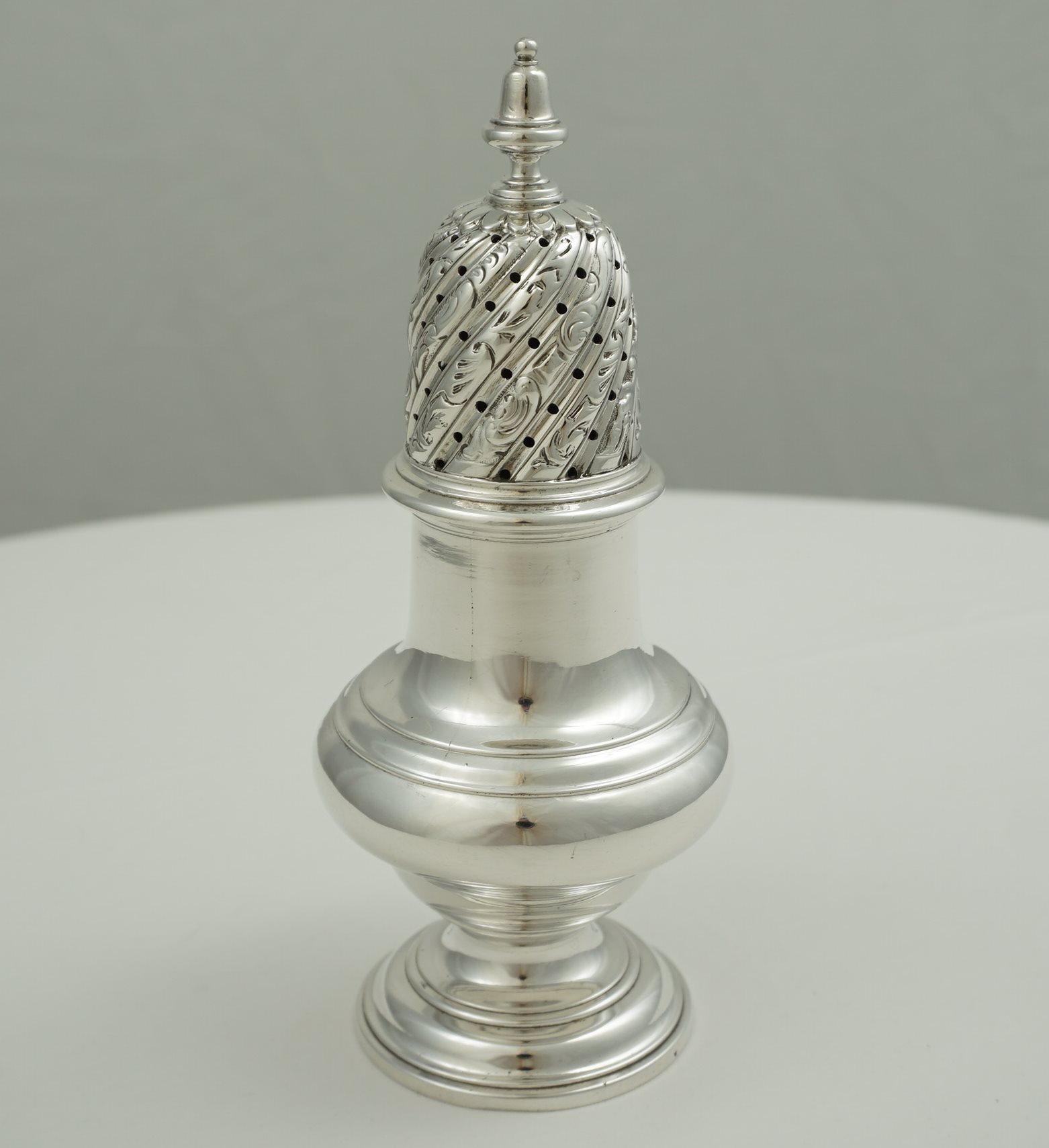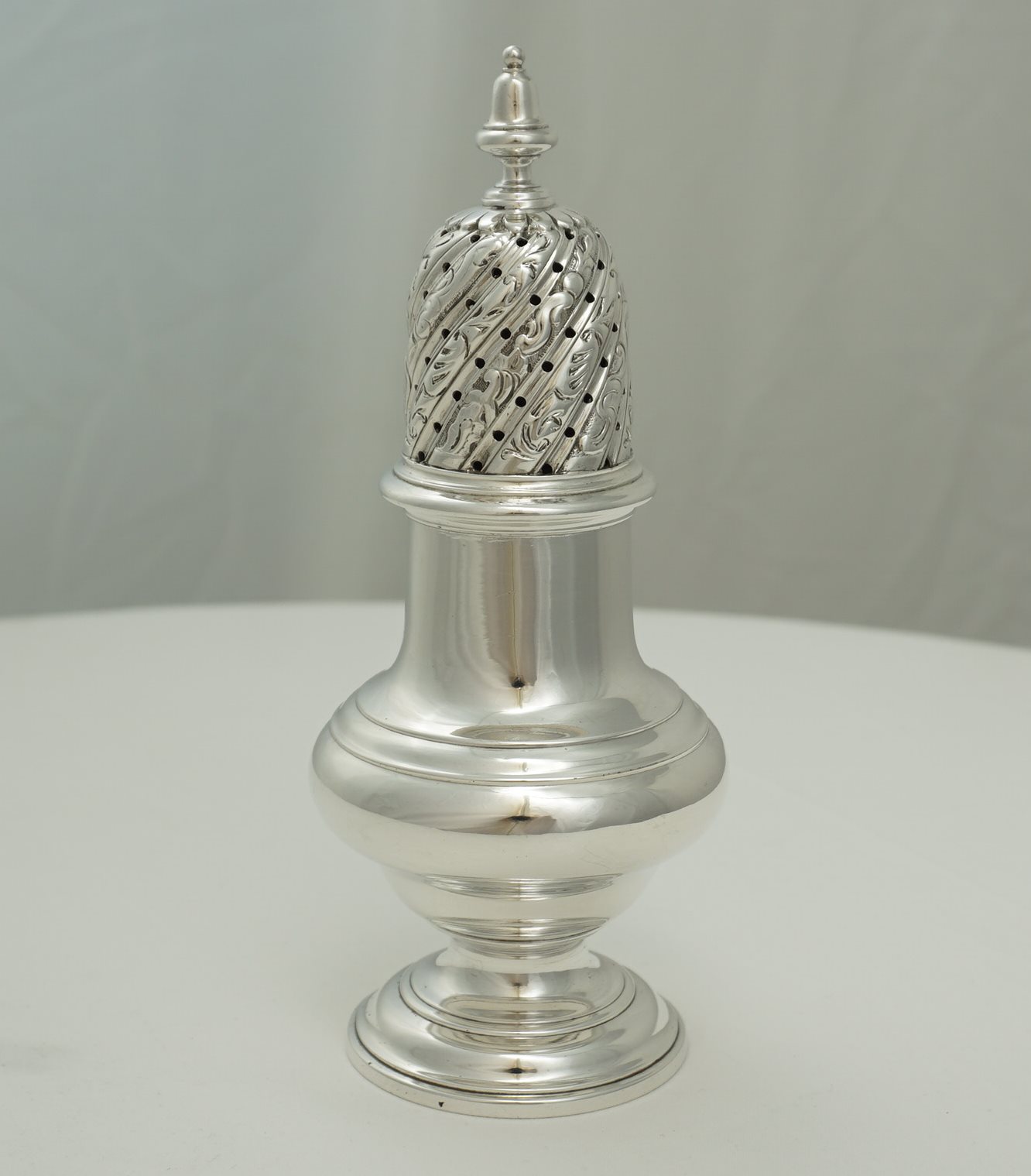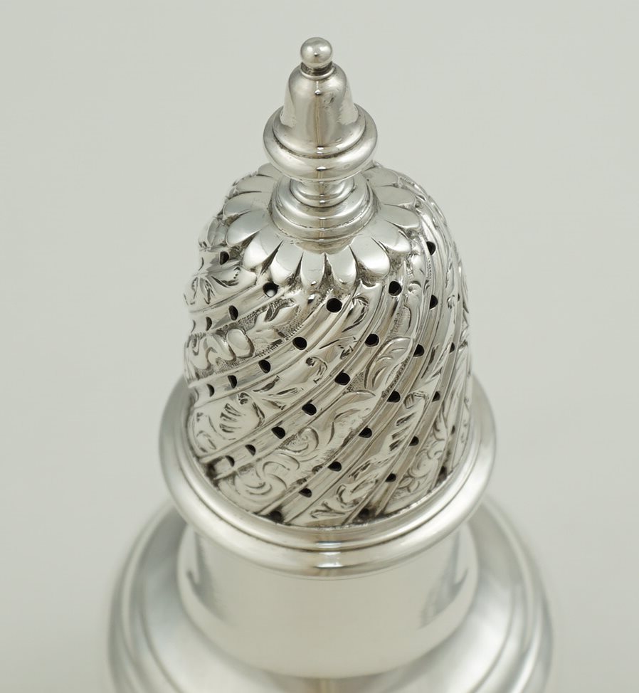 DESCRIPTION | Highest quality antique English Georgian solid sterling silver caster with perfectly fitting pull off top with beautiful detailing. I particularly like the unusual flower petal ring below the acorn finial that is both a lovely feature and a practical way of adding strength to a vulnerable area. Wonderfully thick silver throughout, beautiful design and exceptionally good condition. If you are to only ever to buy one Georgian baluster caster then I recommend this example above all others. If you already have some casters in your collection then be careful for this one will put your others to shame. |