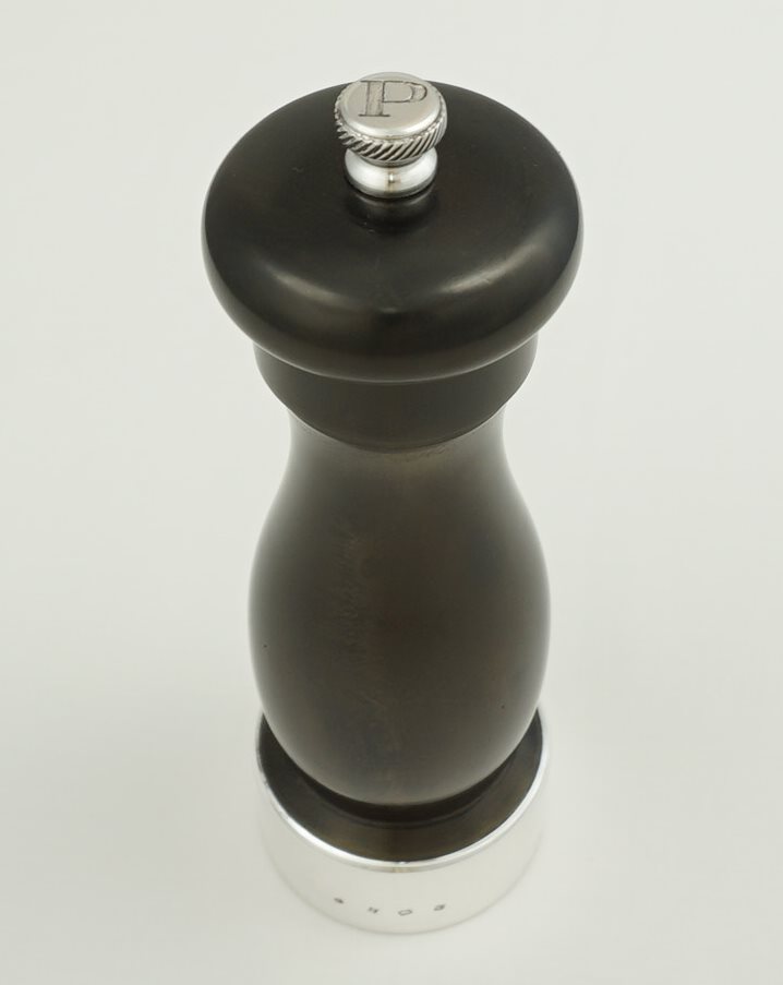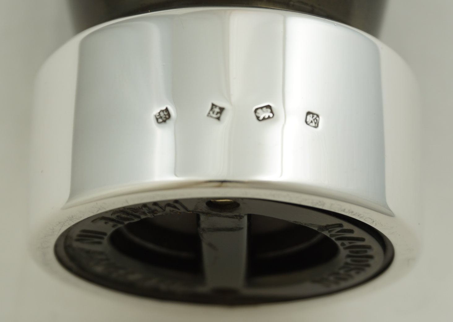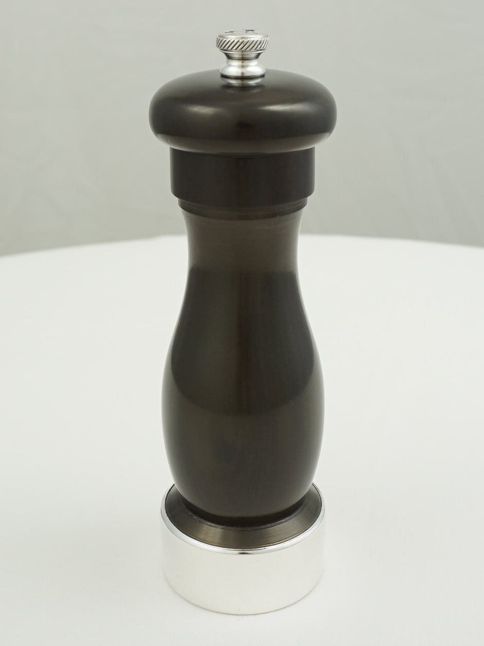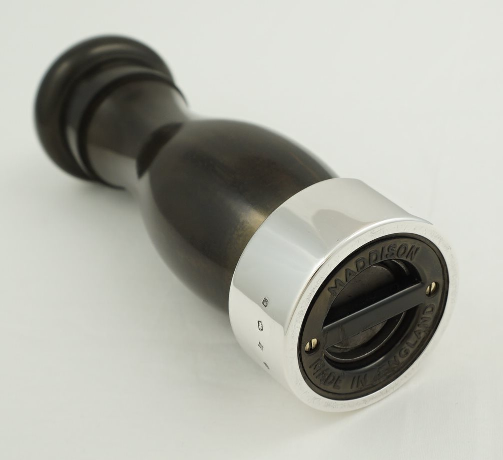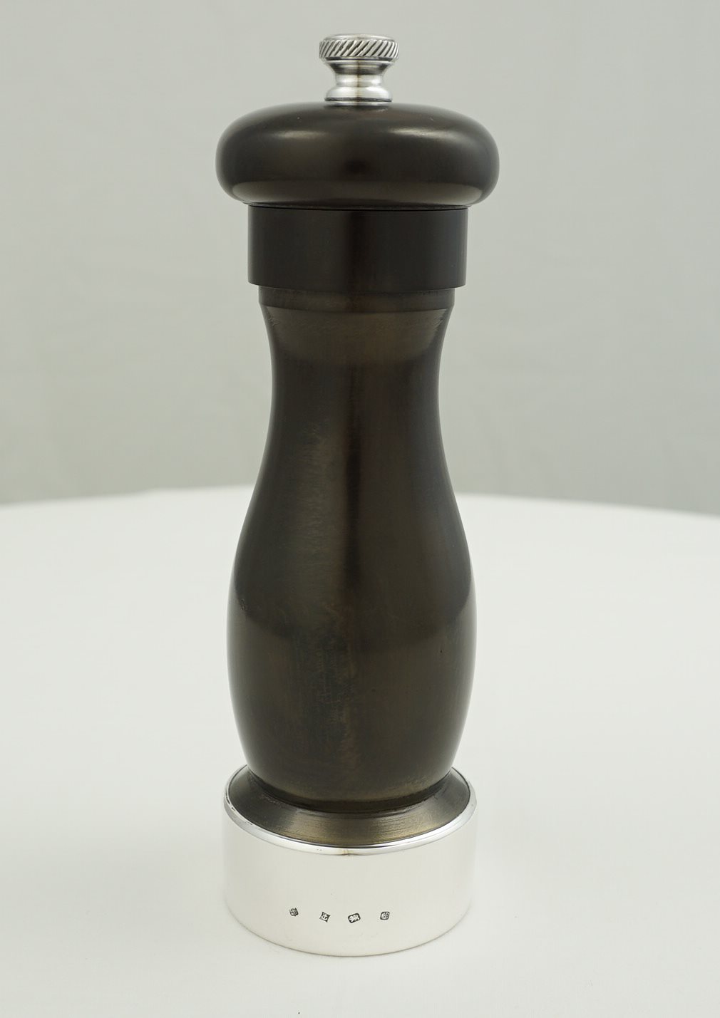 DESCRIPTION | Good quality vintage English sterling silver mounted wood bodied pepper grinder. The size of the ground particles is controlled by turning the knurled finial. |
