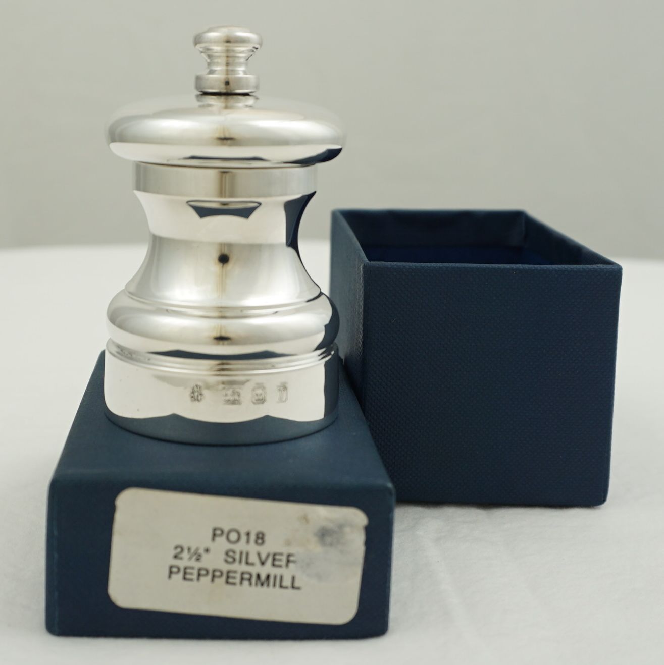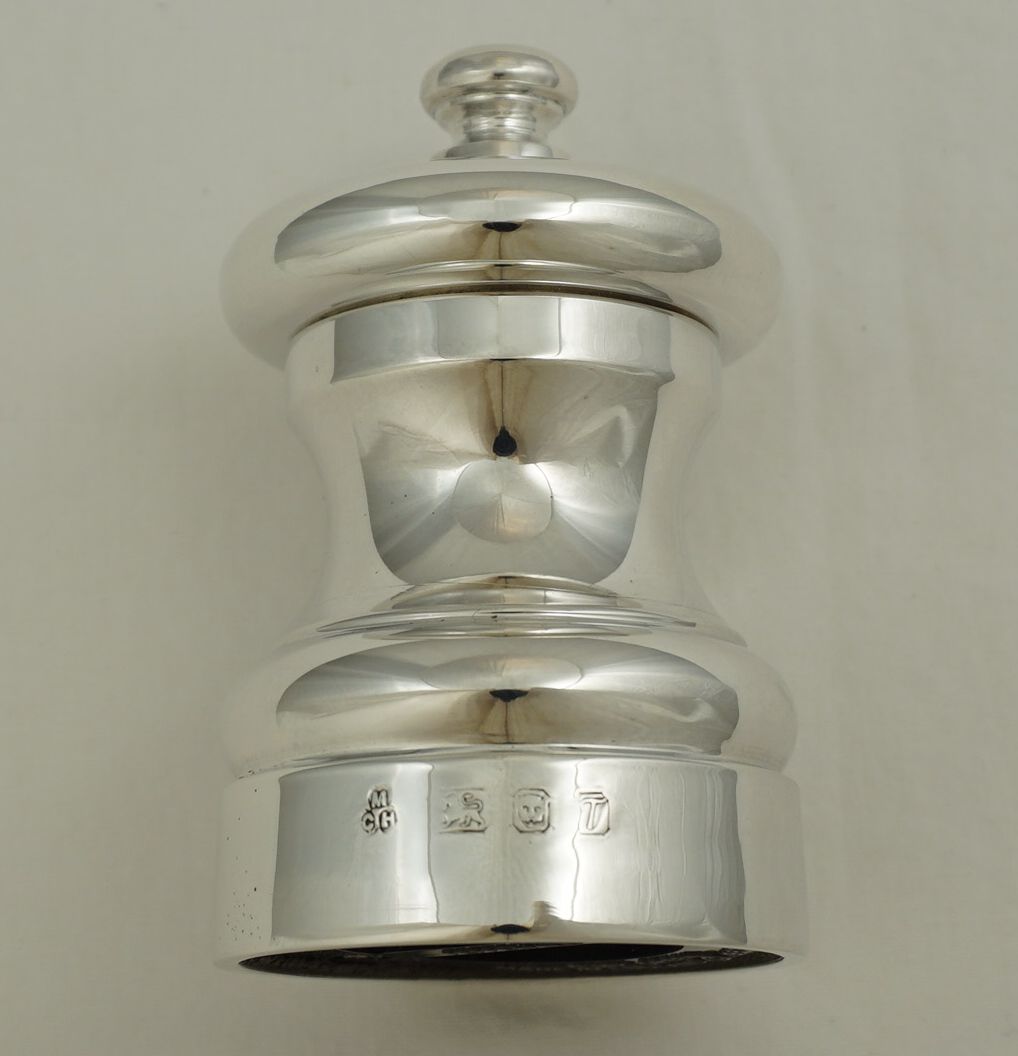 | DESCRIPTION | Boxed, 'as new' unused English compact sterling silver grinder, ideal for daily use, special occasions, or adding to a luxury picnic hamper. These pepper mills use a carbon steel mechanism and have an acrylic lining to prevent corrosion. Adjustable from fine to coarse grind. Hersey & Son currently sell this pepper mill for £210. |