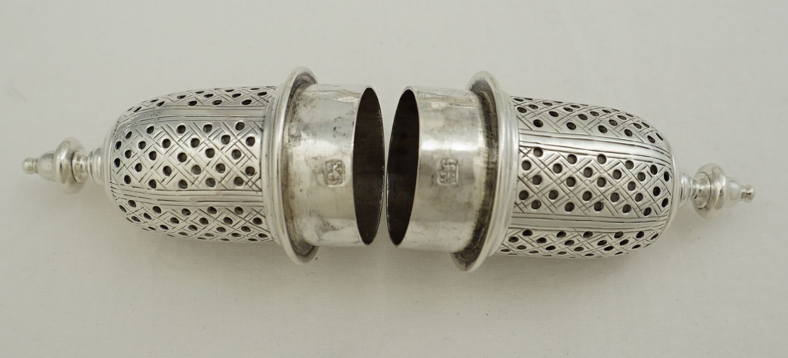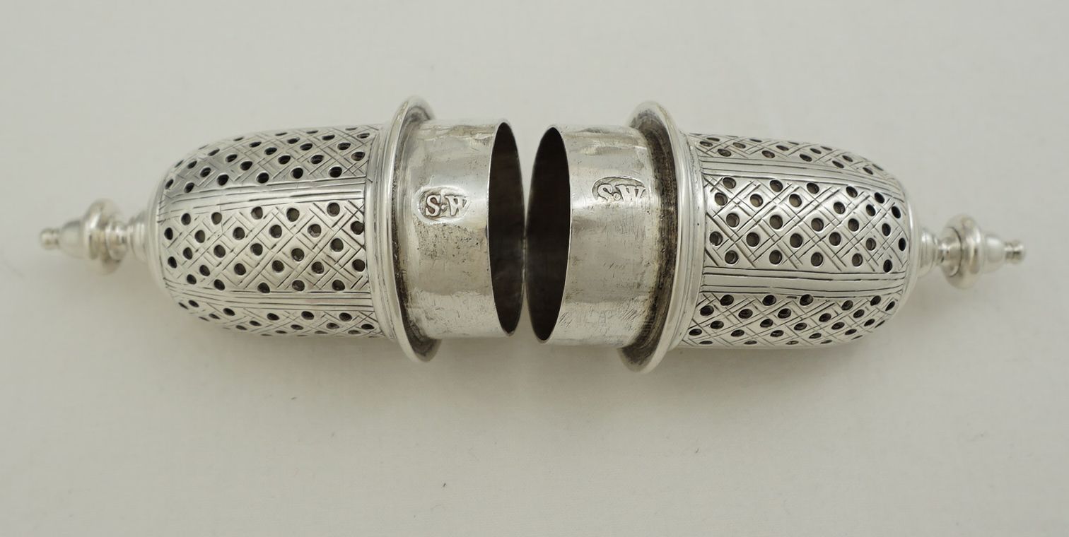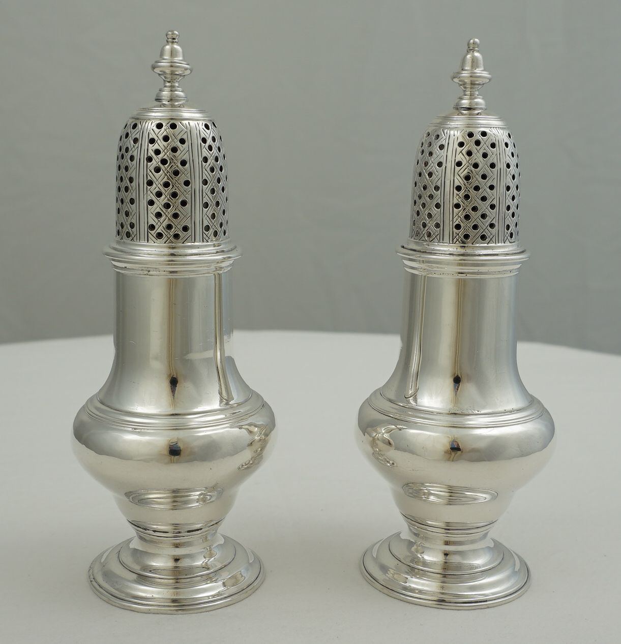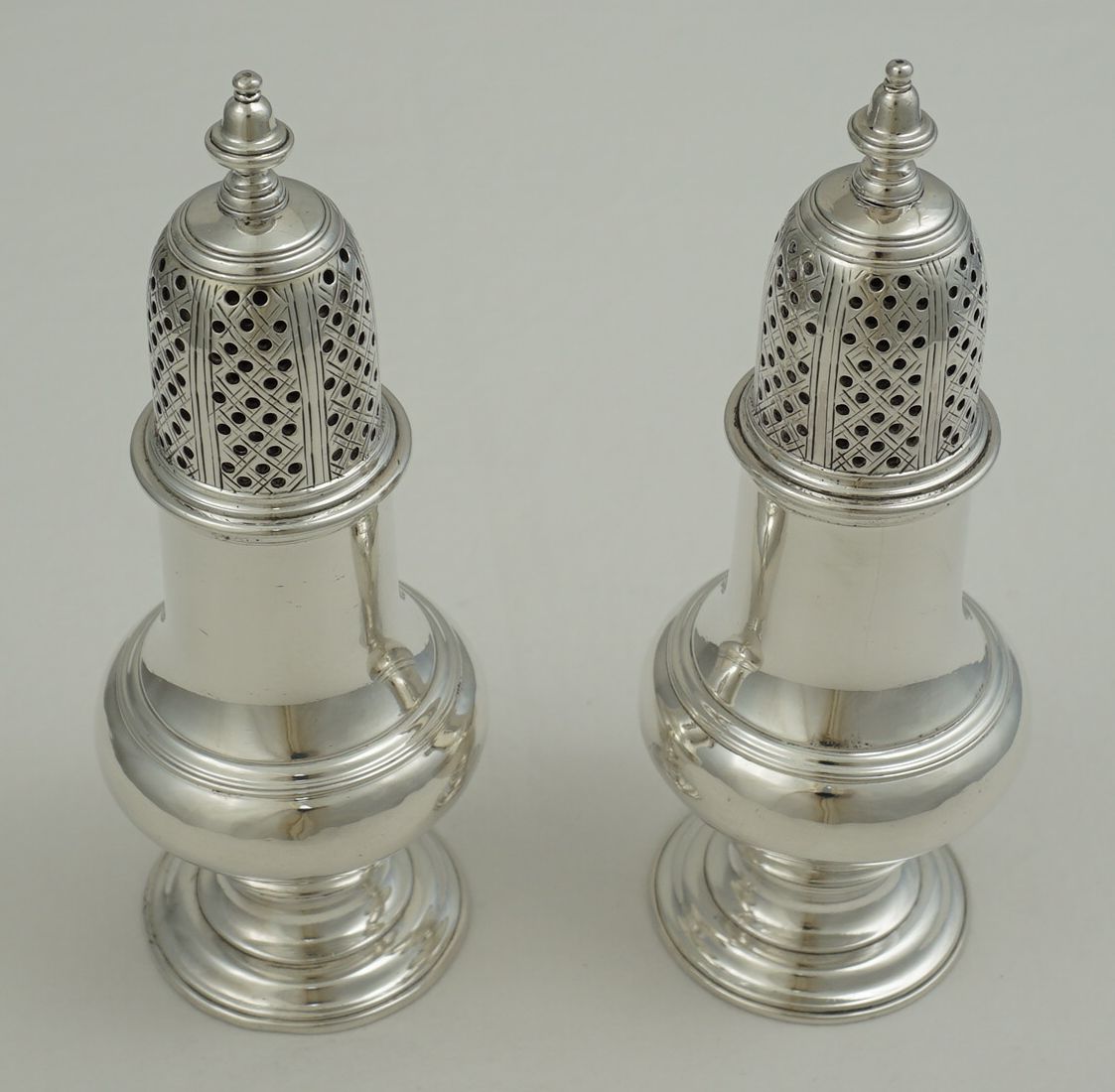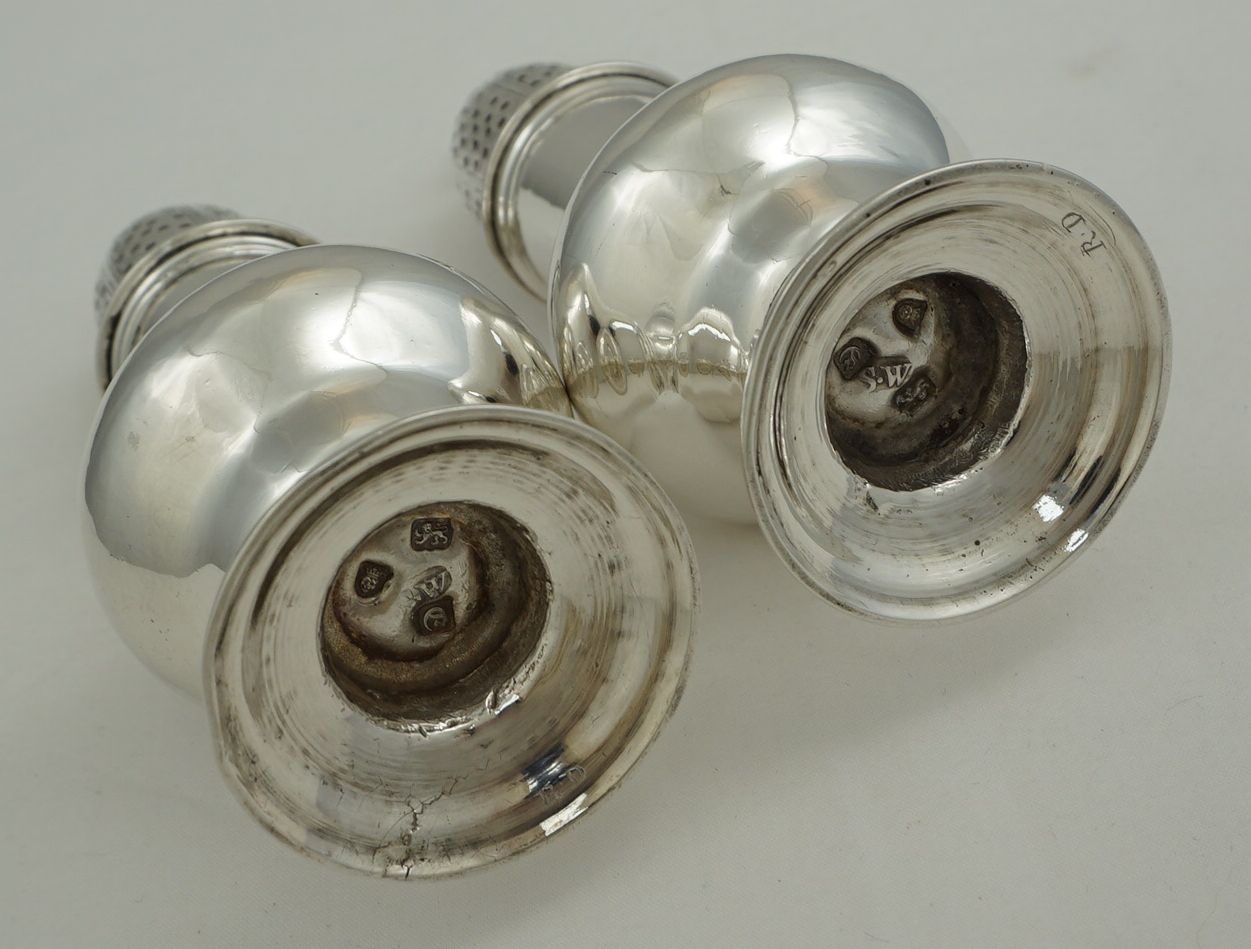 | DESCRIPTION | Exceptionally good pair of antique English Georgian solid sterling silver casters fitted with reducing sleeves within the tops. About one in sixty of these casters have reducing sleeves fitted and there is some debate about their originality. My belief is that they were fitted later when finer ground spices became more widely and cheaply available. The larger holes dispense far too much if the spice is finely ground such as modern pepper. The sleeves completely blank off alternate pierced panels and are pierced with smaller holes on the others thus making them suitable for modern use. No engraving to the bodies and a very discreet 'R·D' under the bases that are likely to be original. All pieces are correctly marked with very clear and well-struck hallmarks. |