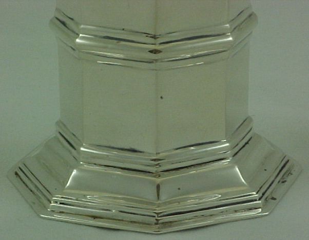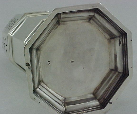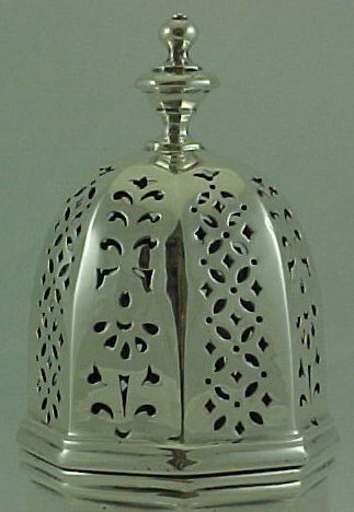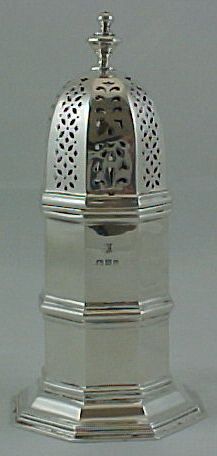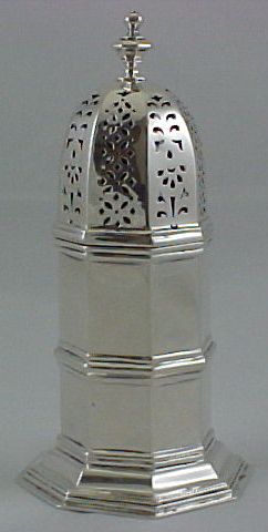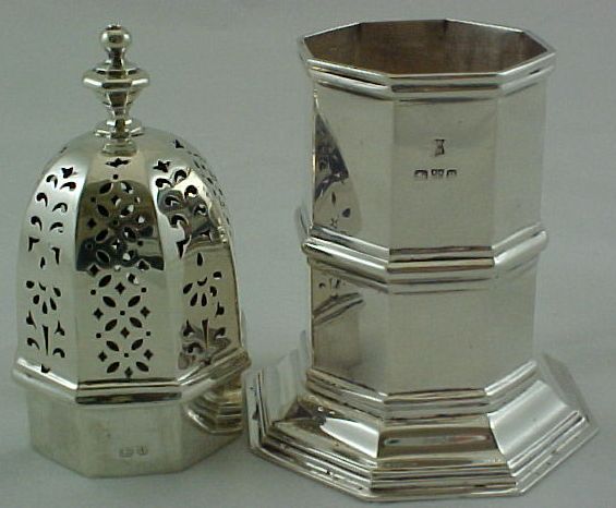 Octagonal Victorian silver caster correctly marked to the base and lid. Both pieces are also marked with matching pattern numbers. | ||
