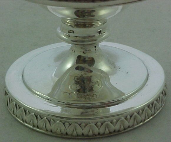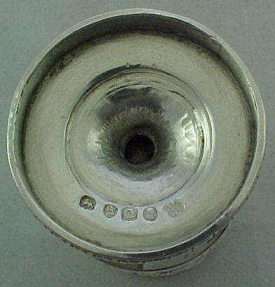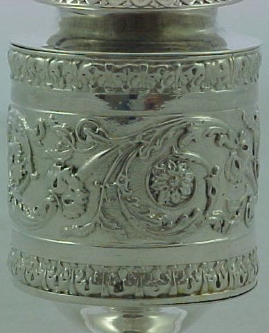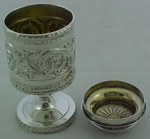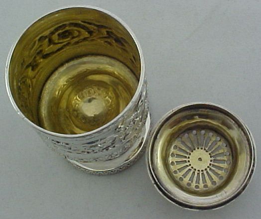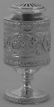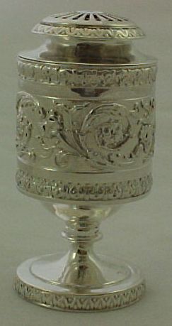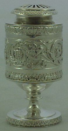 Georgian silver caster or pounce pot with a gilded interior, cast and embossed decoration and a lightly engraved crest to the foot. | ||