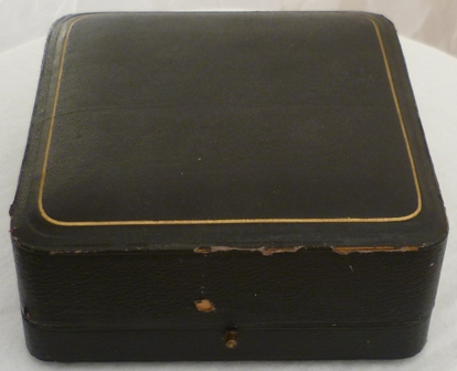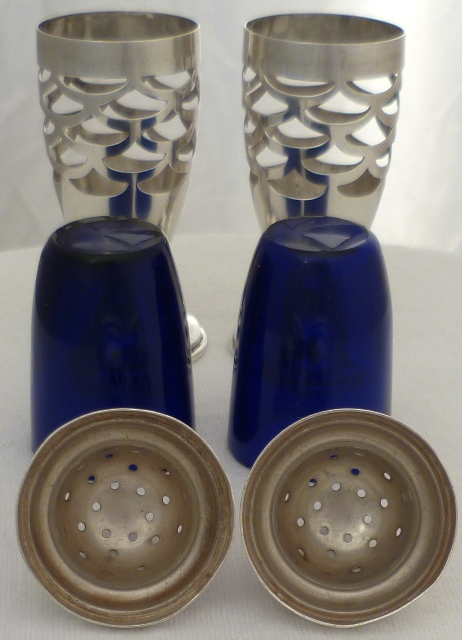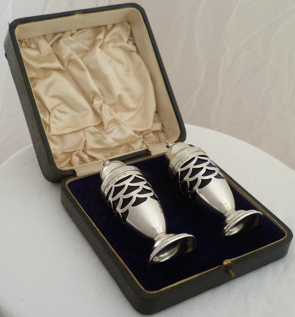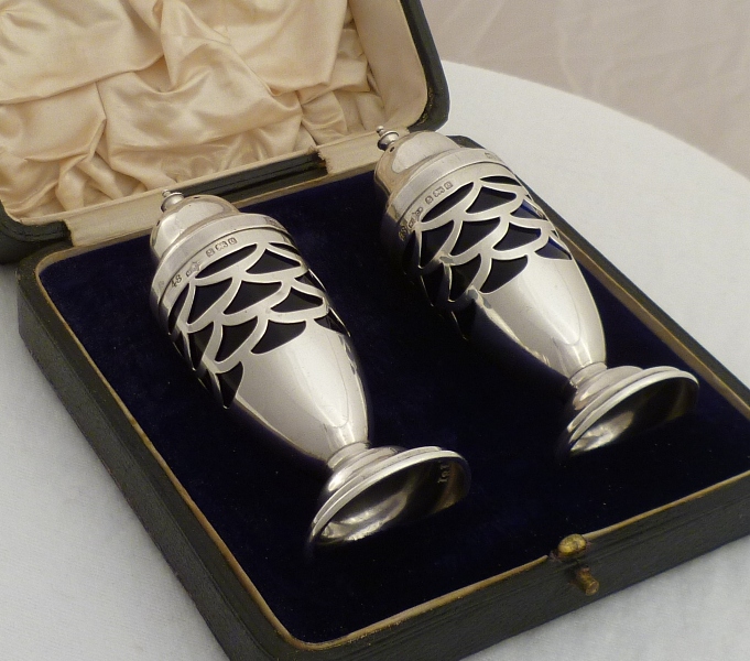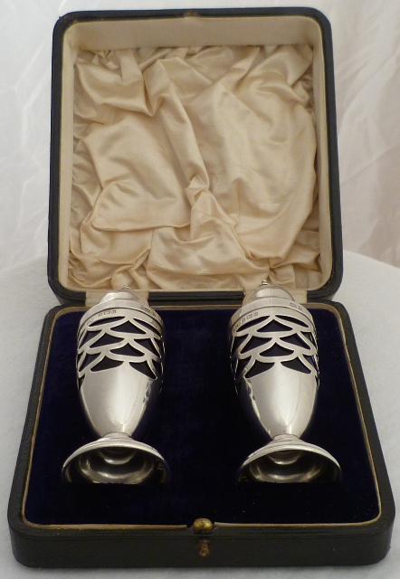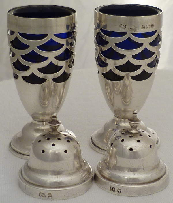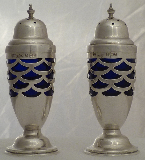 Pair of Edwardian silver vase shaped pepper casters on domed circular pedestal bases. The pierced pull off tops with vase finials and the bodies decorated with fish scale piercing. The blue glass liners are fine quality, excellent condition and are likely to be original. The original gilt tooled leatherette covered fitted case is lined with silks and velvet. |