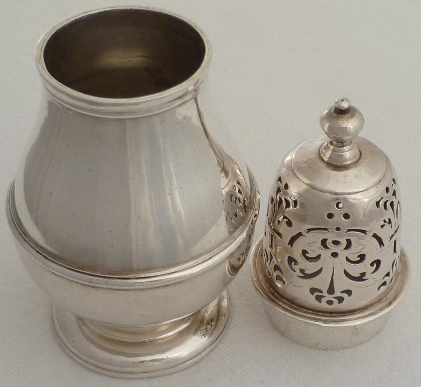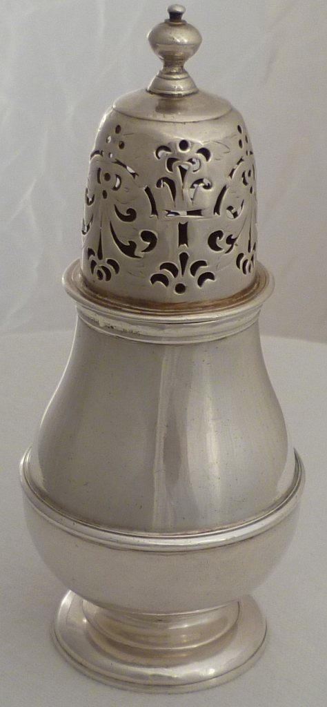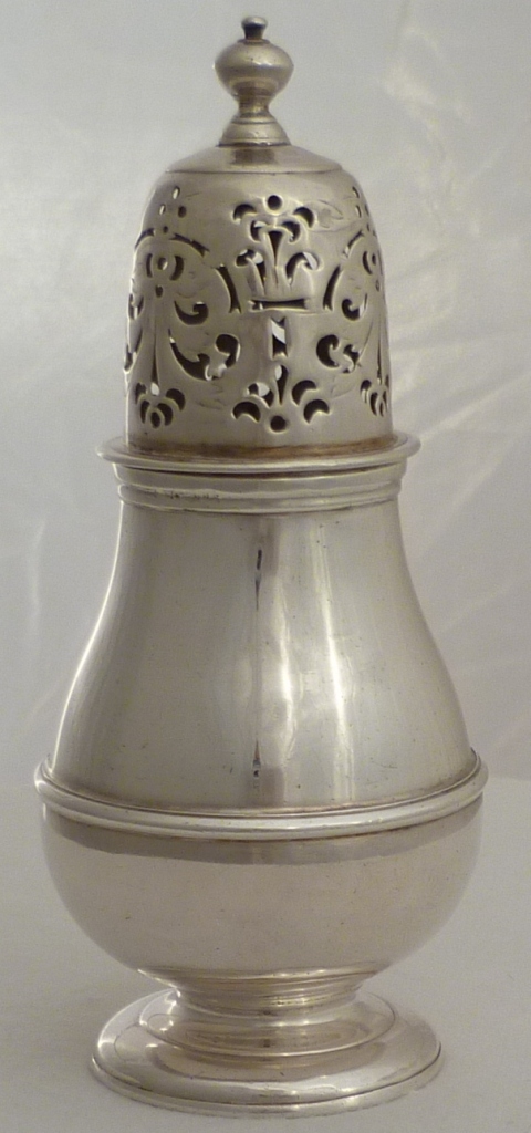 George I Britannia standard silver caster, the plain pyriform body on a low, circular, ring decorated foot, the pull-off cover with intricate pierced decoration accentuated by engraving and a large cast baluster knop finial. |