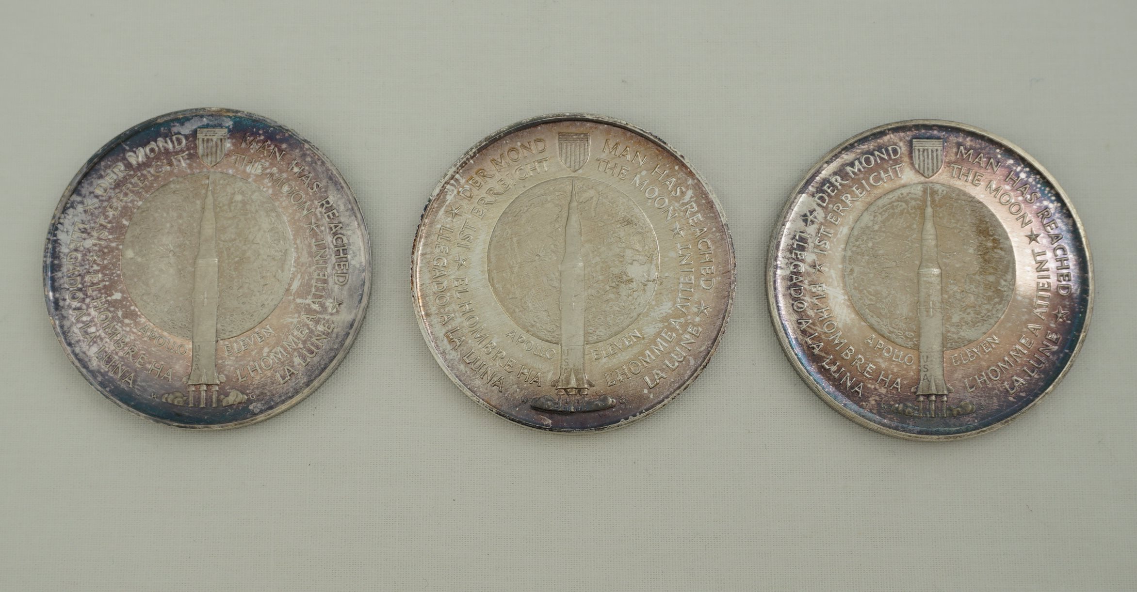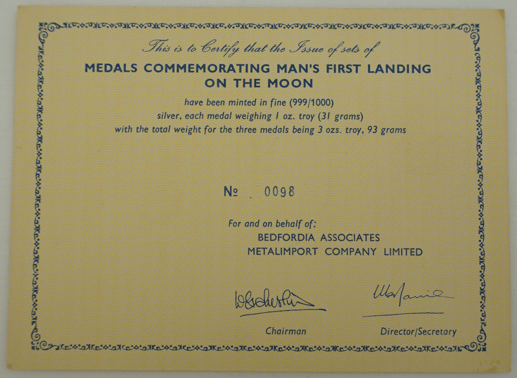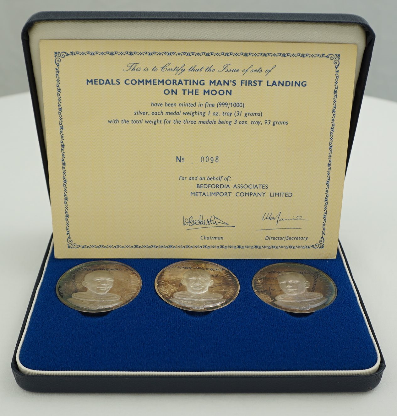 DESCRIPTION | Cased set of three solid fine silver medals commemorating man's first landing on the moon complete with original certificate no: 0098 that explains everything. Original owner's name to outside of case. |