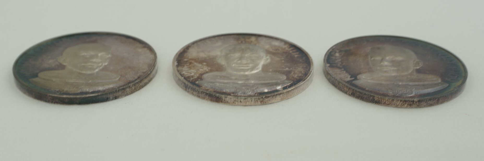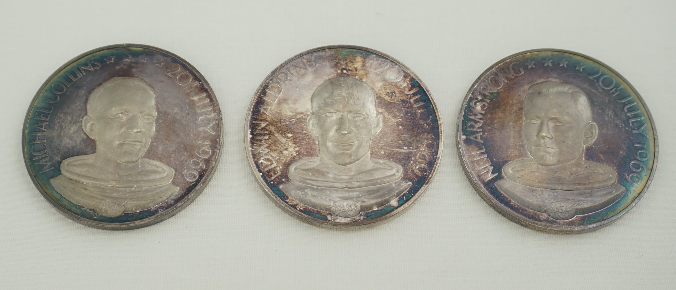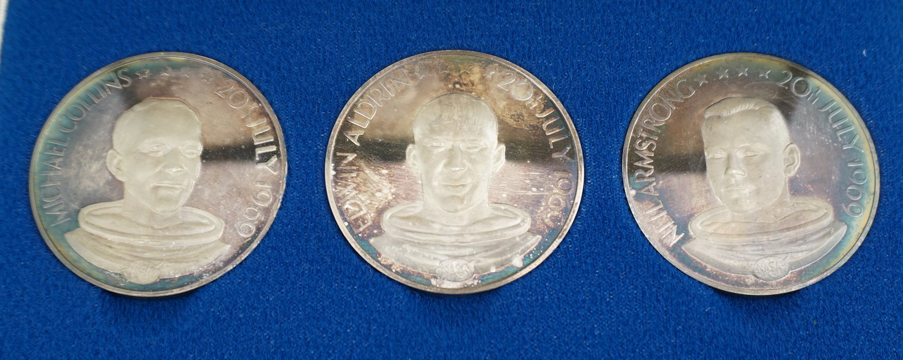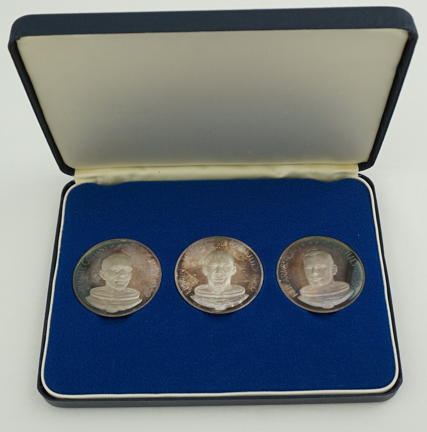DESCRIPTION | Cased set of three solid fine silver medals commemorating man's first landing on the moon complete with original certificate no: 0098 that explains everything. Original owner's name to outside of case. |
