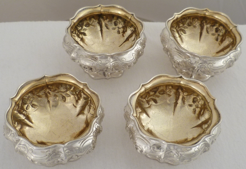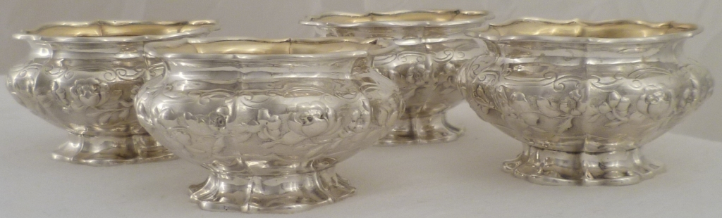 Impressive set of four large William IV silver gilt pedestal salts each with a central band of floral and foliate decoration below a C scroll border. |