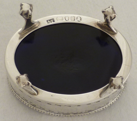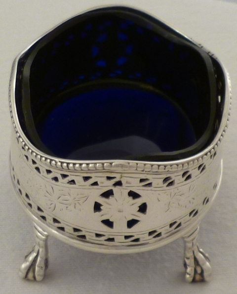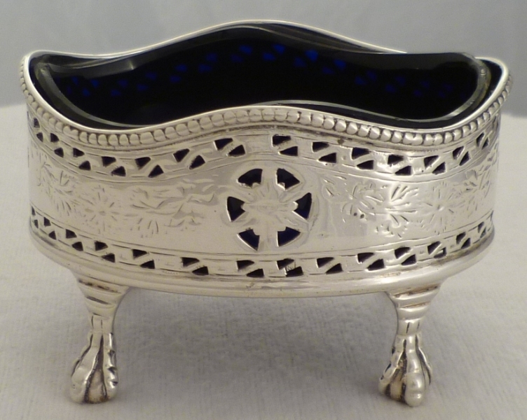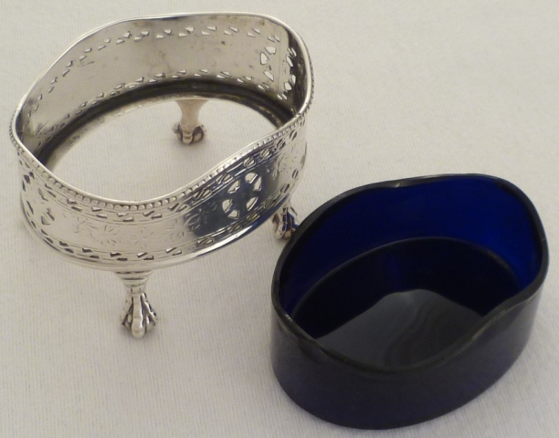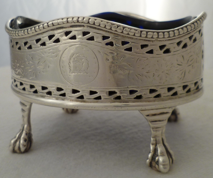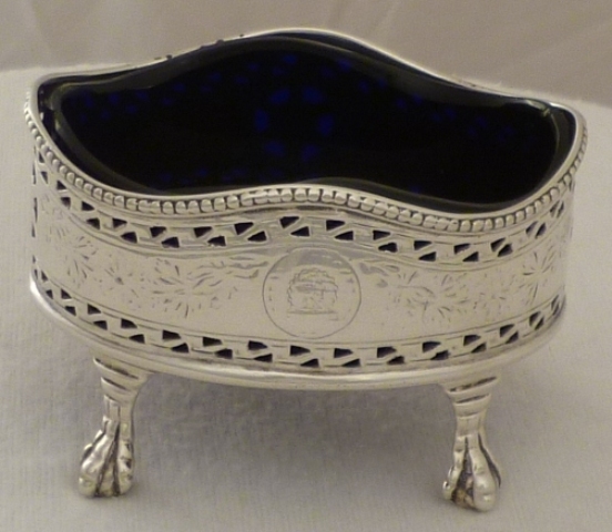 Oval Georgian silver salt with pierced and engraved decoration, engraved crest, four ball and claw feet and a shaped blue glass liner. |