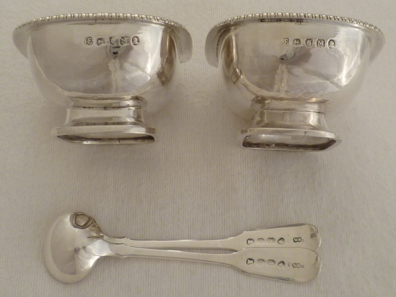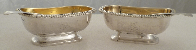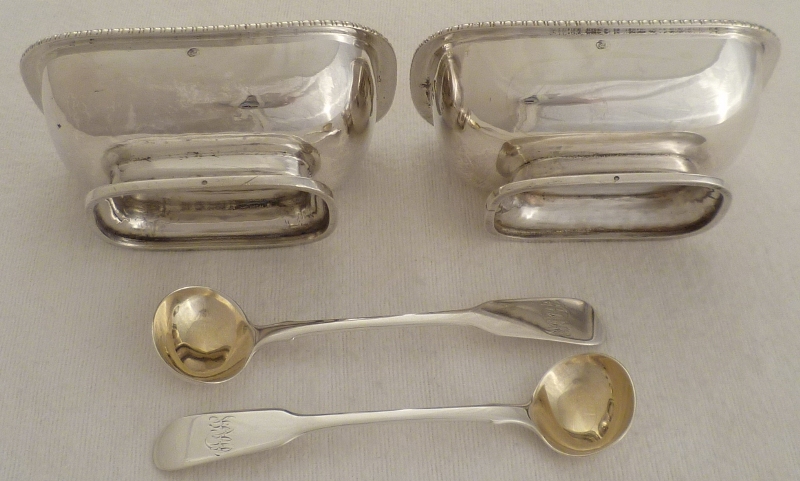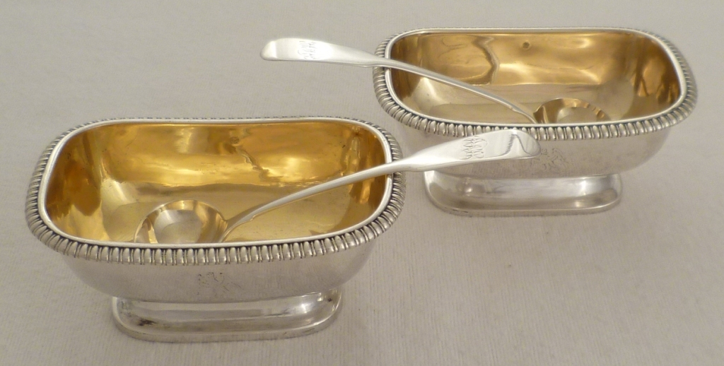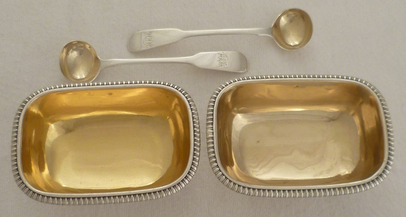 both salts have a hefty, solid feel, the spoons less so. One salt retains the original mercurial gilding whilst the other has been recently gold plated to match as closely as possible |