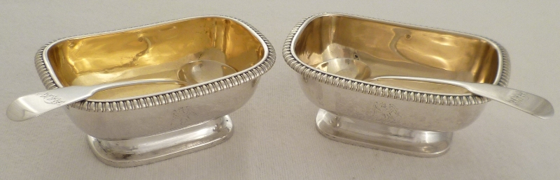 Pair of Georgian silver pedestal salts with gadroon top rim decoration, gilded interiors and a crest engraving to one side. Also included is a free pair of silver Fiddle pattern salt spoons with monogram engraving and gilded