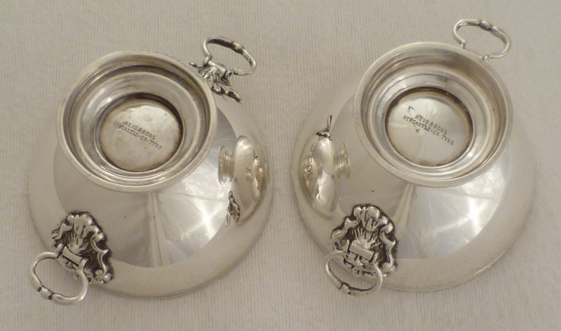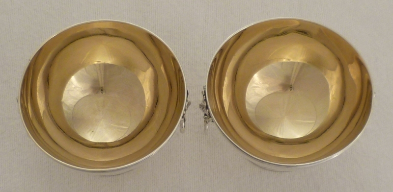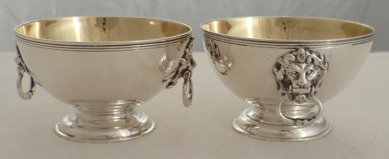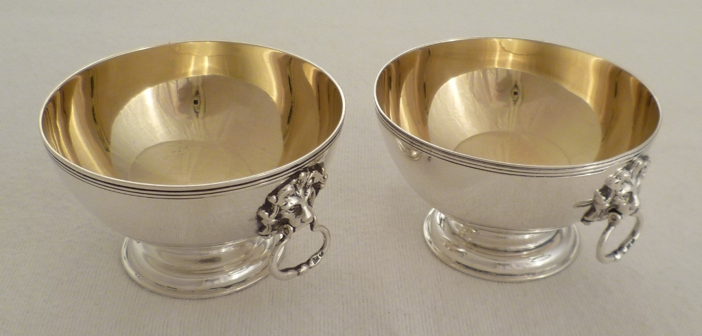 DESCRIPTION | Fine pair of circular silver gilt pedestal salts with applied thread decorated top rims, beautifully gilded interiors and moving lion mask handles. |