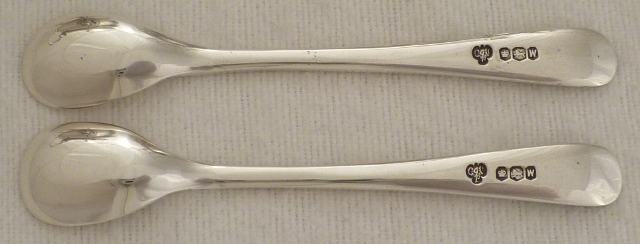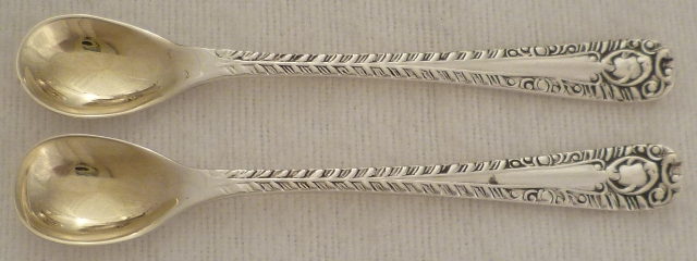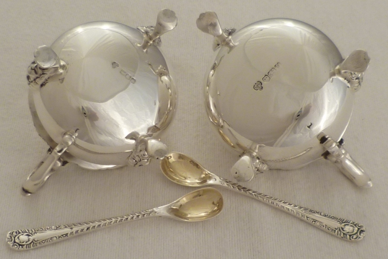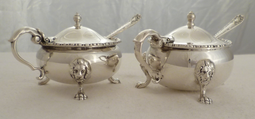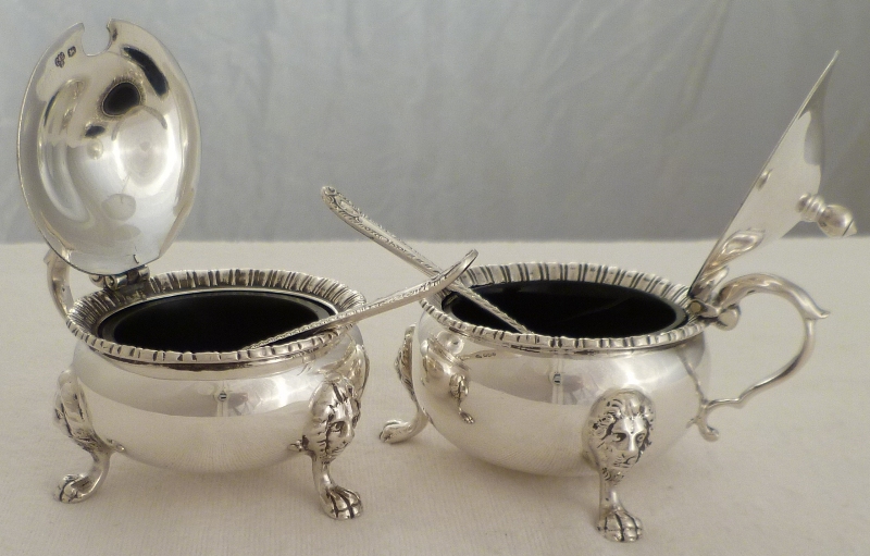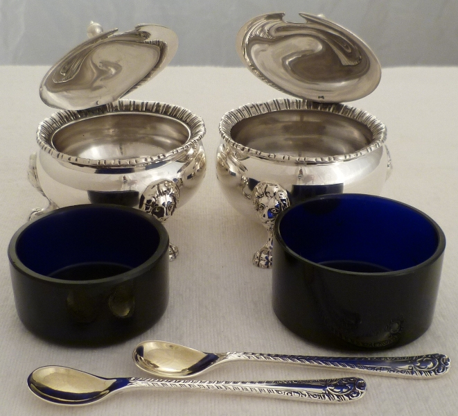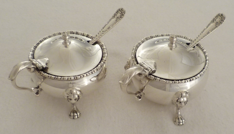 DESCRIPTION | Two near identical silver mustard pots with leaf capped and scrolling handles, lion mask and paw legs, bespoke blue glass liners and silver gilt rococo ladles. |