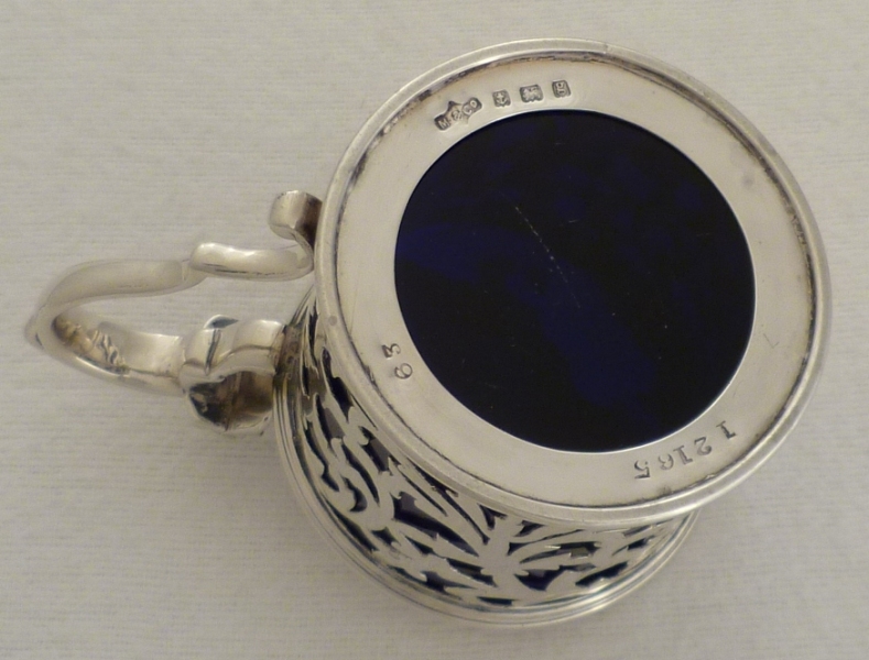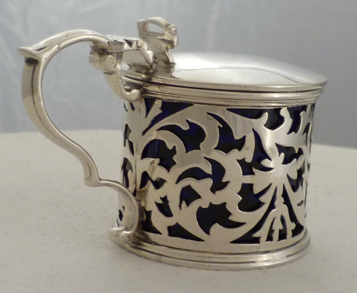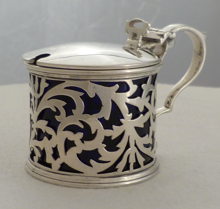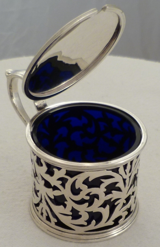 DESCRIPTION | Fine Edwardian pierced silver mustard pot with blue glass liner |
