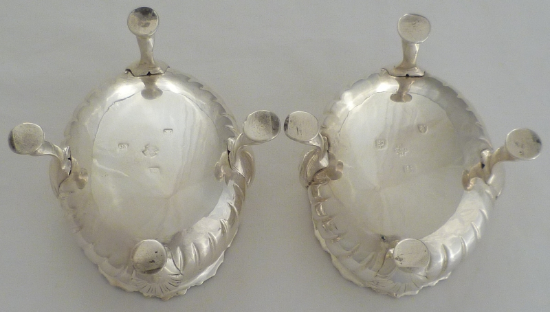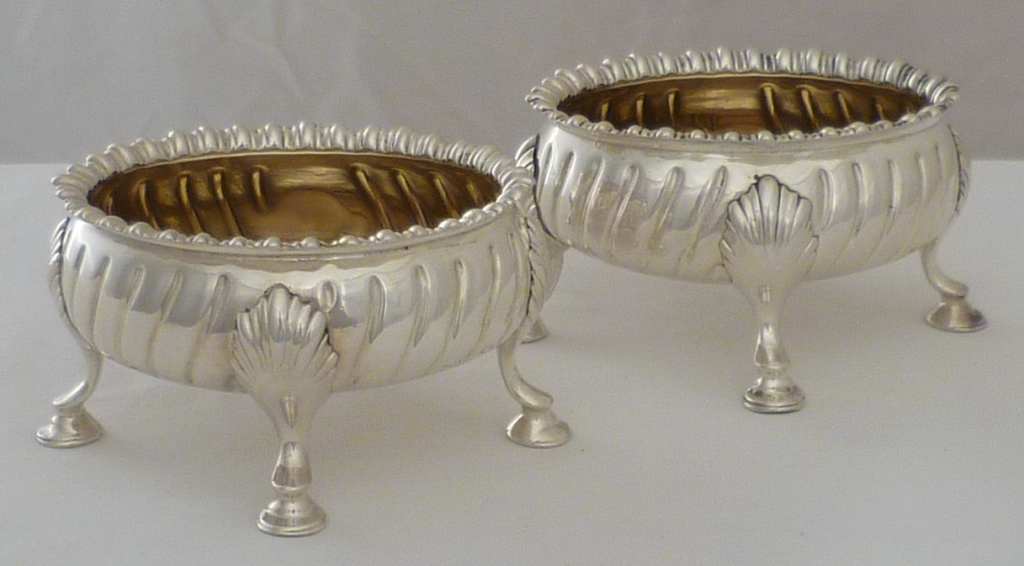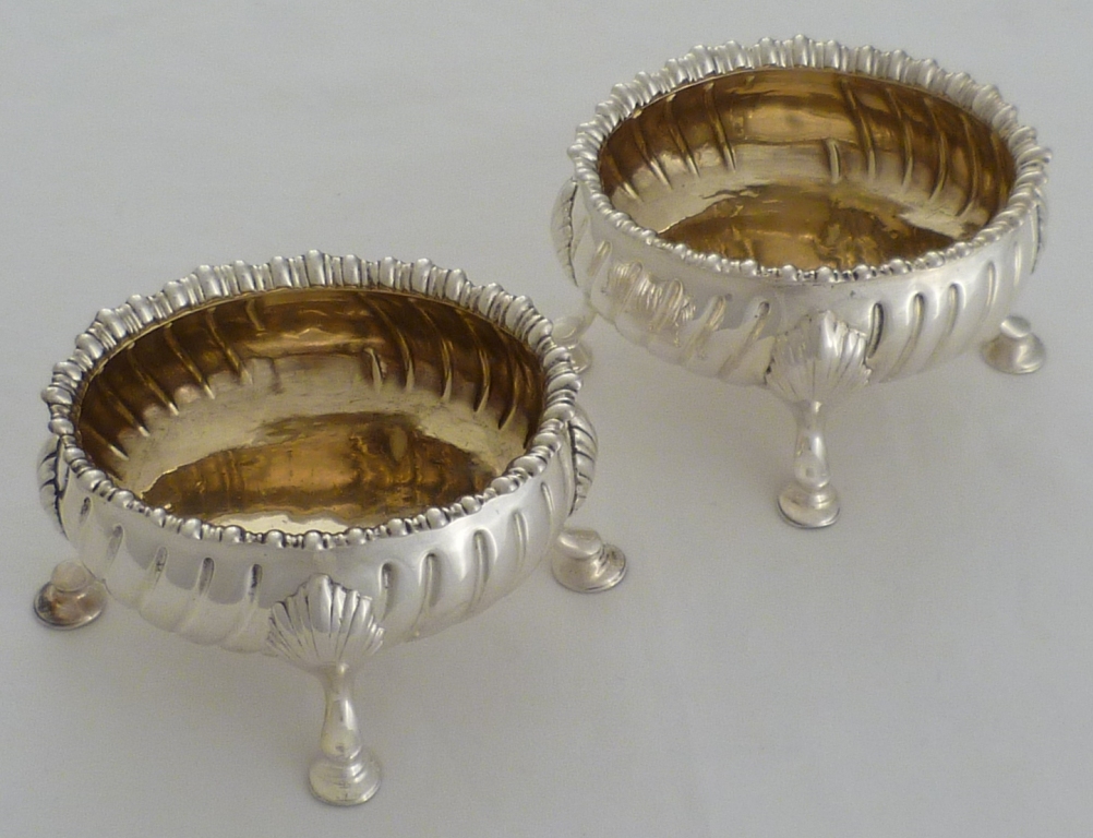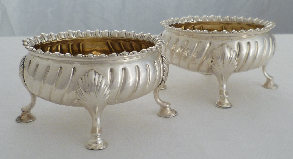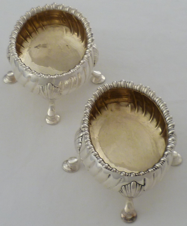 DESCRIPTION | Good and useful pair of oval Georgian silver salts with fully gilded interiors, four shell capped hoof feet, fluted bodies and wavy gadroon decorated top rims. The gilding protects the silver from corrosive action by the salt and negates the need for a glass liner. These are safe for food use. |