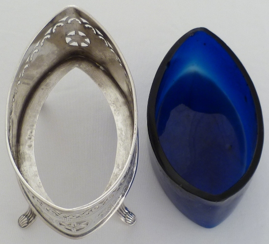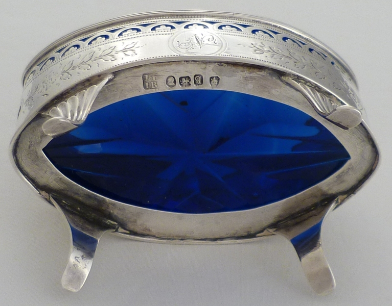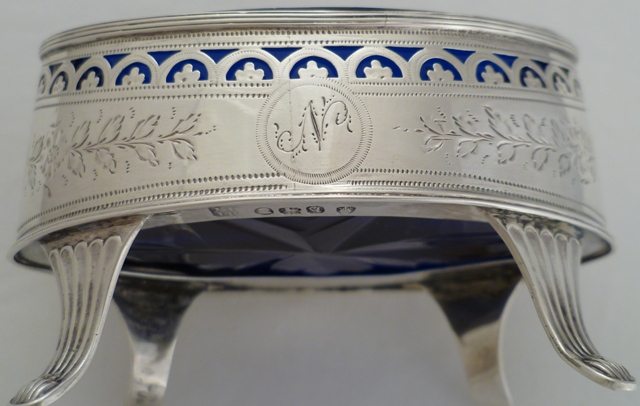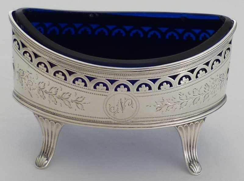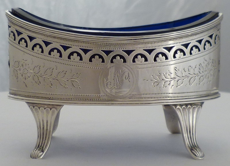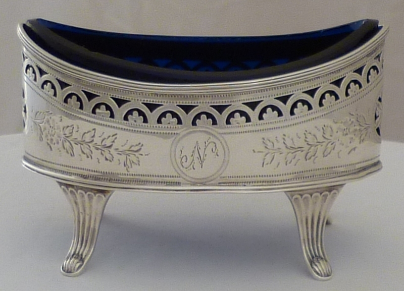 Good sized Georgian silver salt with pierced and engraved decoration, four fluted legs with shell capped feet and the original 'N' engraved to both cartouches. The custom made blue glass liner is an old but later replacement, has
