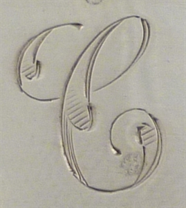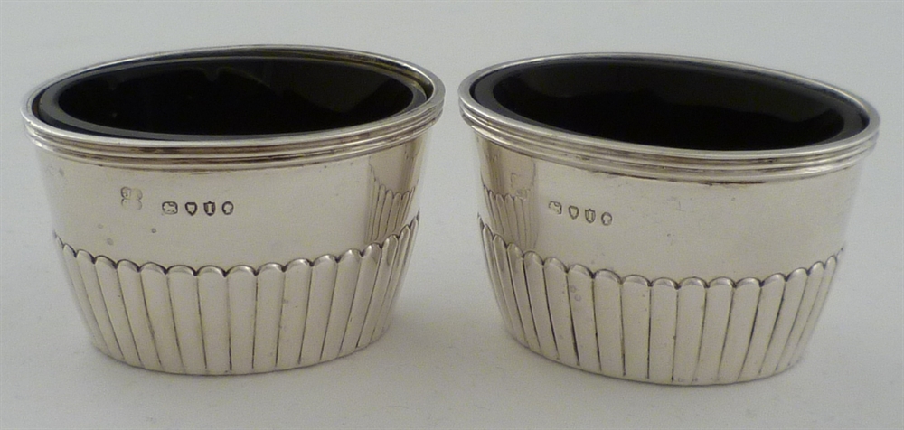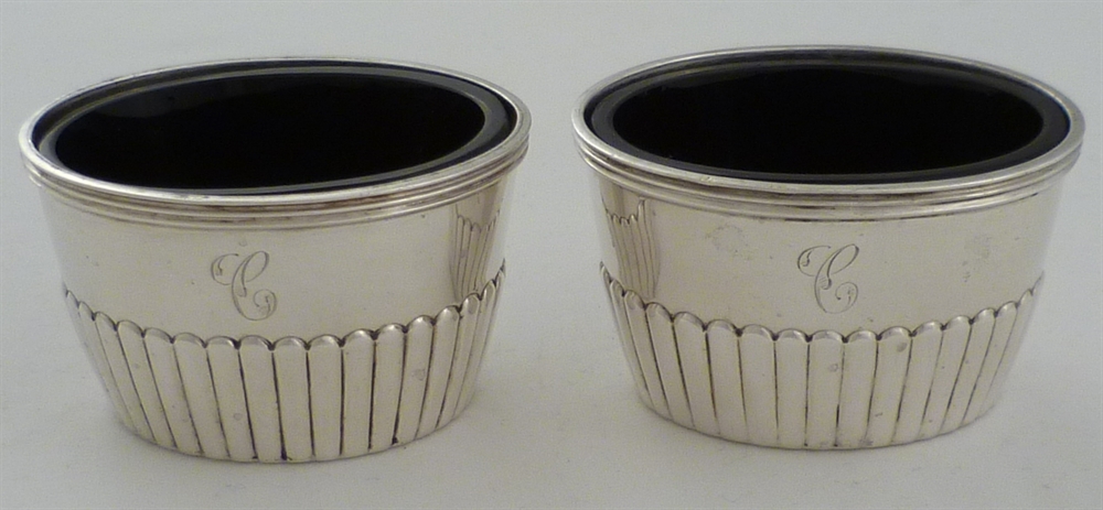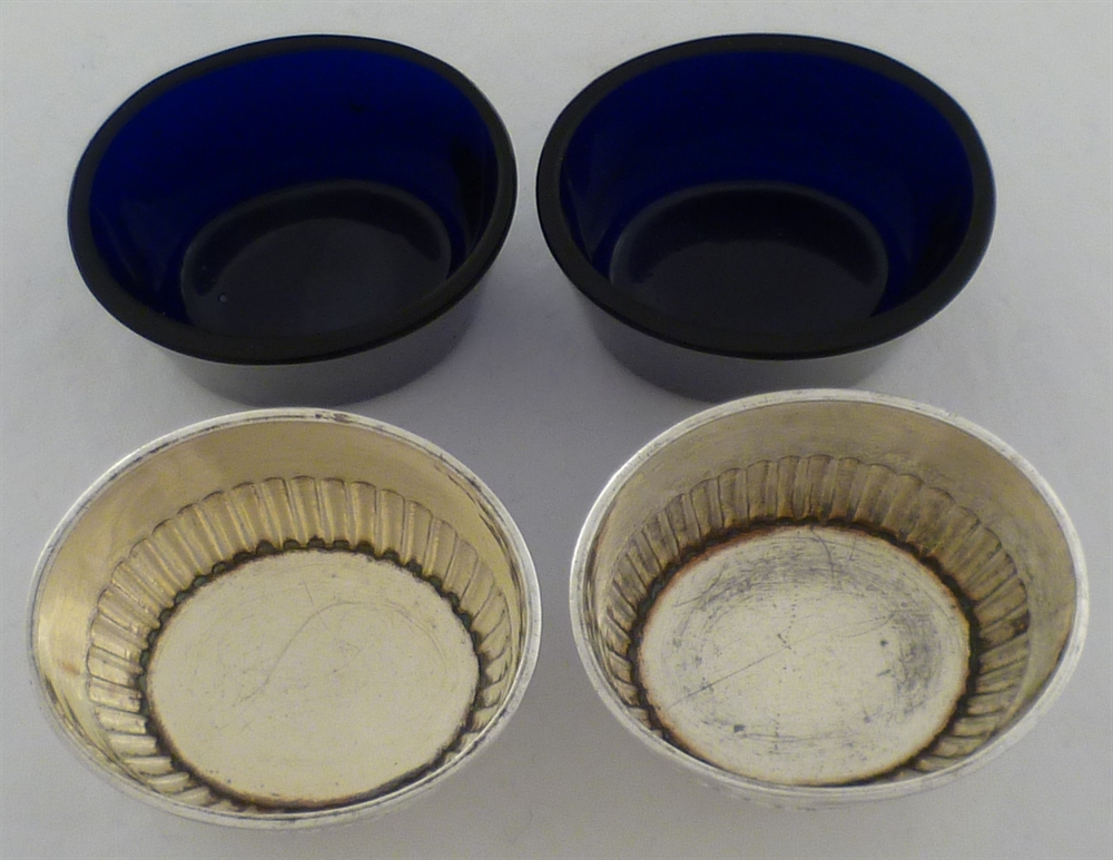 DESCRIPTION | Pair of Victorian silver salts with blue glass liners and initial engraved to one side 'C'. |