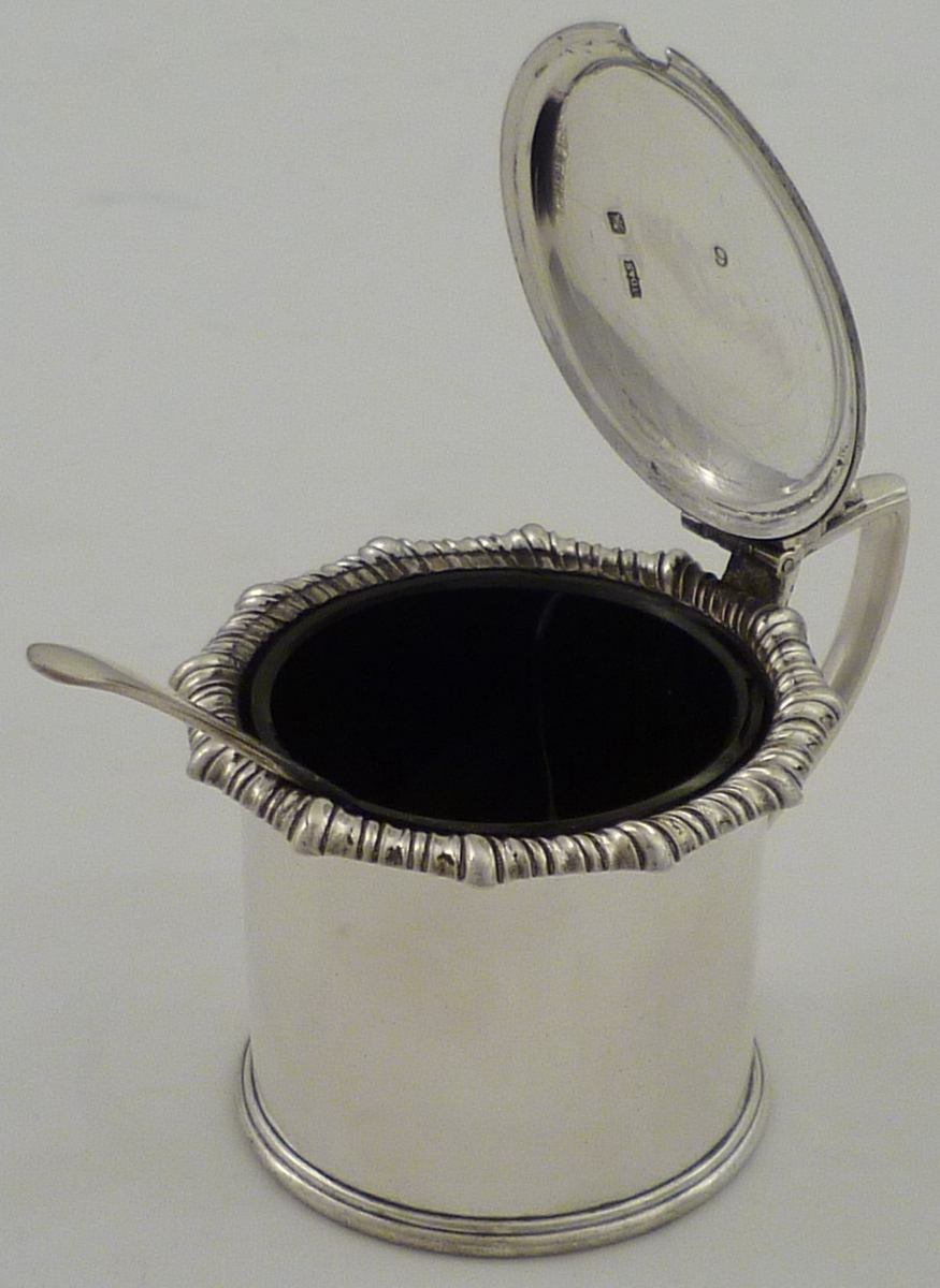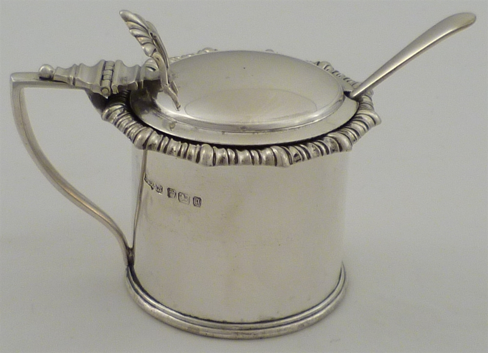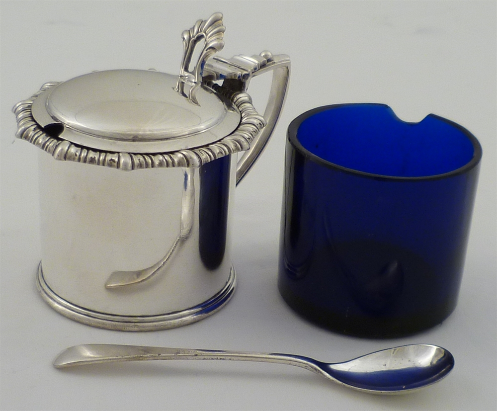DESCRIPTION | Good Victorian solid silver mustard pot with blue glass liner and silver plated spoon. |