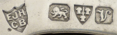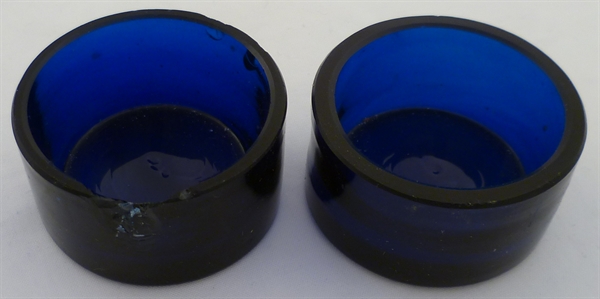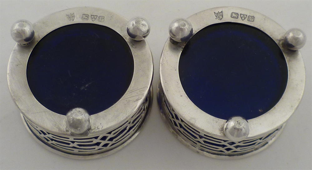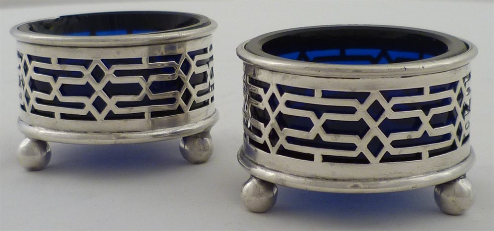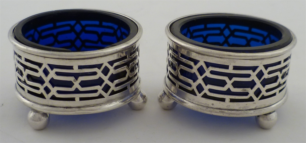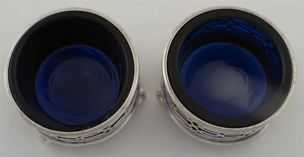 DESCRIPTION | Pair of pierced silver salts with blue glass liners. |
